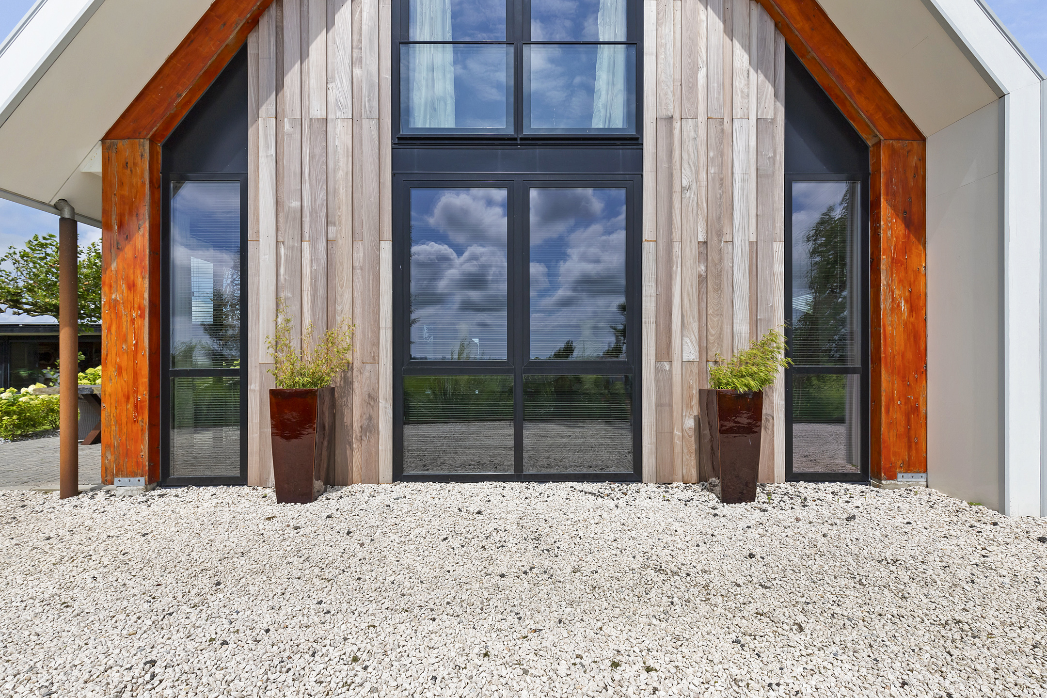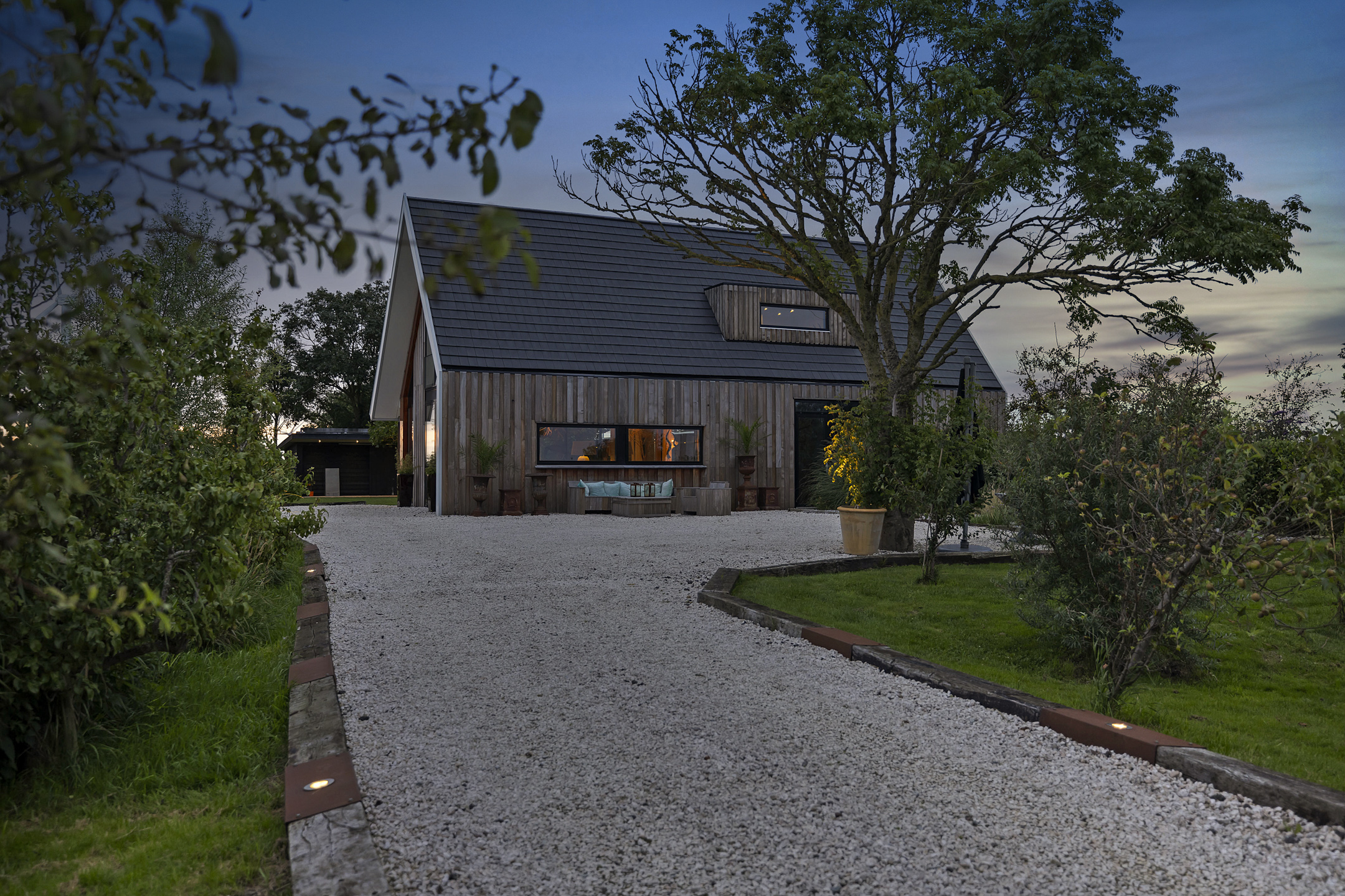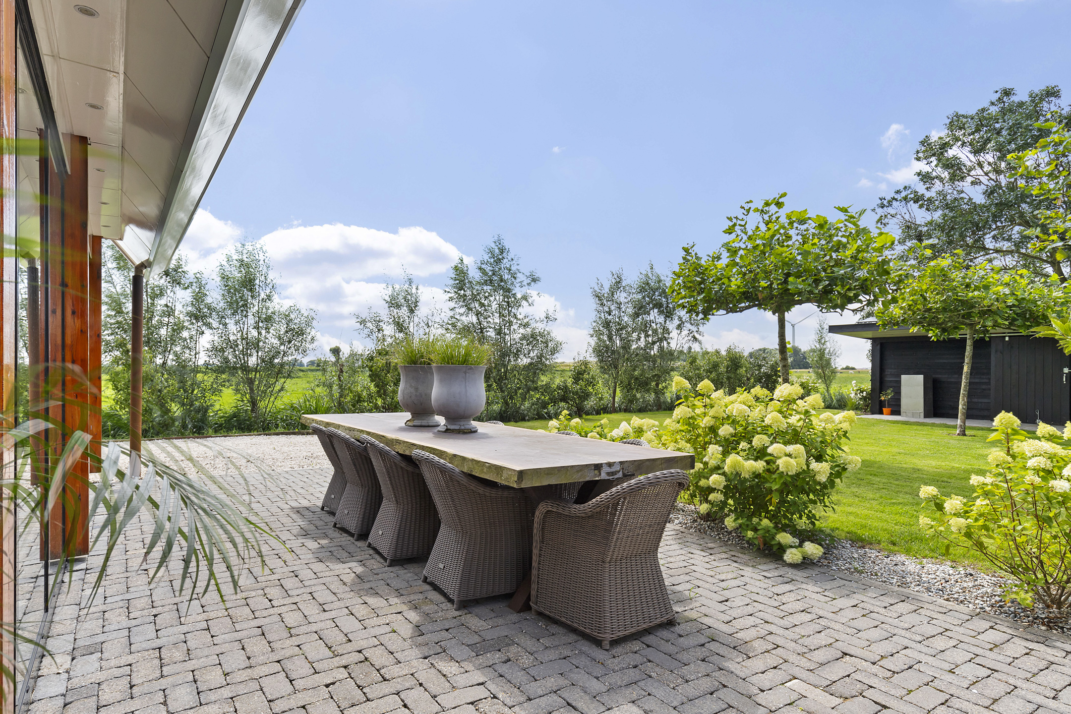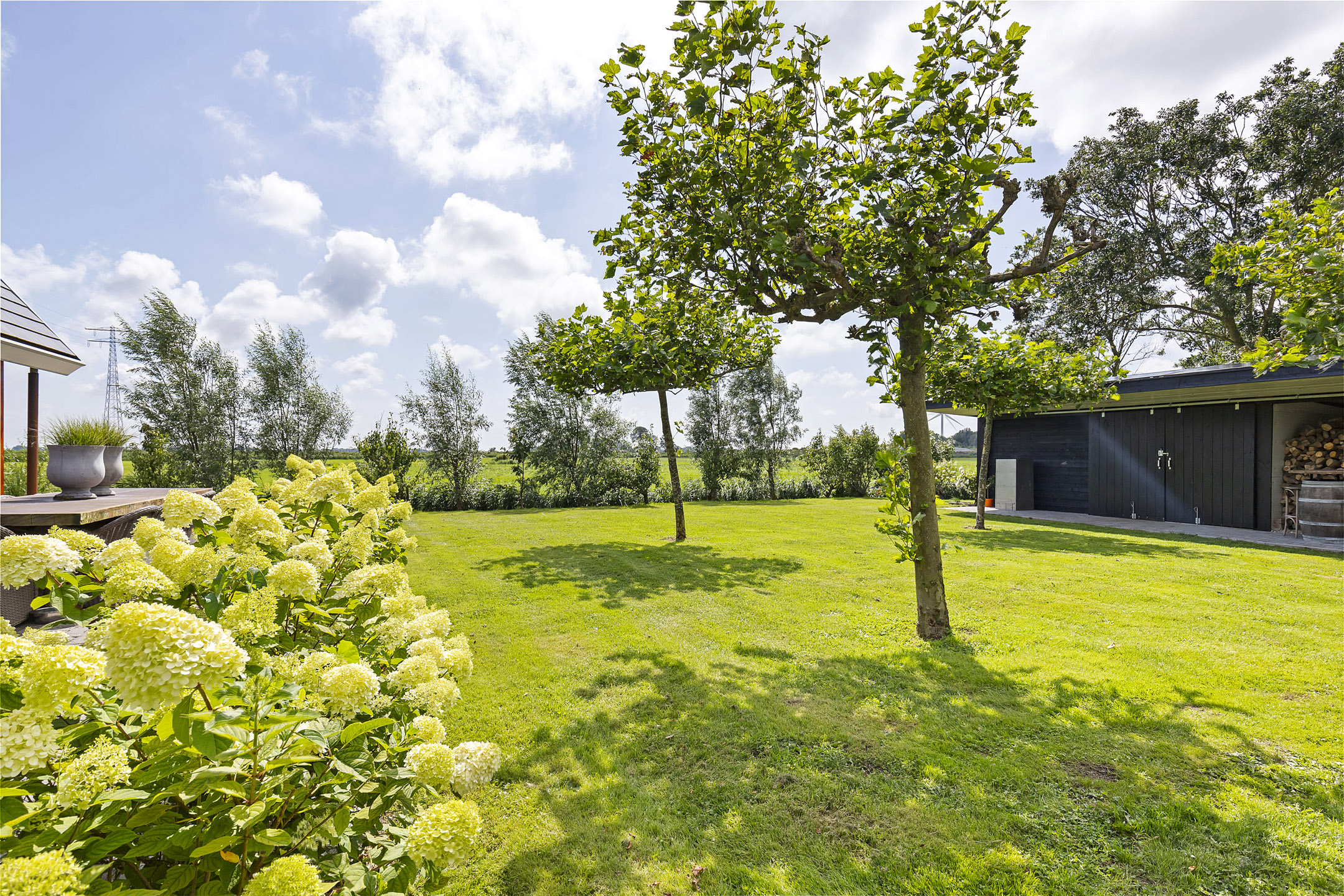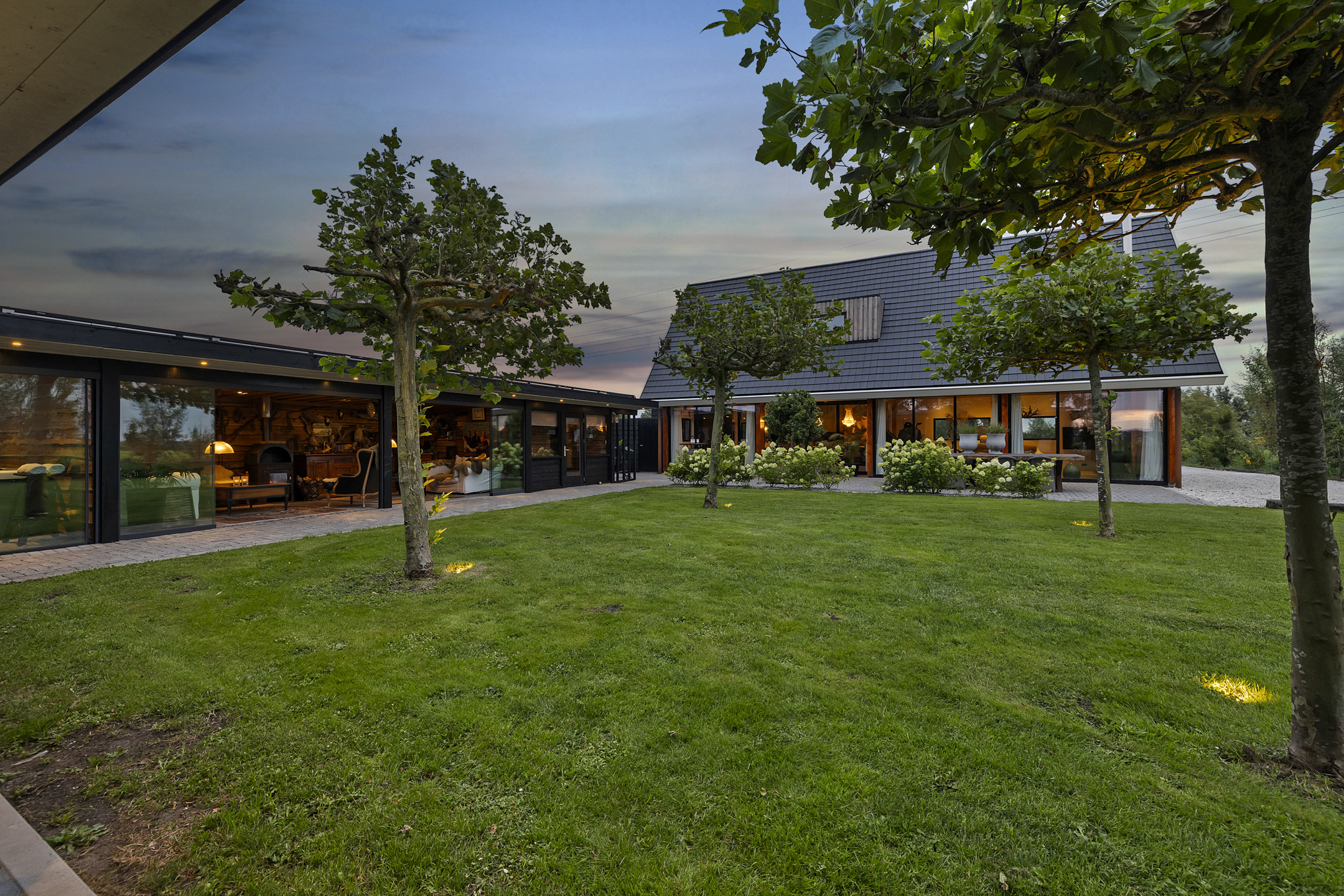 The driveway to the house, garages, and stable is covered with gravel with flower borders edged with corten steel and garden lighting. There is ample parking on the property, both at the stables and the house, for multiple cars. The garden directly around the house has several terraces in sun and shade, offering beautiful views from all angles over varying natural areas and the passing sailboats, pleasure yachts, and commercial vessels. The sheltered courtyard garden with the 4 linden trees, beautiful lighting, and outdoor kitchen offers the utmost privacy. There are many types of fruit trees, berry bushes, shrubs, and flower borders in the garden. The over 1.7 ha meadow, bordered by a ditch, has two access points and is located directly behind the stables along the Van Harinxmakanaal. In the current situation, the horses graze on the plot behind the house, but in the new situation, due to land consolidation, this will change to the front (canal and view side) of the house. The 20x40 riding arena is well-drained and equipped with a soft surface and lighting.