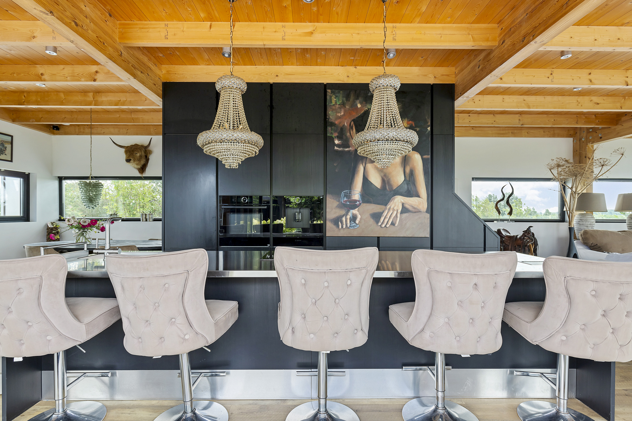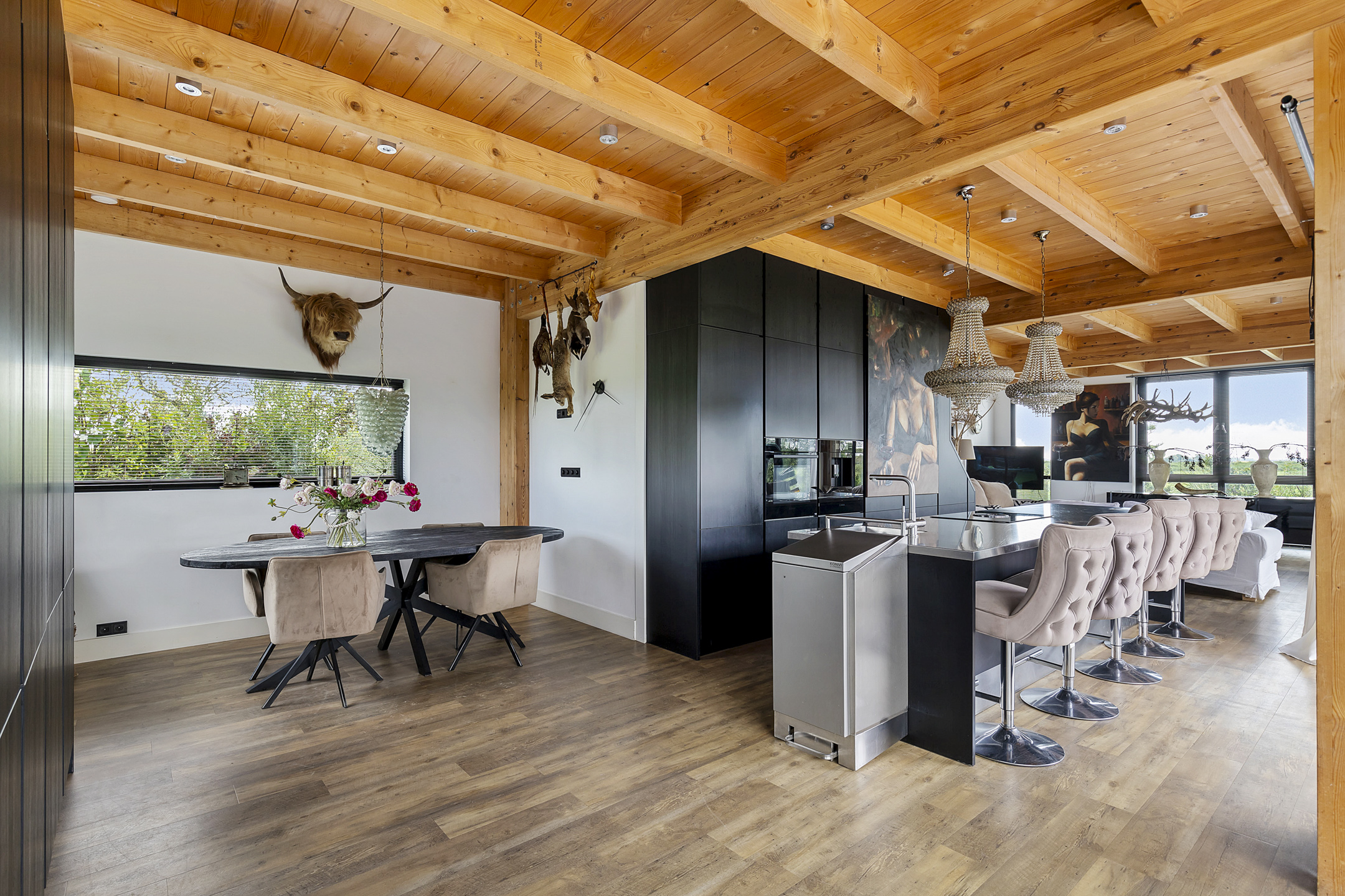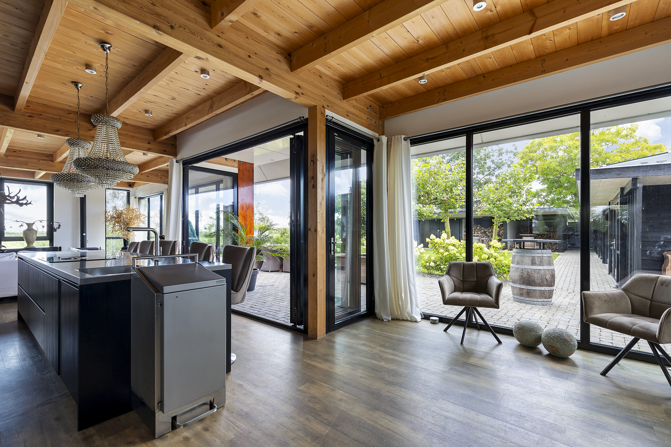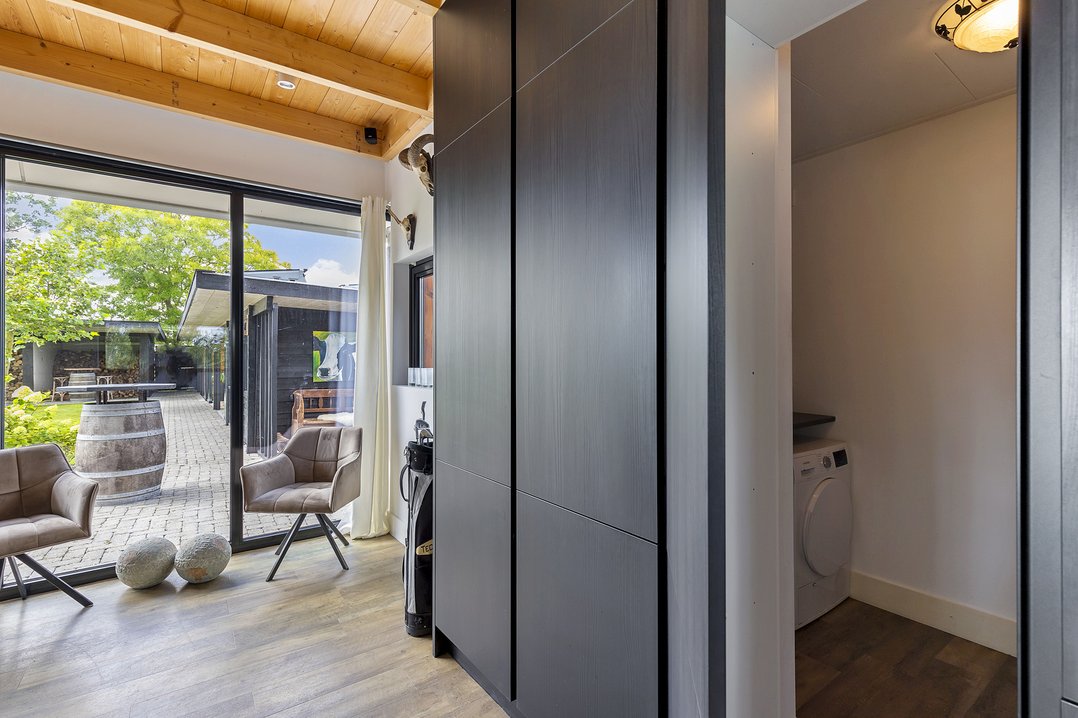The open living kitchen is a joy in itself—a place where there is often a lot of socializing while cooking. The open glass accordion sliding doors to the indoor terrace are almost always open, thanks to the sheltered location created by the surrounding outbuildings. This way, the garden is fully integrated into the indoor living space. The kitchen has a sturdy stainless steel cooking/washing island and is equipped with all luxuries; a large induction cooktop with integrated extraction, an extra-large sink with a boiling water tap, and the sleek black floor-to-ceiling cabinet wall houses an integrated coffee machine and combi-oven. The utility room, with connections for washing appliances, is tastefully hidden in the extension behind a cabinet wall in the same style as the kitchen.
