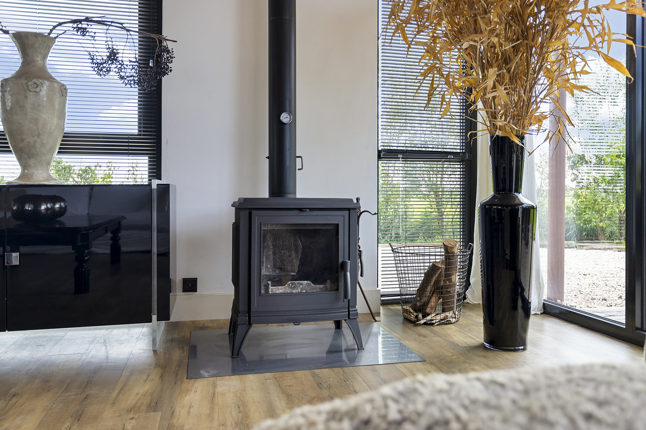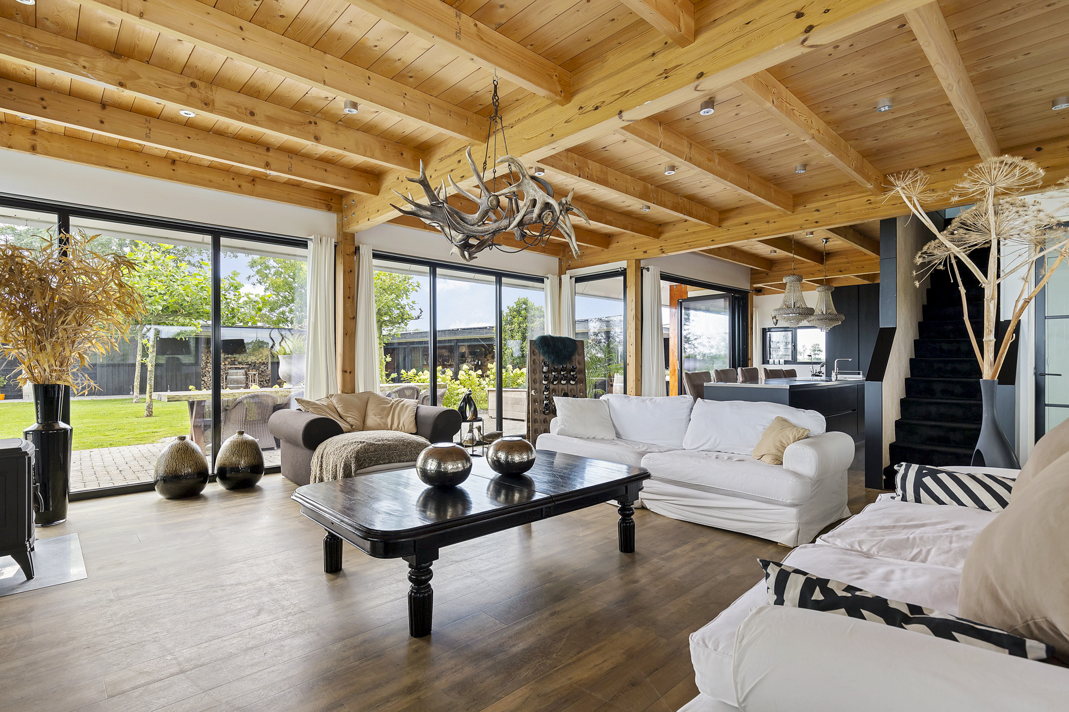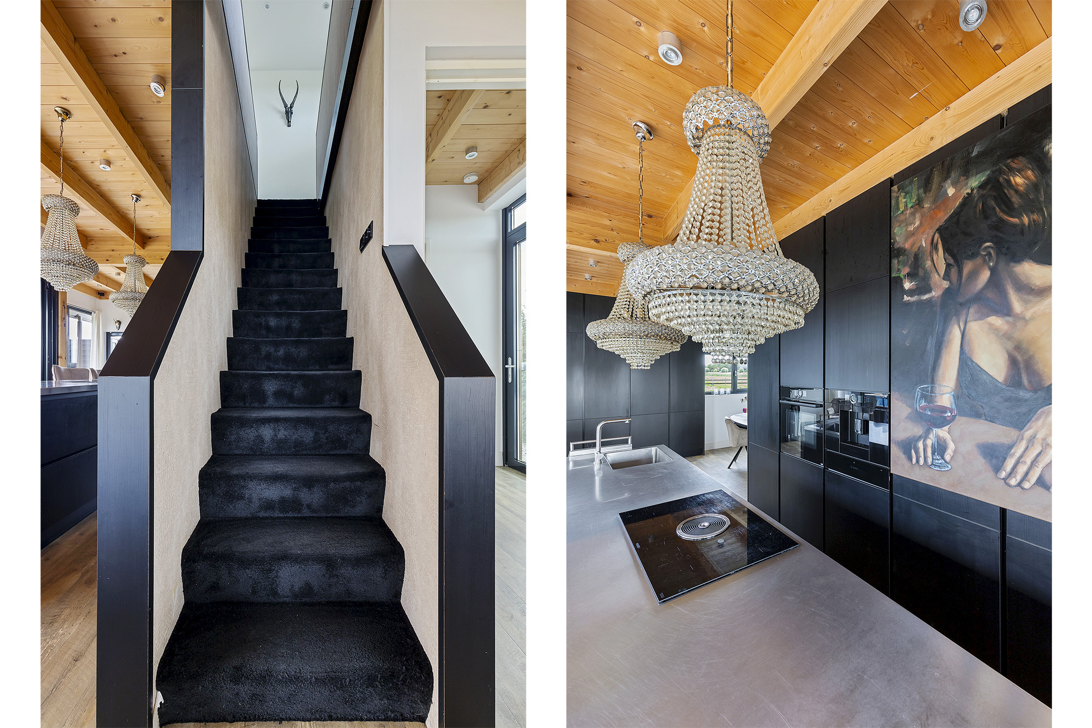 The open living kitchen is a joy in itself—a place where there is often a lot of socializing while cooking. The open glass accordion sliding doors to the indoor terrace are almost always open, thanks to the sheltered location created by the surrounding outbuildings. This way, the garden is fully integrated into the indoor living space. The kitchen has a sturdy stainless steel cooking/washing island and is equipped with all luxuries; a large induction cooktop with integrated extraction, an extra-large sink with a boiling water tap, and the sleek black floor-to-ceiling cabinet wall houses an integrated coffee machine and combi-oven. The utility room, with connections for washing appliances, is tastefully hidden in the extension behind a cabinet wall in the same style as the kitchen.