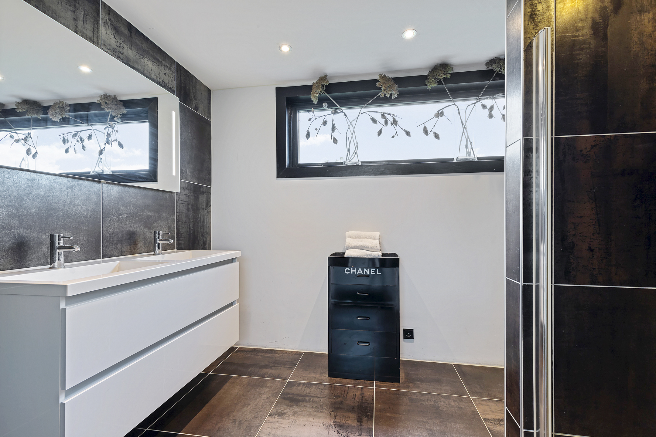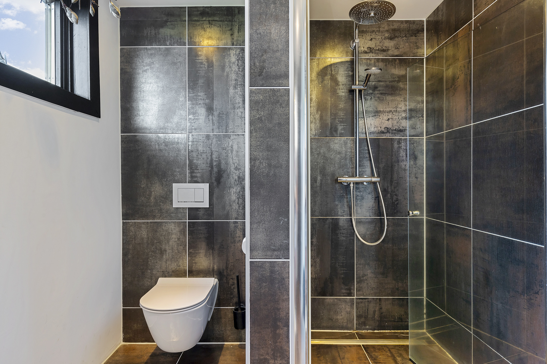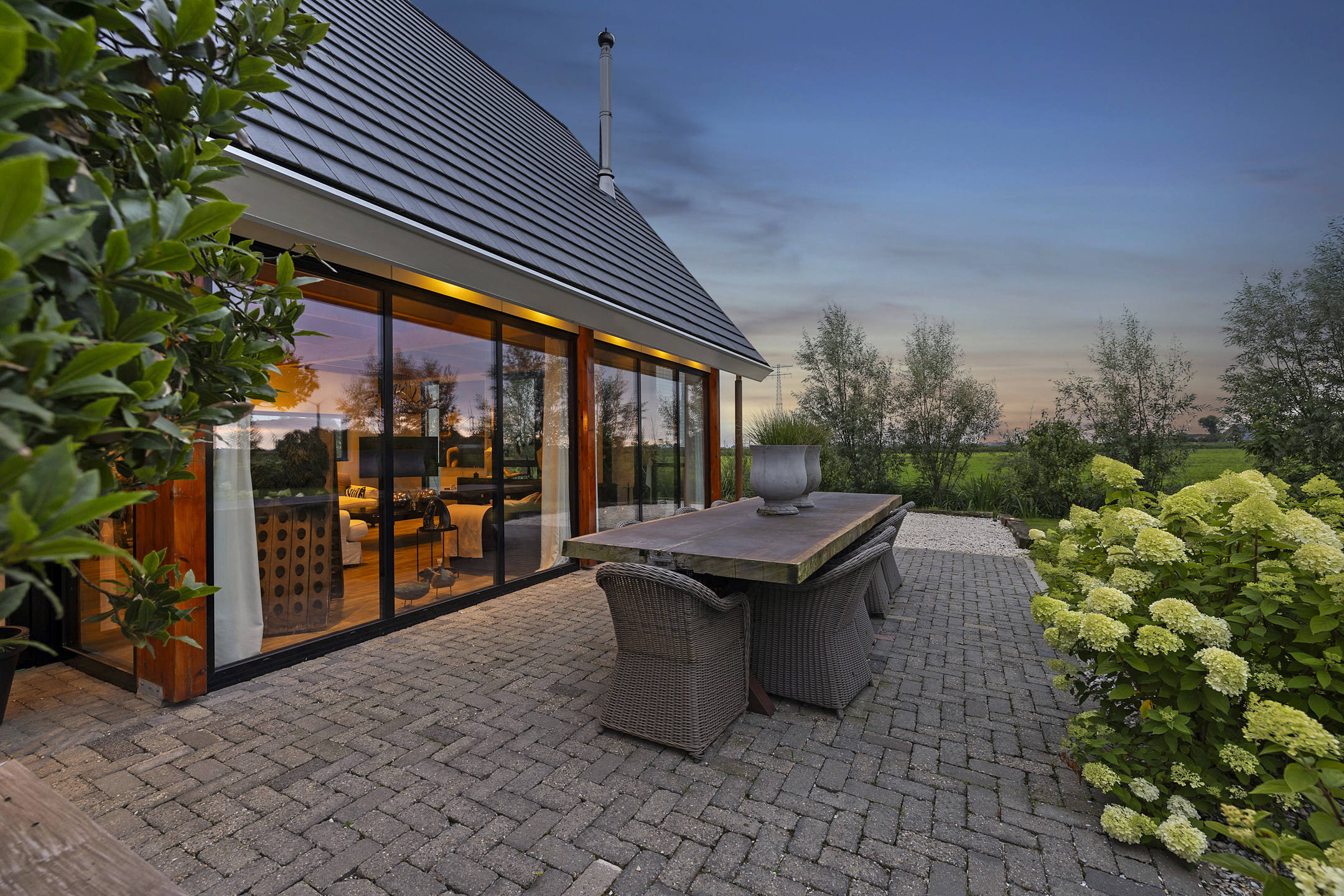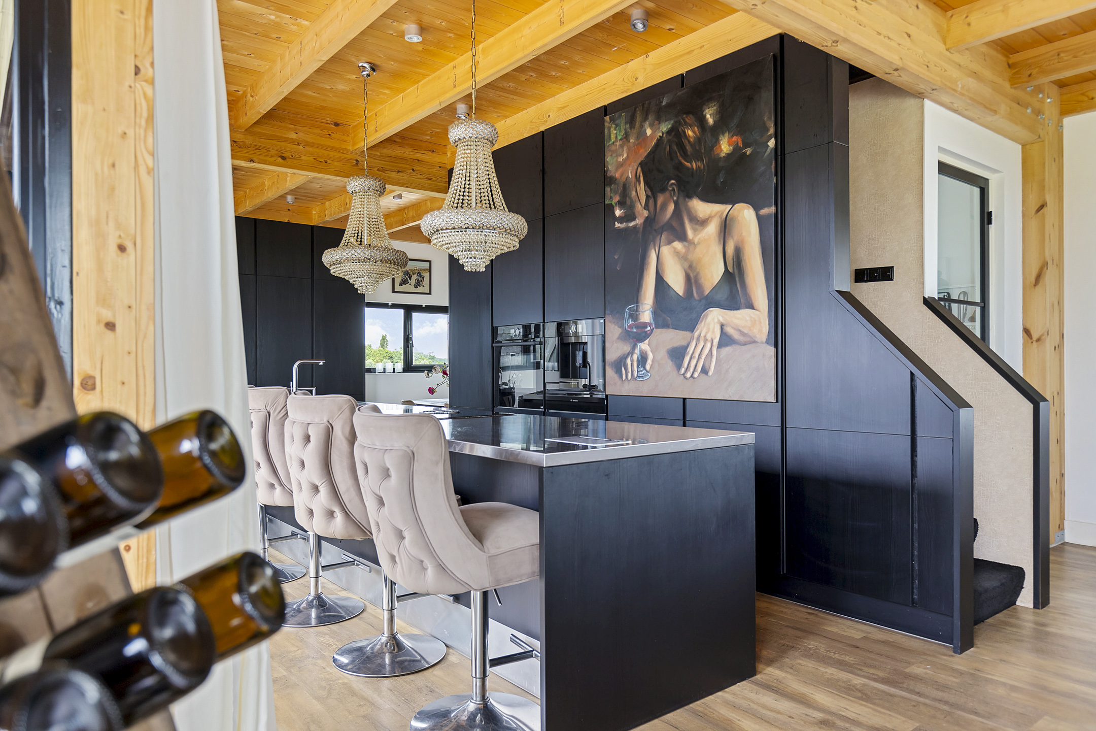 The open living kitchen is a joy in itself—a place where there is often a lot of socializing while cooking. The open glass accordion sliding doors to the indoor terrace are almost always open, thanks to the sheltered location created by the surrounding outbuildings. This way, the garden is fully integrated into the indoor living space. The kitchen has a sturdy stainless steel cooking/washing island and is equipped with all luxuries; a large induction cooktop with integrated extraction, an extra-large sink with a boiling water tap, and the sleek black floor-to-ceiling cabinet wall houses an integrated coffee machine and combi-oven. The utility room, with connections for washing appliances, is tastefully hidden in the extension behind a cabinet wall in the same style as the kitchen.
