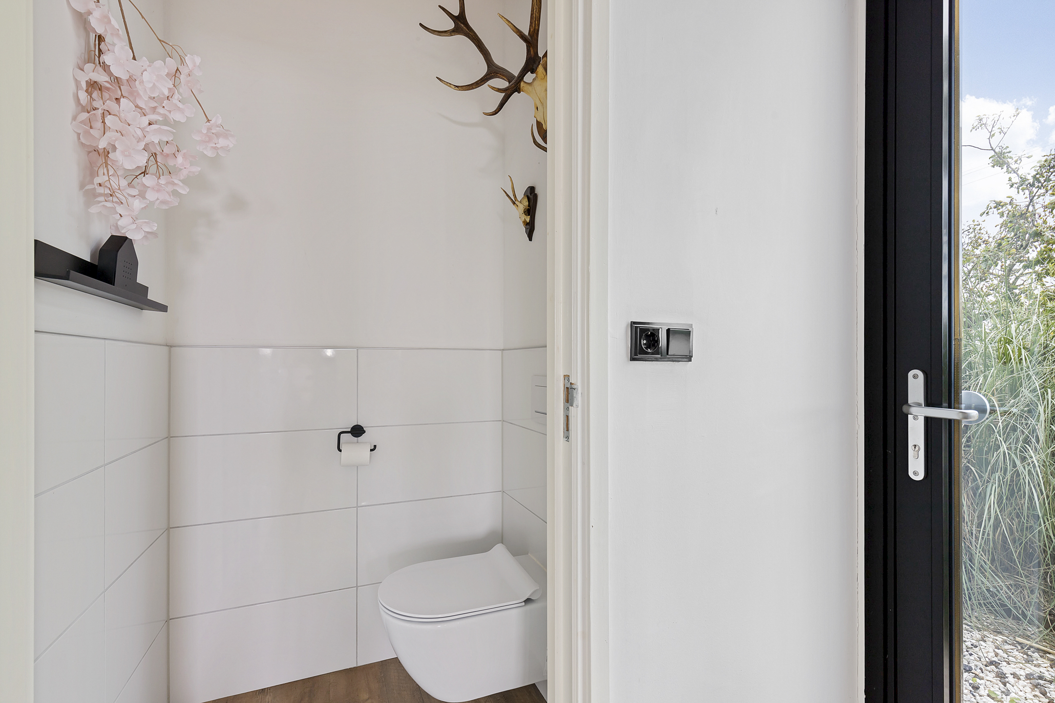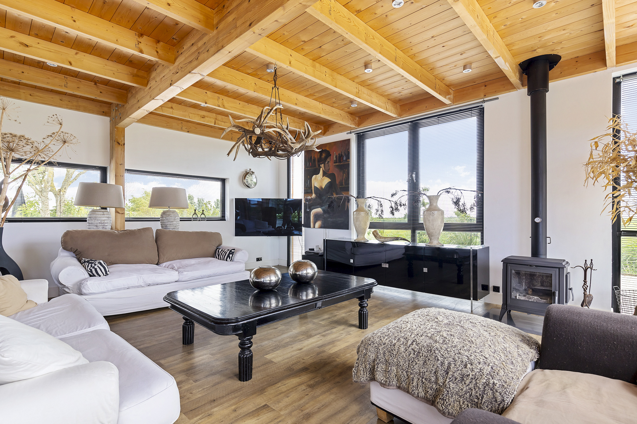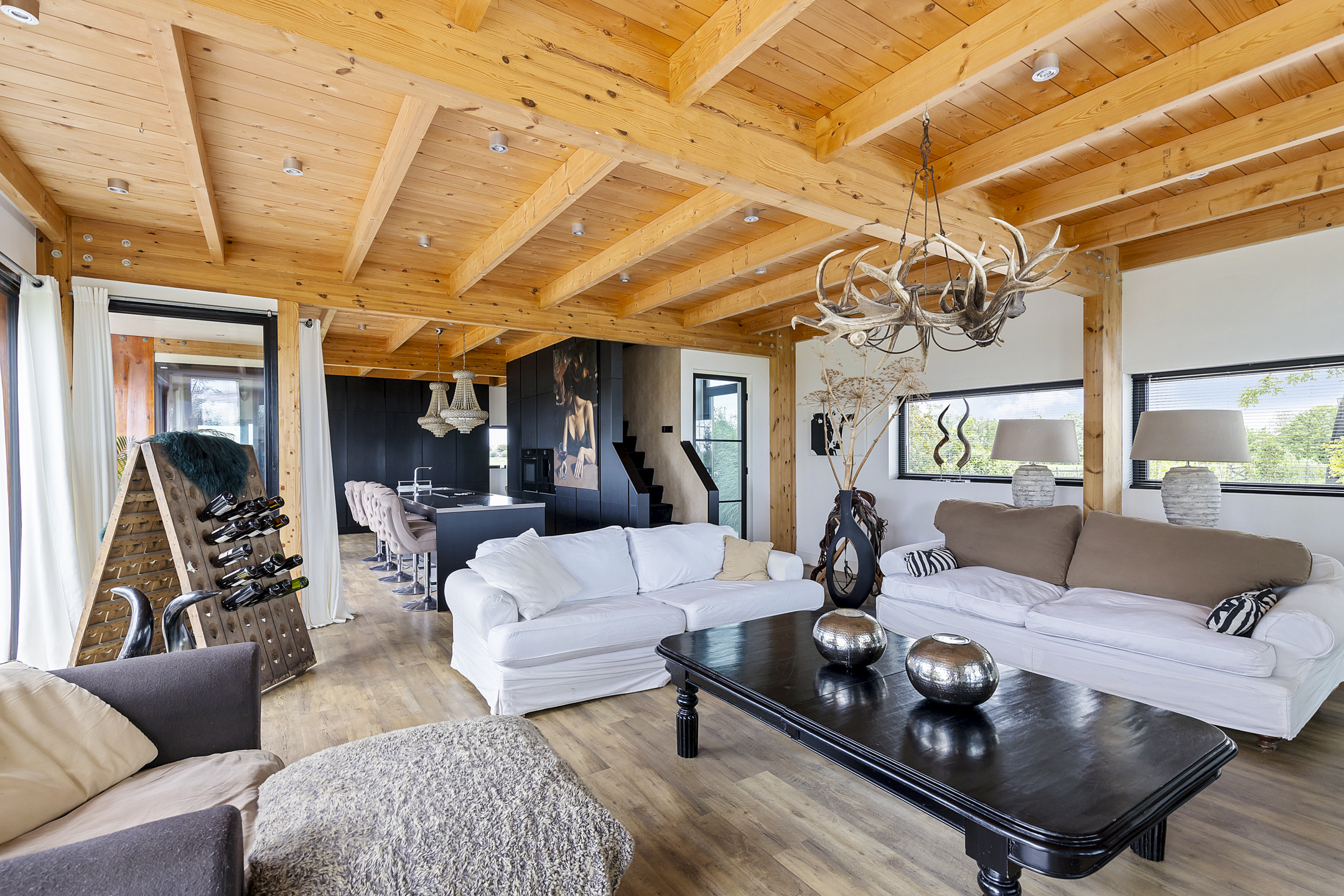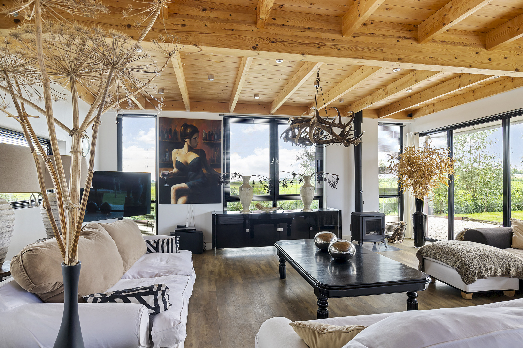 The entrance of the house is located on the east side, with space for a wardrobe in the hallway, which also provides access to the guest toilet. The living room is situated on the sunny southwest side of the house. When you enter this bright space, you immediately feel at home. This is due to the charming high wooden ceilings with beautiful heavy beams, the cozy lounge area by the wood stove, and the floor-to-ceiling windows offering endless views of the nature; the stylish garden, the fruit trees, the animals in the meadow, the wildlife around the house, and the ever-changing Frisian skies. There is no traffic here!