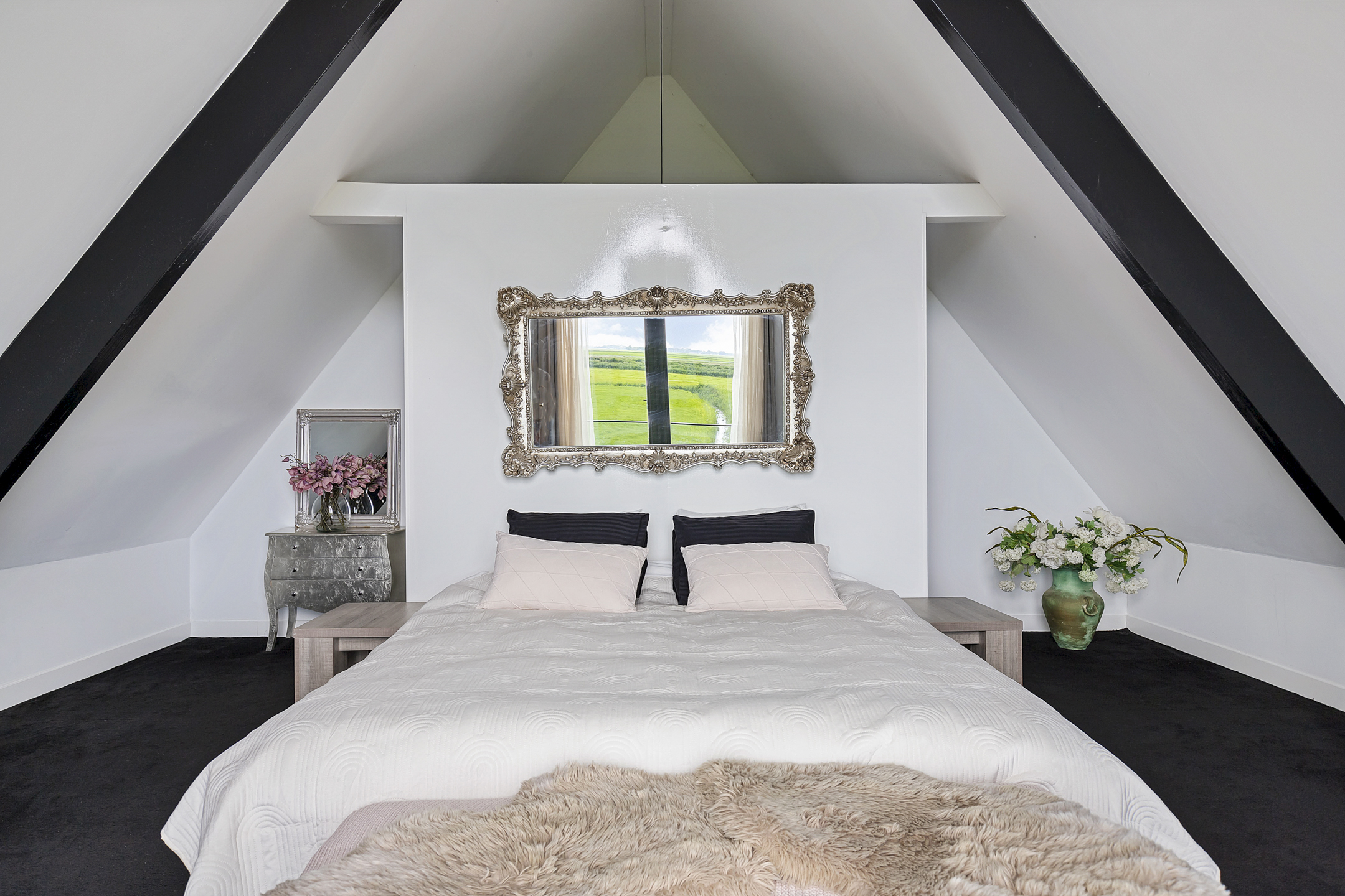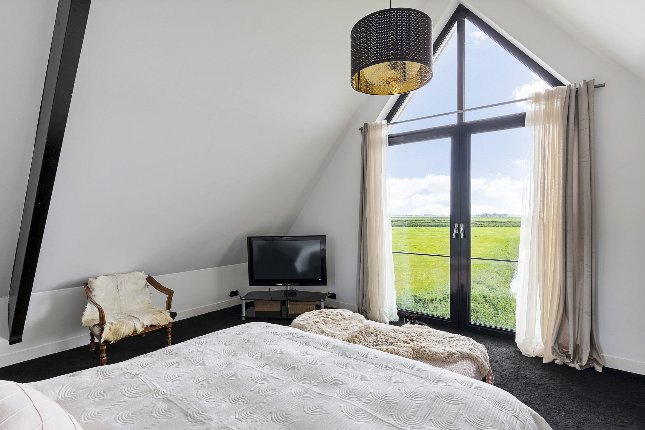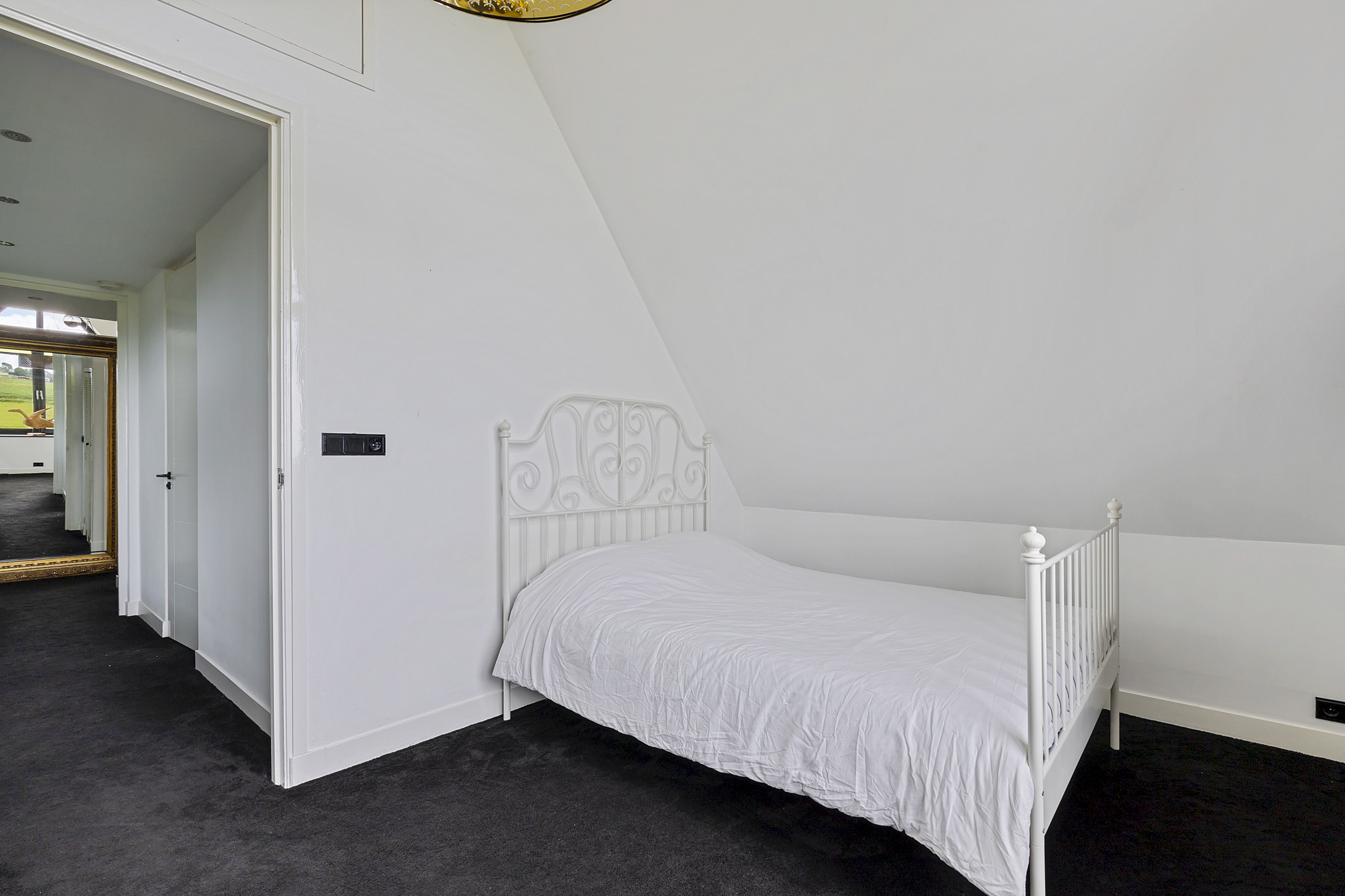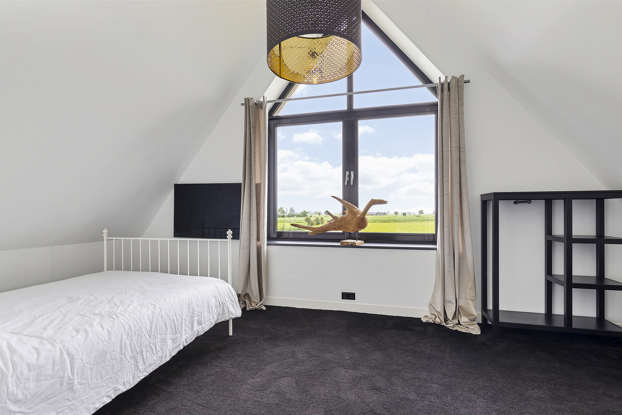 The landing provides access to two spacious bedrooms, a bathroom, and plenty of storage space under the eaves on the landing. The charming, spacious master bedroom with two walk-in closets under the sloping roof is located on the south side and has floor-to-ceiling windows with a French balcony, overlooking the green meadows with the Van Harinxmakanaal beyond. Here you wake up happy, energized, and ready to start the day. The chic bathroom with stylish Italian tiles has a slightly elevated window in the wide dormer. The bathroom features a walk-in shower, toilet, and washbasin cabinet. The second spacious bedroom is located on the northeast side and offers a beautiful view of the green meadow landscape.