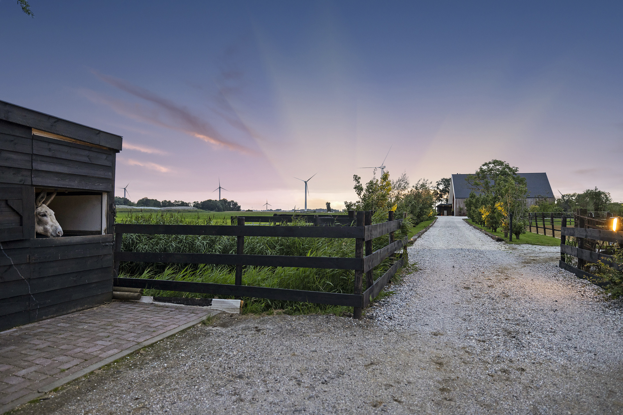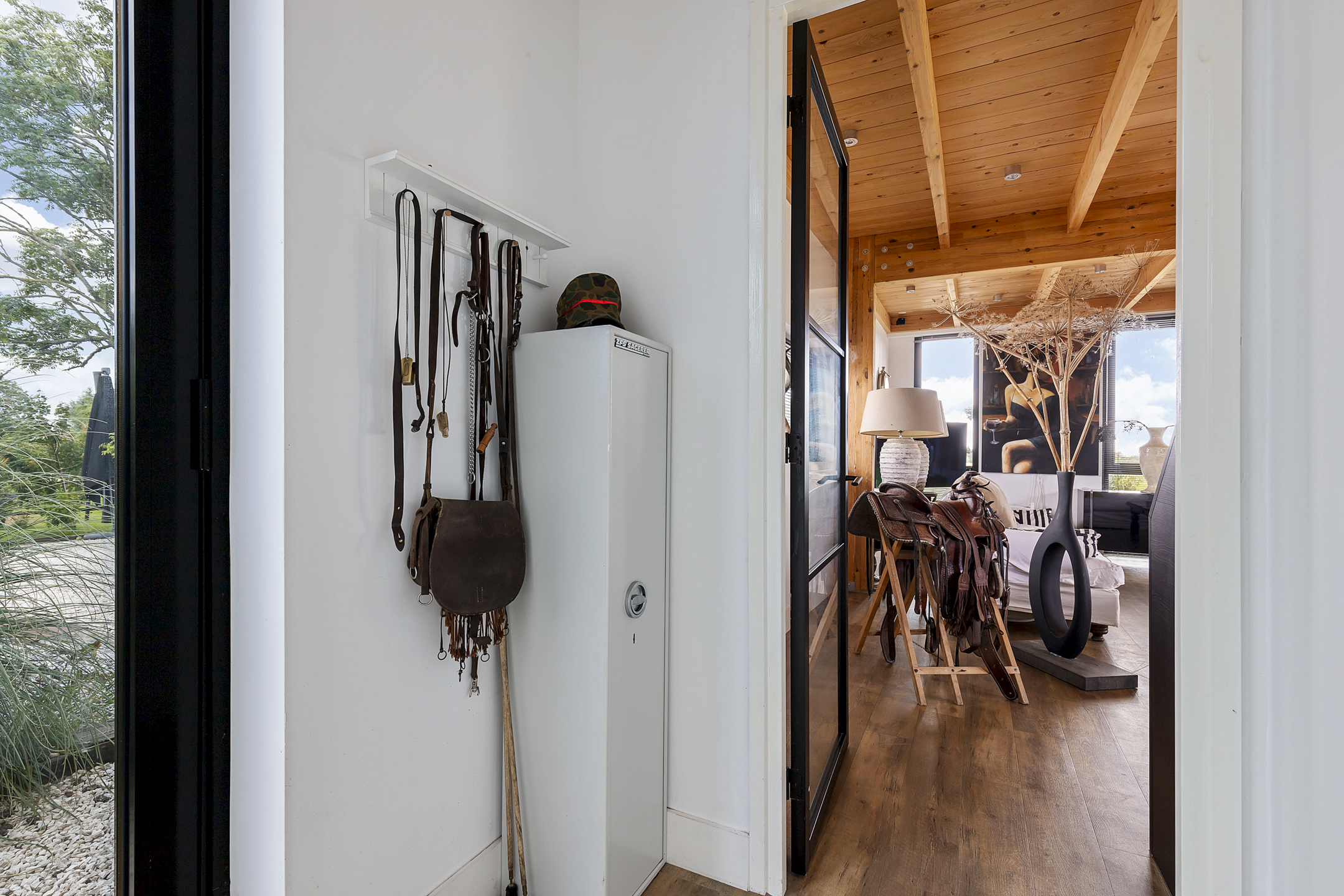 The tranquility and privacy in the middle of greenery and the natural experience around this home are indescribable but can certainly be felt. A literally hidden spot, next to the Van Harinxmakanaal, where you can see the masts of boats passing by in the distance from the house as a silent witness. The peace is at most interrupted by the braying of a donkey, the neighing of a horse, and a dog chasing a flying pheasant. The sunrise through the misty haze, where your horse happily greets you during the first feeding early in the morning, and you take a walk with your dog unnoticed in your pajamas around your own domain. The kids launch the boat into the water for a short trip to the center of Harlingen for a cozy lunch. Enjoy the sauna and jacuzzi as you watch the red sun set into the water. In the summer, with the glass doors open, and in the winter, cozying up with friends by the wood-burning stove in the hunting lodge; this oasis offers everything for the perfect home, making you never want to leave.