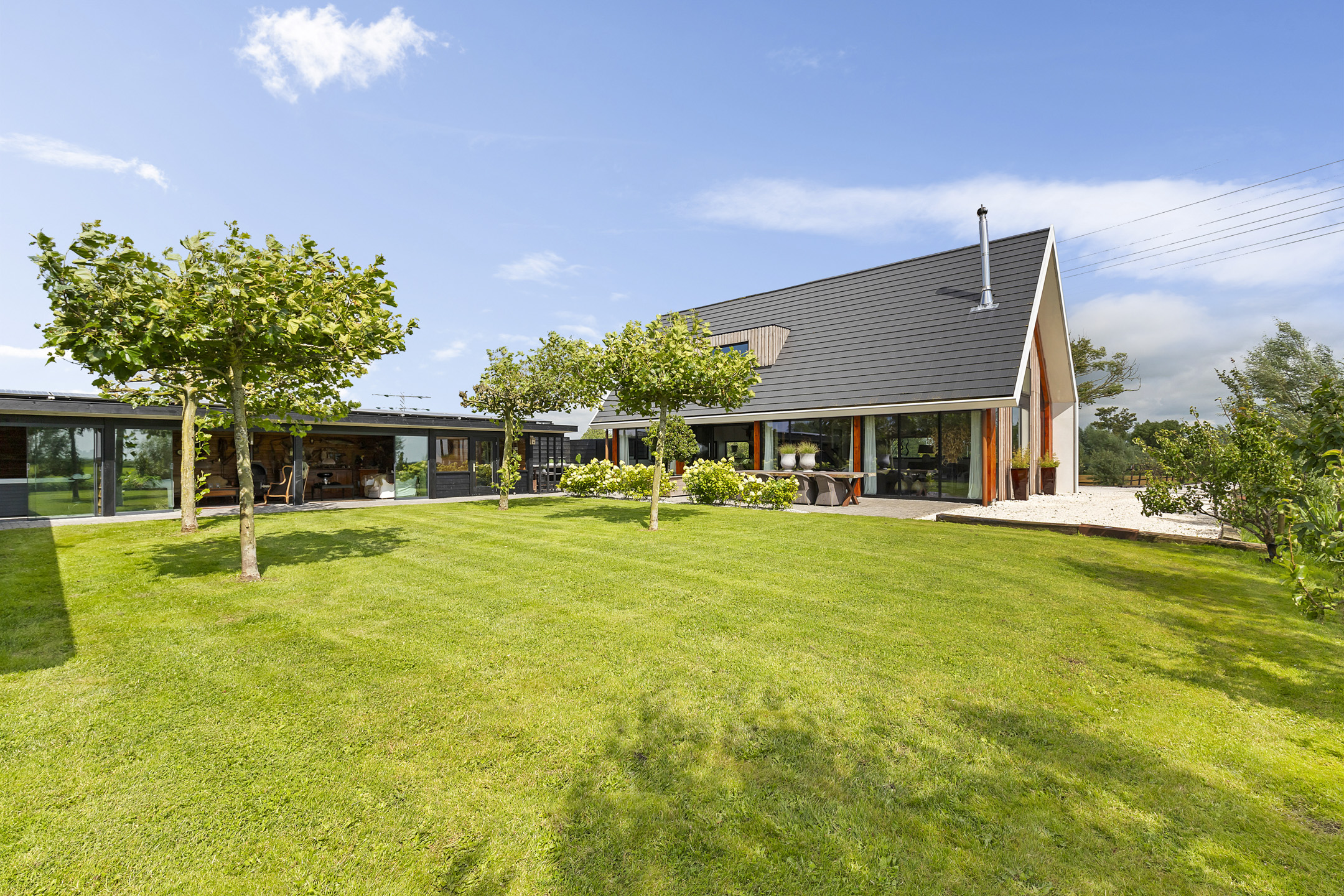 The charming, fully insulated, nearly energy-neutral home was built in 2019. Sustainable and low-maintenance materials such as IPE hardwood cladding, luxurious wide overhangs, 40 solar panels, a heat pump, flat tiles, zinc, and plastic were used. Privacy, relaxation, and a connection to nature were the main focus in the design. The stylish black-stained outbuildings, currently used as a sauna, wellness area, hunting lodge, wood storage, spacious insulated storage/workshop, stables, and equipment/boat storage, offer every possibility for maximum living enjoyment.