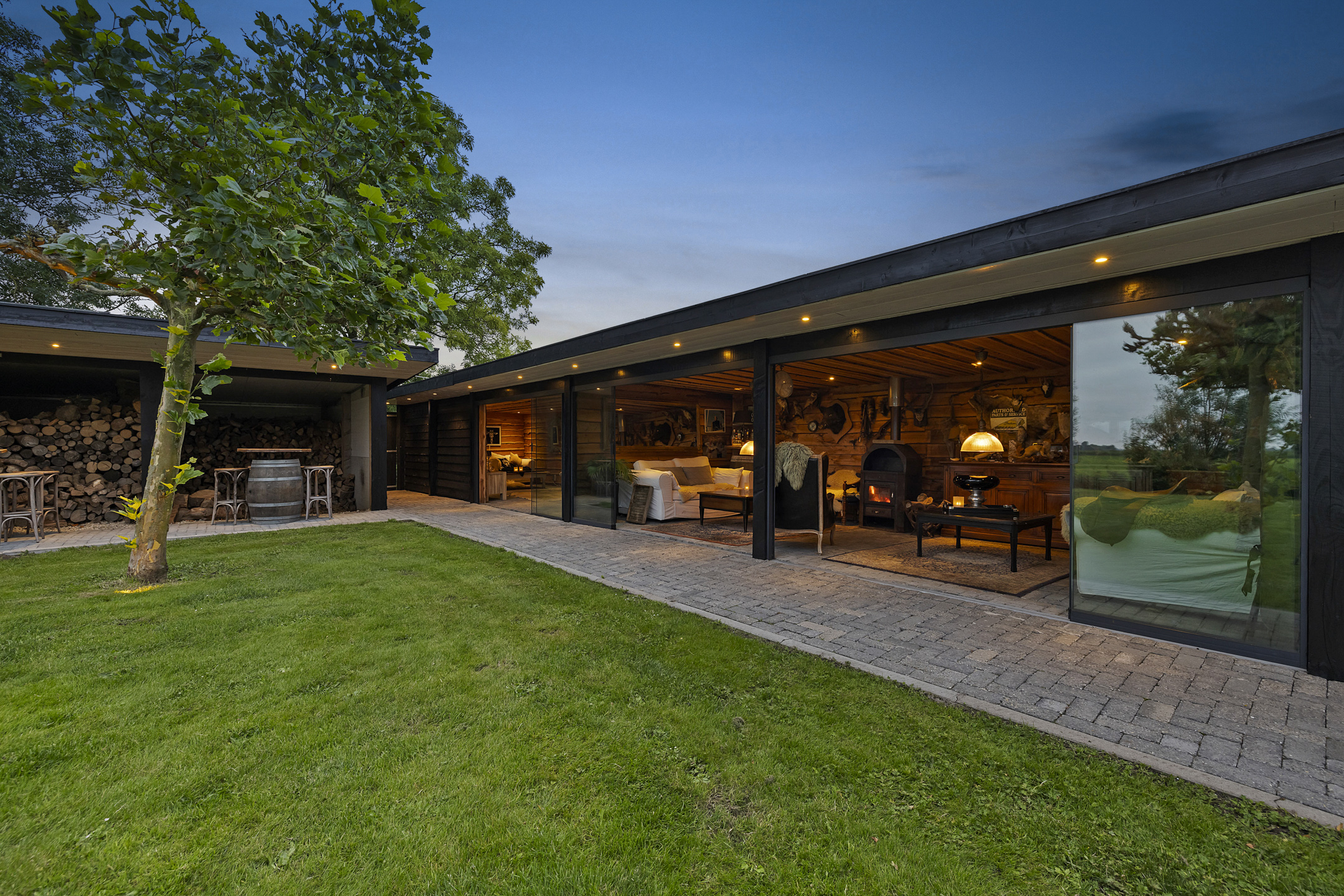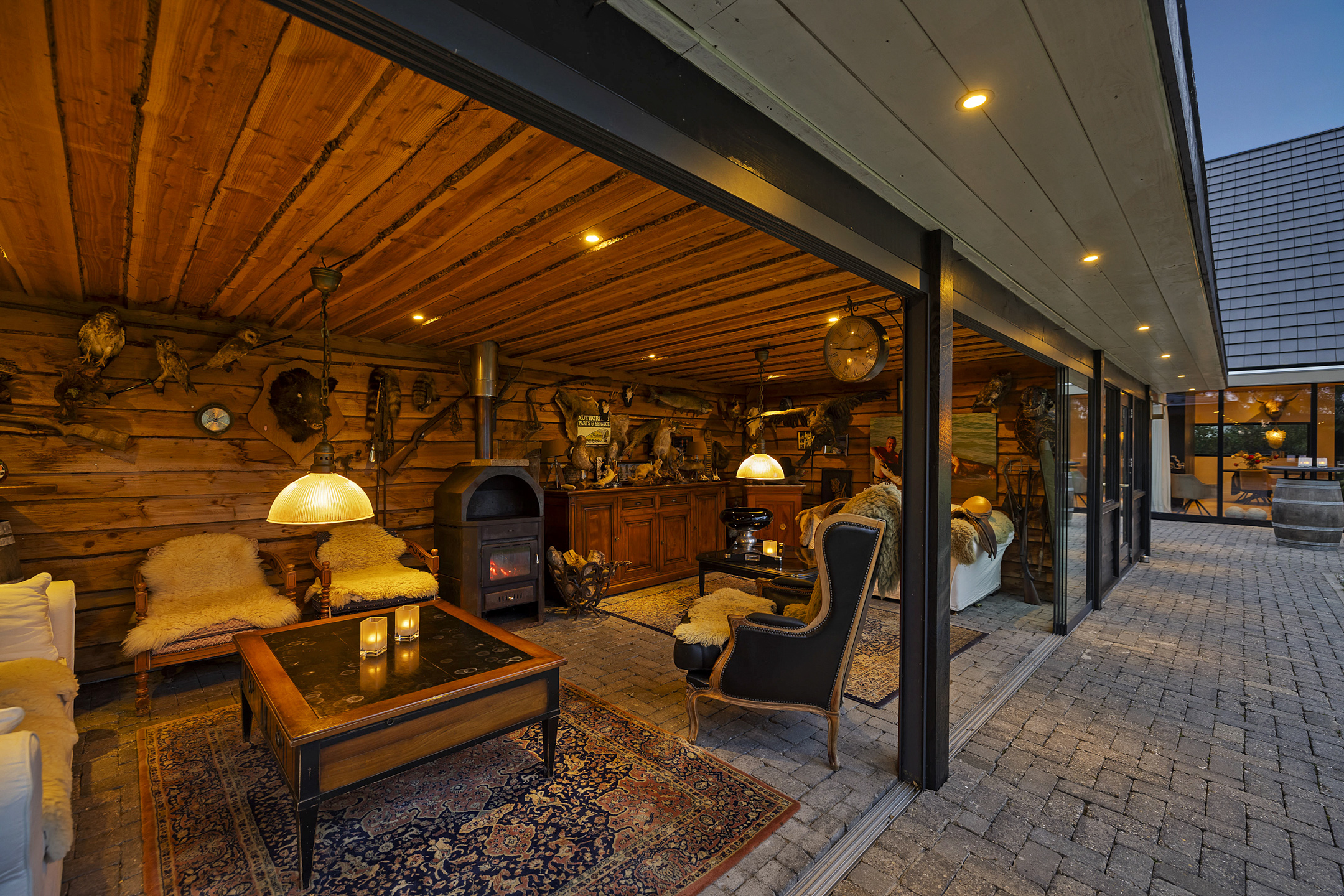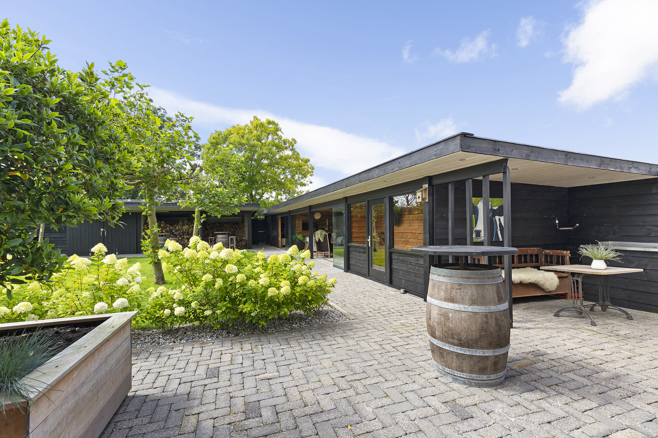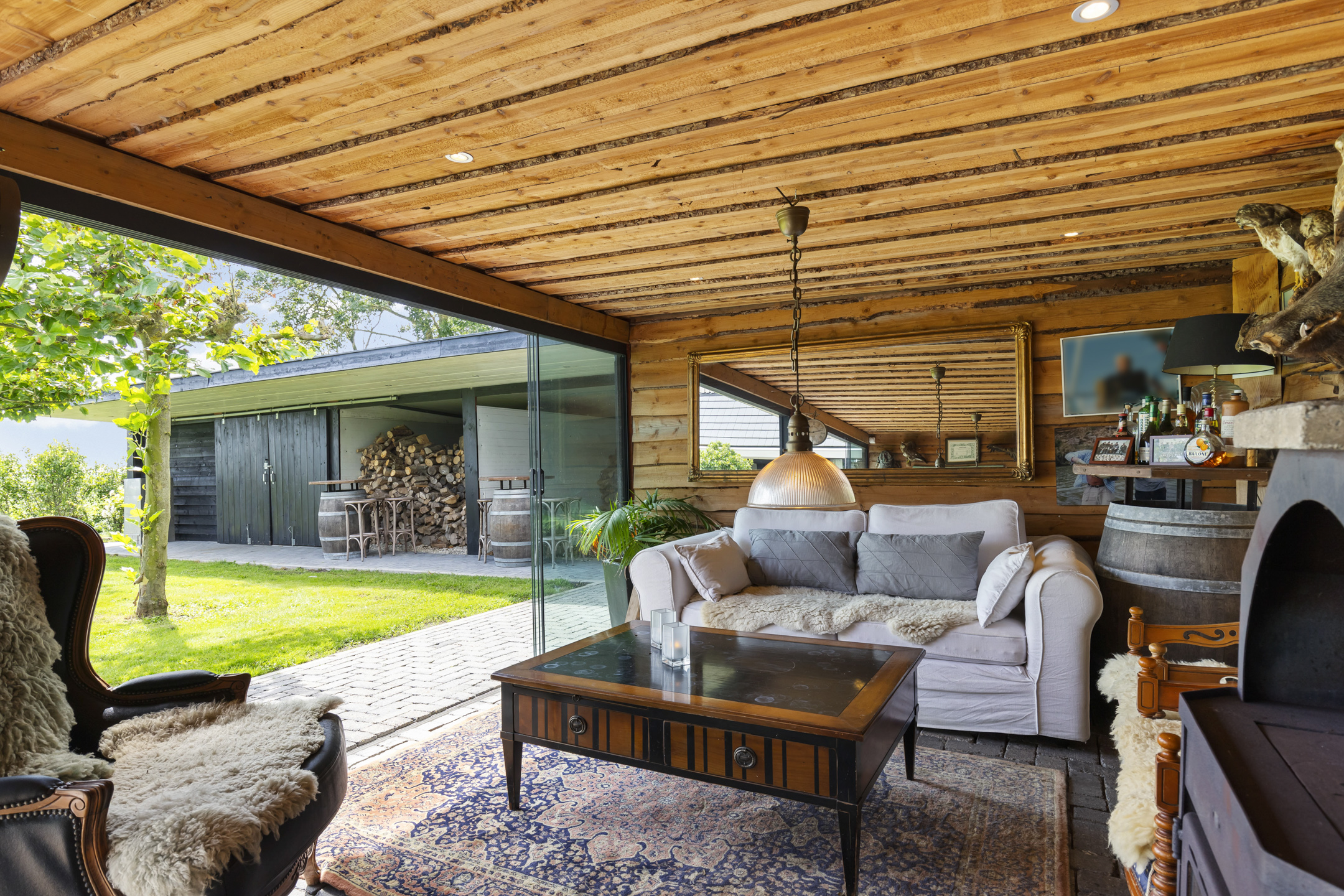 The outbuildings, arranged in a courtyard style with the house, give the garden a secluded and intimate atmosphere. In the stylishly wooden insulated garden house with 3 glass sliding doors and a wide canopy, a true hunting lodge and wellness area are situated. The outdoor kitchen connects the entire space with the main house. If desired, this can easily be integrated into the indoor space. The wellness and hunting lodge are rustically paneled on the inside and equipped with wood stoves, spotlights, a jacuzzi, sauna, steam shower, electricity, and water. A fantastic space that maximizes the living experience and invites gatherings with friends.