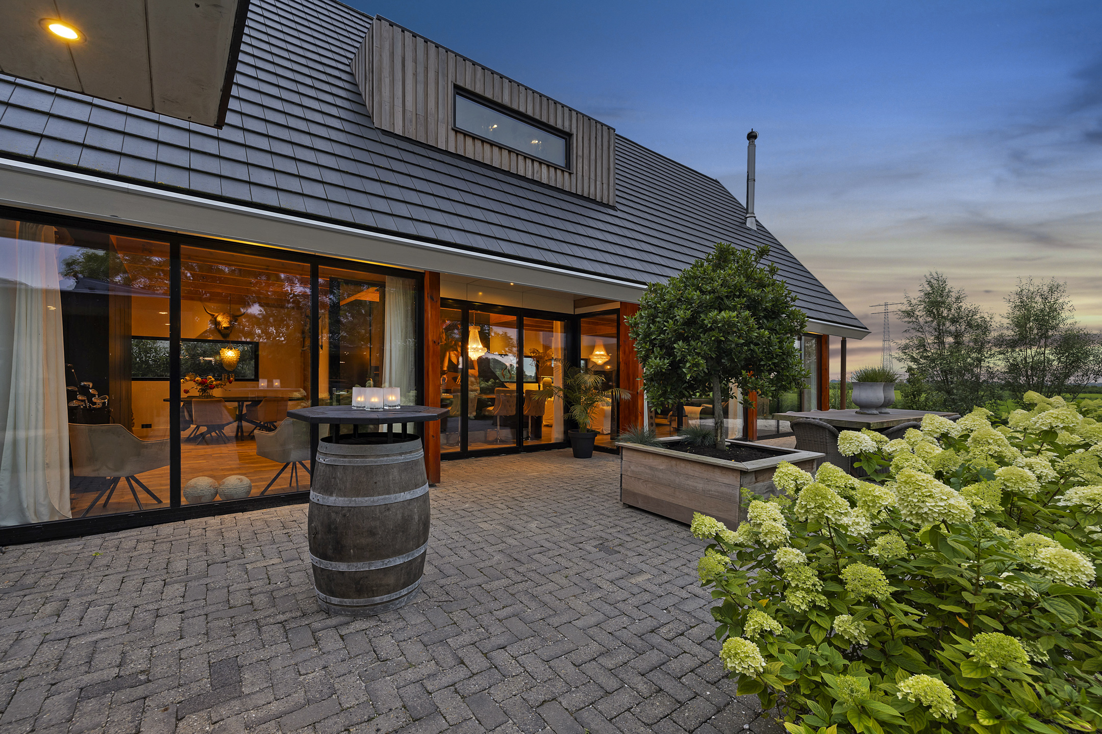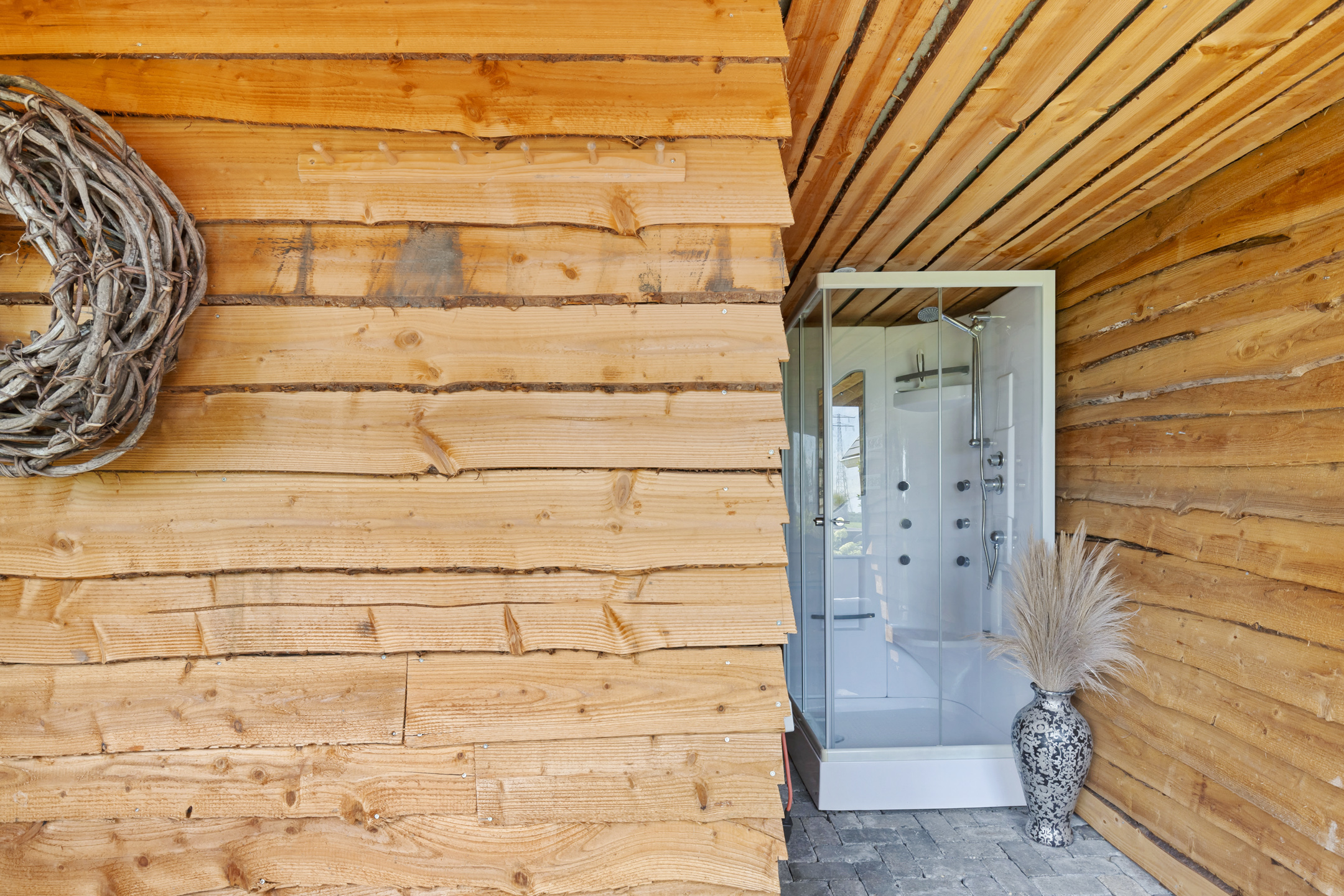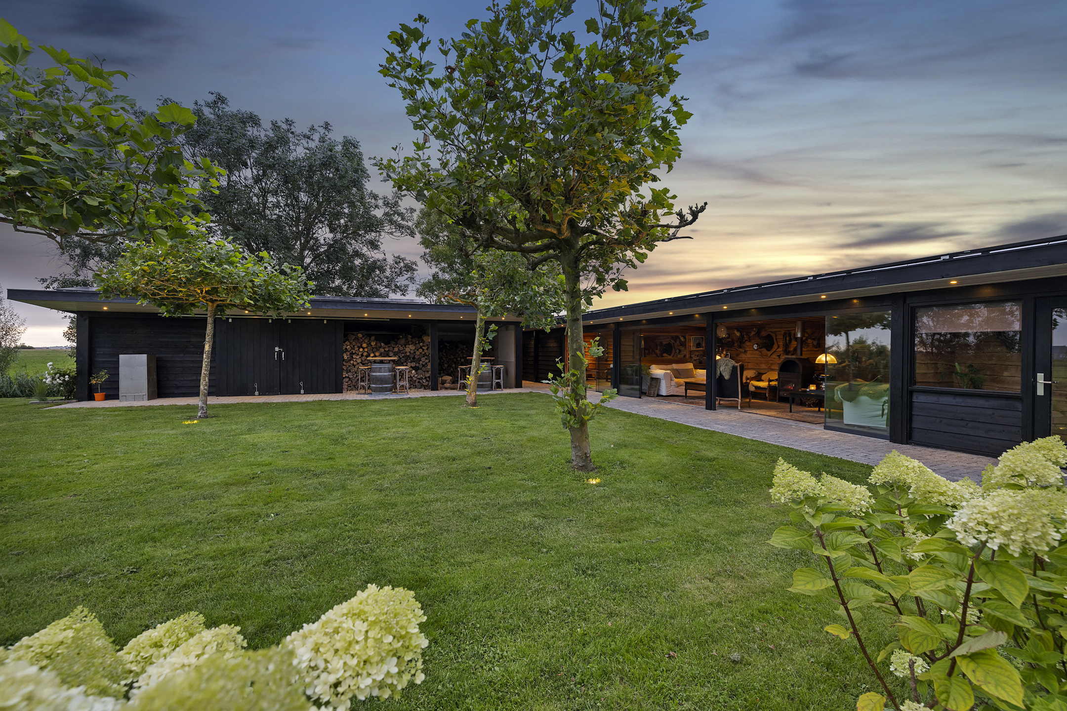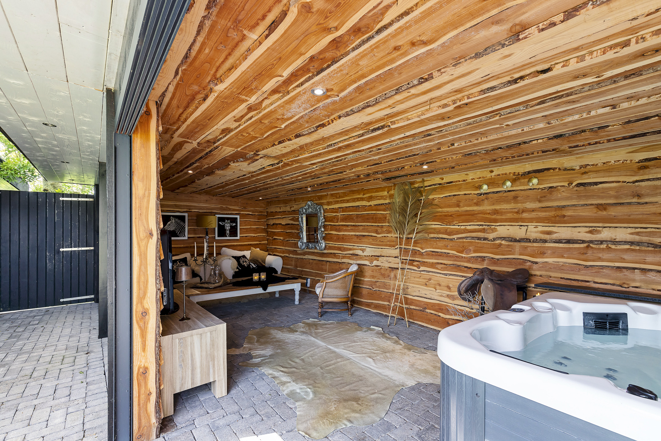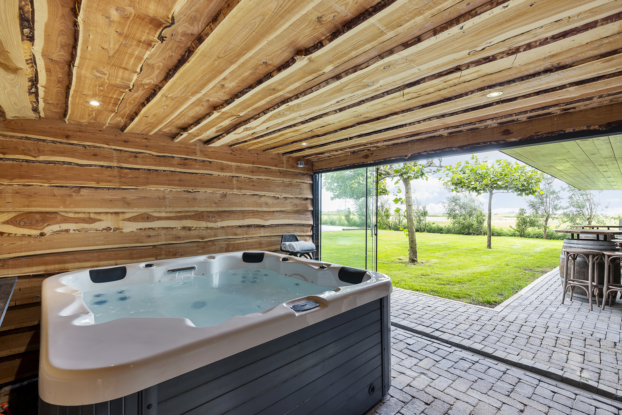 The outbuildings, arranged in a courtyard style with the house, give the garden a secluded and intimate atmosphere. In the stylishly wooden insulated garden house with 3 glass sliding doors and a wide canopy, a true hunting lodge and wellness area are situated. The outdoor kitchen connects the entire space with the main house. If desired, this can easily be integrated into the indoor space. The wellness and hunting lodge are rustically paneled on the inside and equipped with wood stoves, spotlights, a jacuzzi, sauna, steam shower, electricity, and water. A fantastic space that maximizes the living experience and invites gatherings with friends.