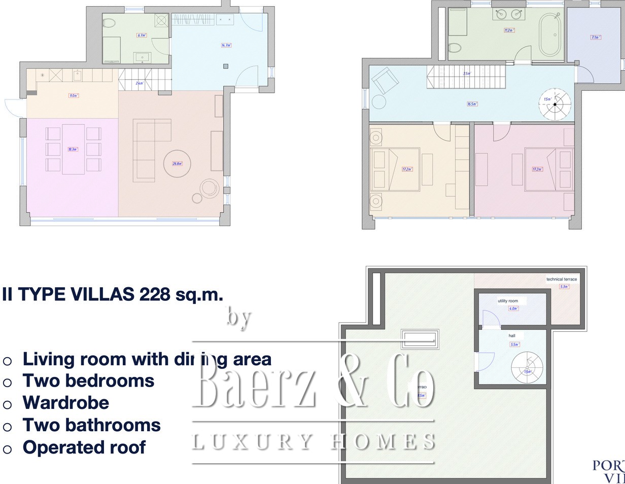 Villa has 2 levels and roof that can be used as terrace space. On the first level there is an open plan living room with kitchen, bathroom, hallway and terrace in front. On the second level there is two bedrooms and a bathroom.