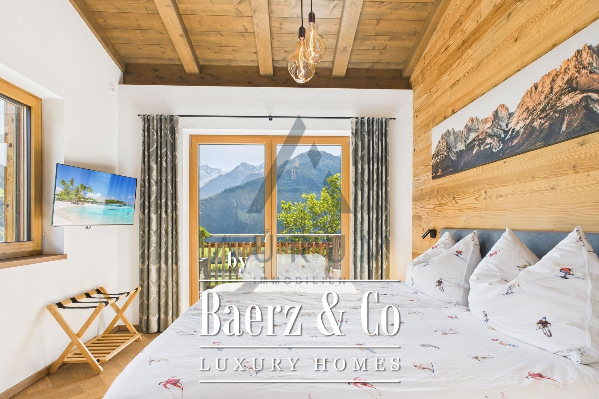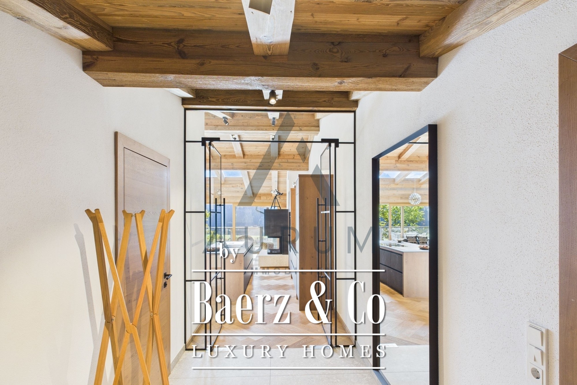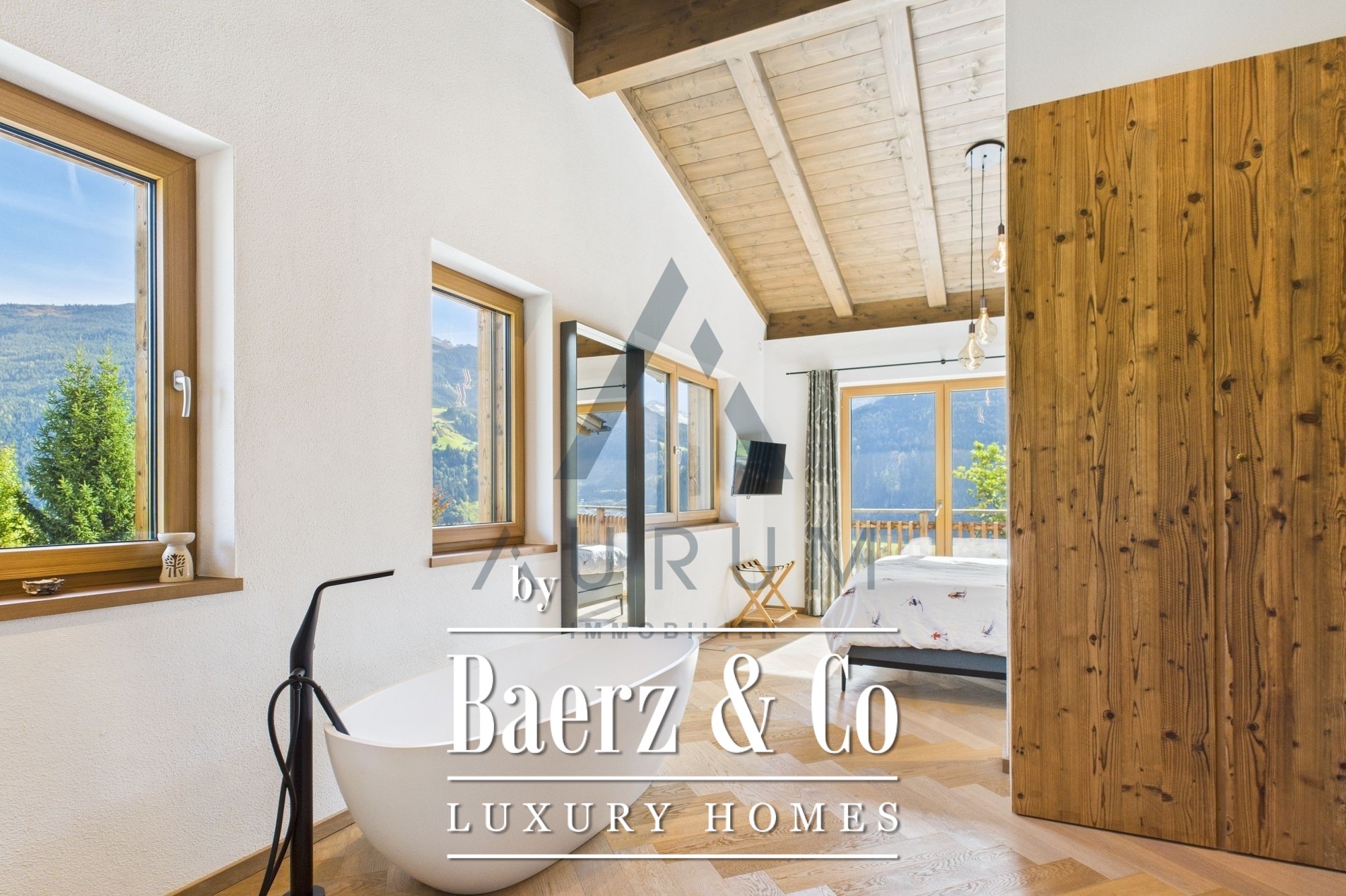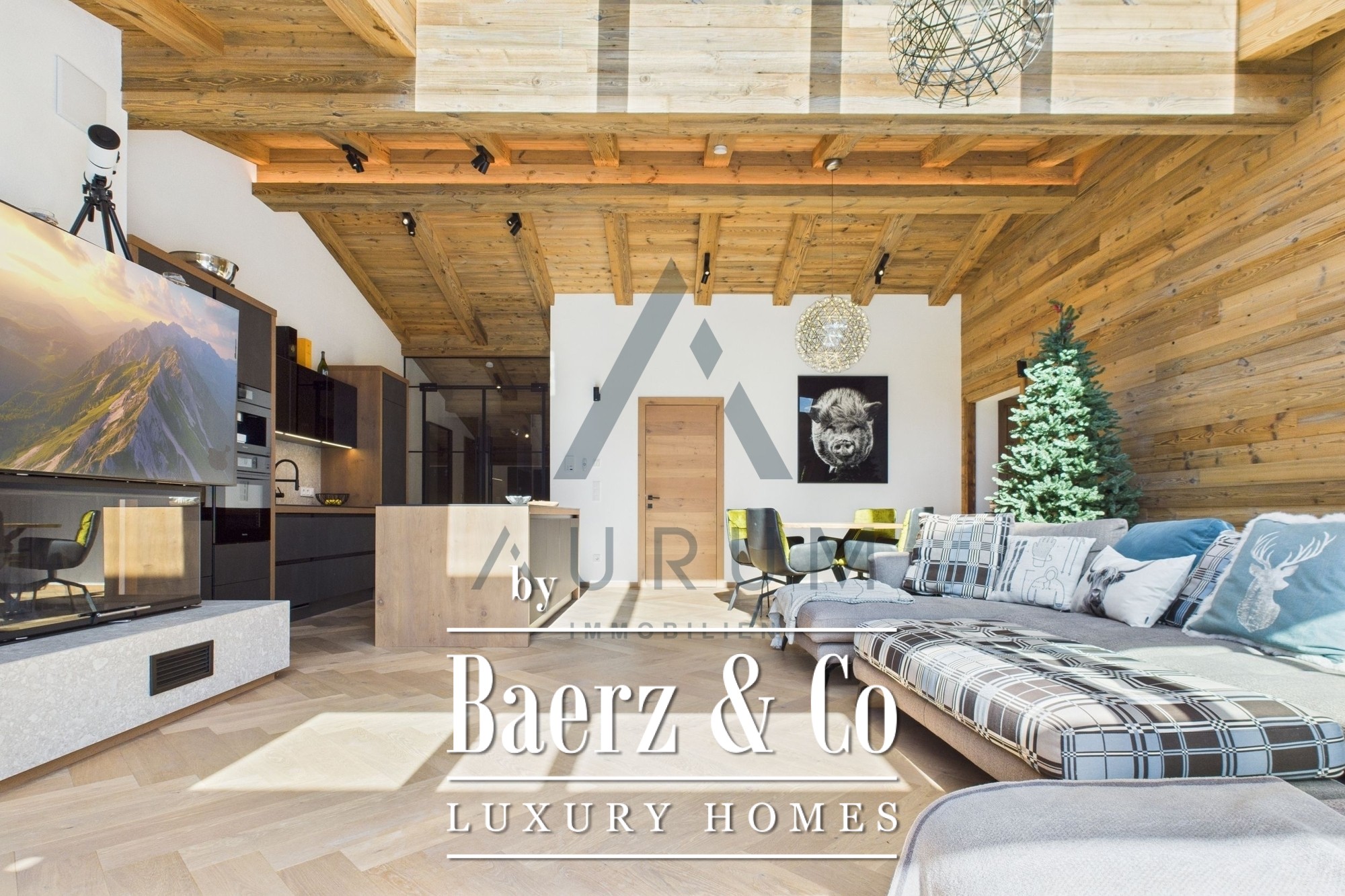 A striking living and dining area anchors the home, set beneath an exposed reclaimed wood roof truss and illuminated by a 3 by 4 meter roof glazing. Floor-to-ceiling triple-glazed French doors lead seamlessly to a 40 m² terrace, commanding panoramic mountain views. Materials and atmosphere combine in the designer kitchen, equipped with Miele appliances, a wine cooler, an integrated Bose sound system, and artful lighting. A fireplace lends understated warmth, while electric Venetian blinds and floor heating ensure year-round comfort.