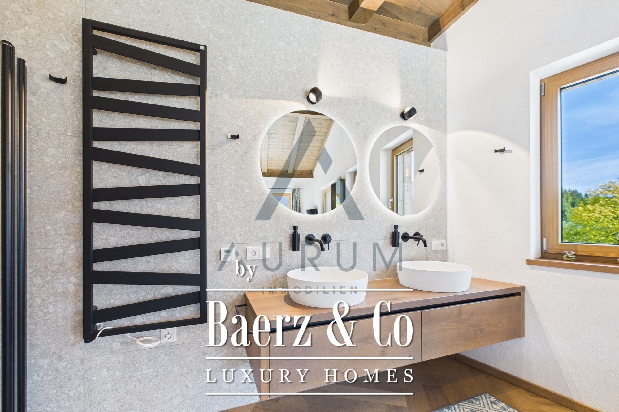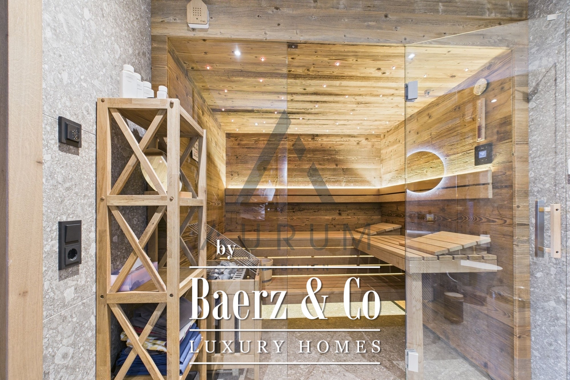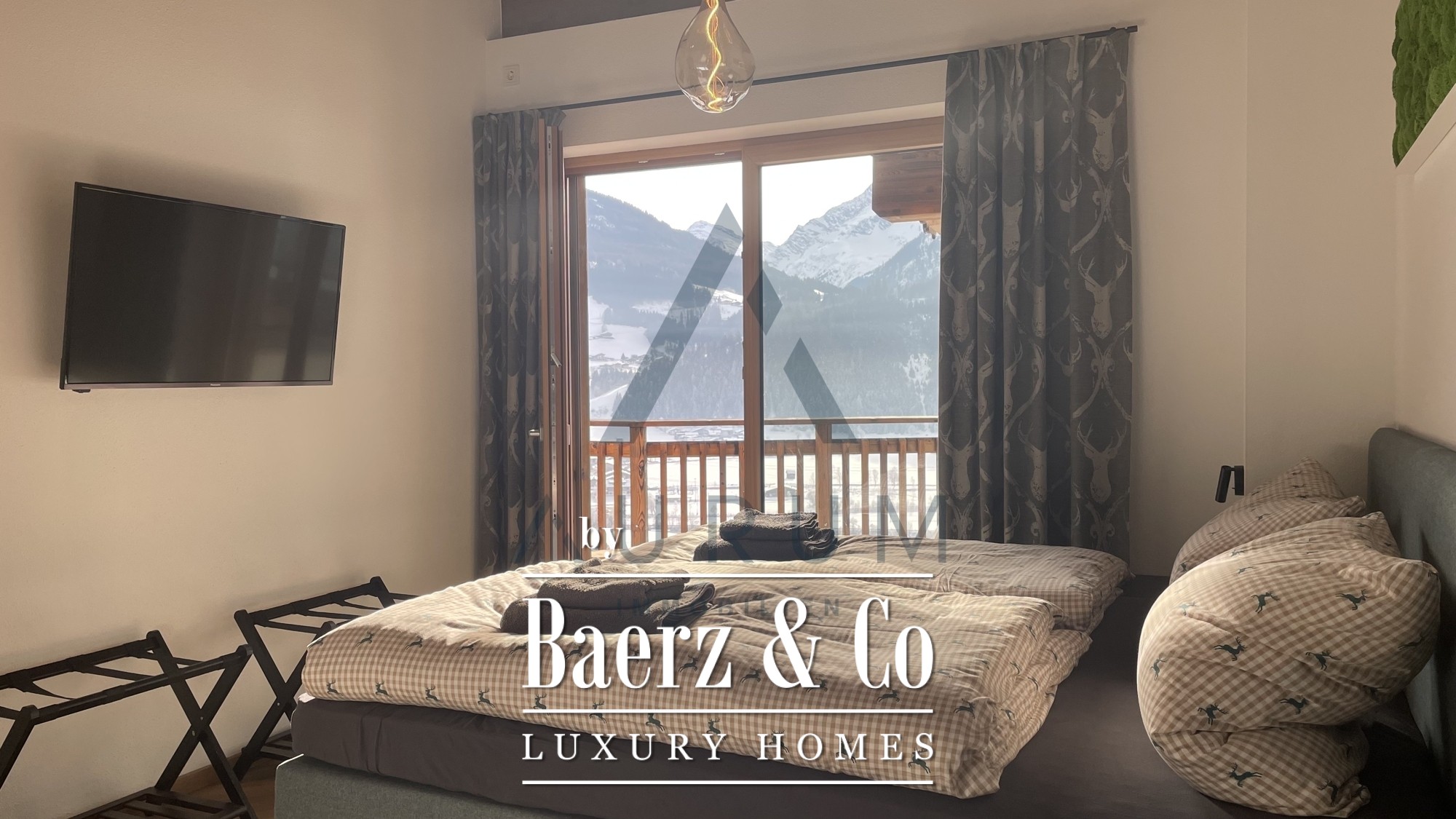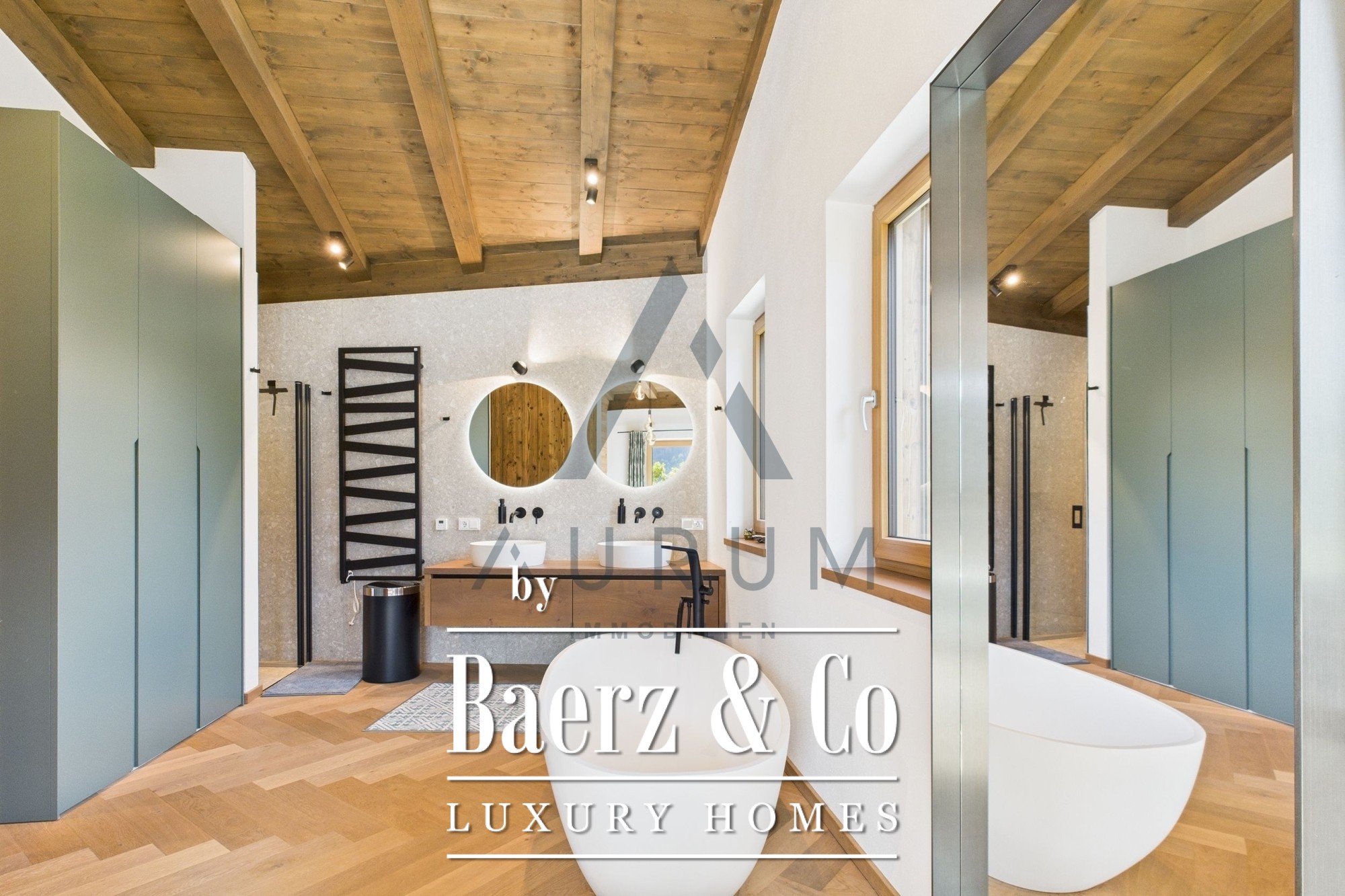 A striking living and dining area anchors the home, set beneath an exposed reclaimed wood roof truss and illuminated by a 3 by 4 meter roof glazing. Floor-to-ceiling triple-glazed French doors lead seamlessly to a 40 m² terrace, commanding panoramic mountain views. Materials and atmosphere combine in the designer kitchen, equipped with Miele appliances, a wine cooler, an integrated Bose sound system, and artful lighting. A fireplace lends understated warmth, while electric Venetian blinds and floor heating ensure year-round comfort.