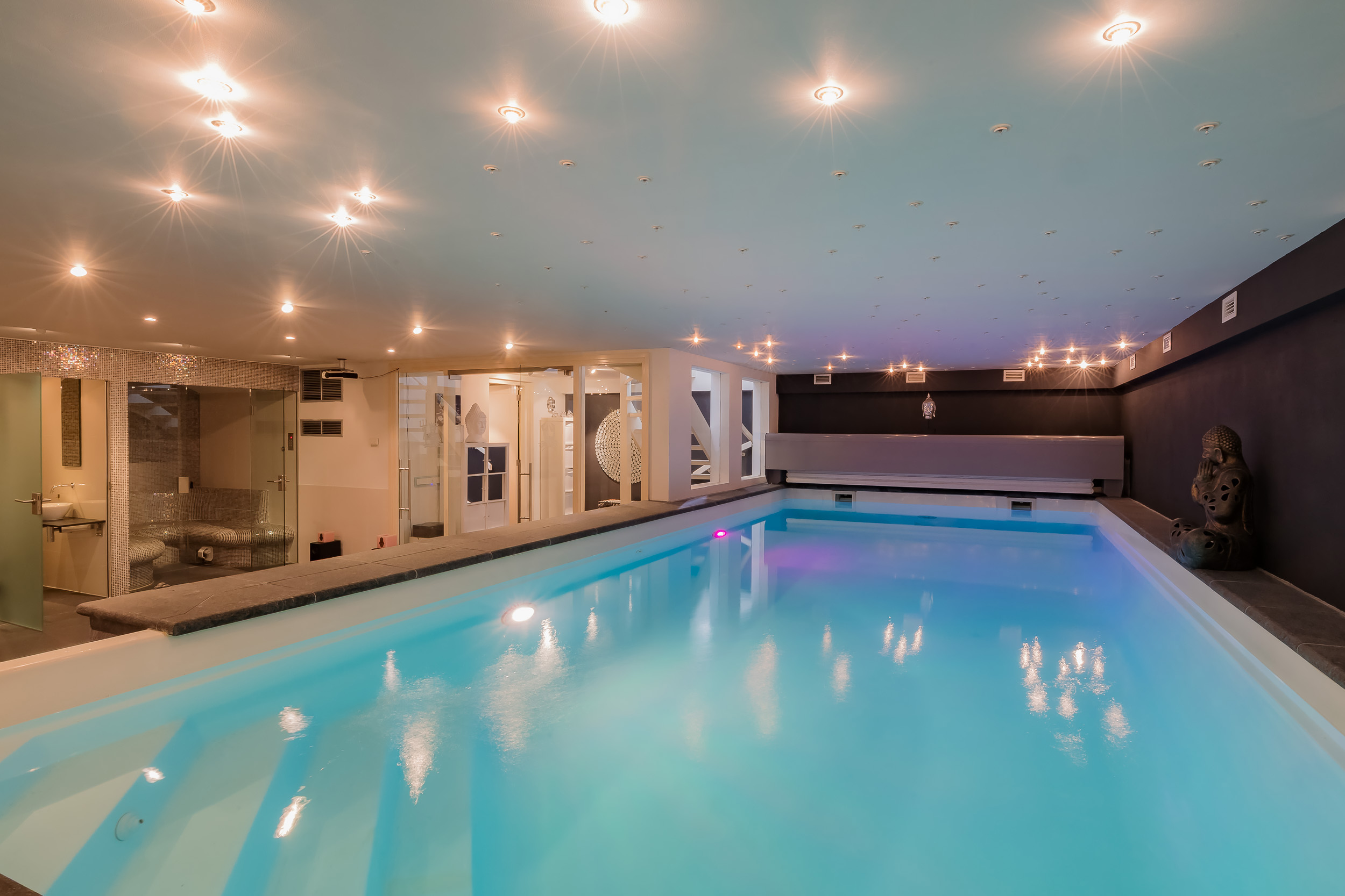 On the lower level, the residence indulges with a heated indoor pool, wellness amenities, and room for relaxation or hobbies. Outside, a decked terrace shelters multiple seating areas and a jetty for immediate access to the Kagerplassen. The landscaped garden offers quiet seclusion, a Jacuzzi, and on-site parking.