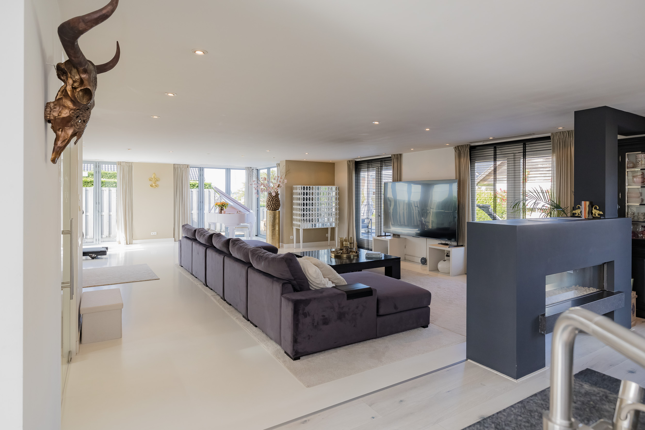 • Spacious living room with gas fireplace and luxury harmonica doors