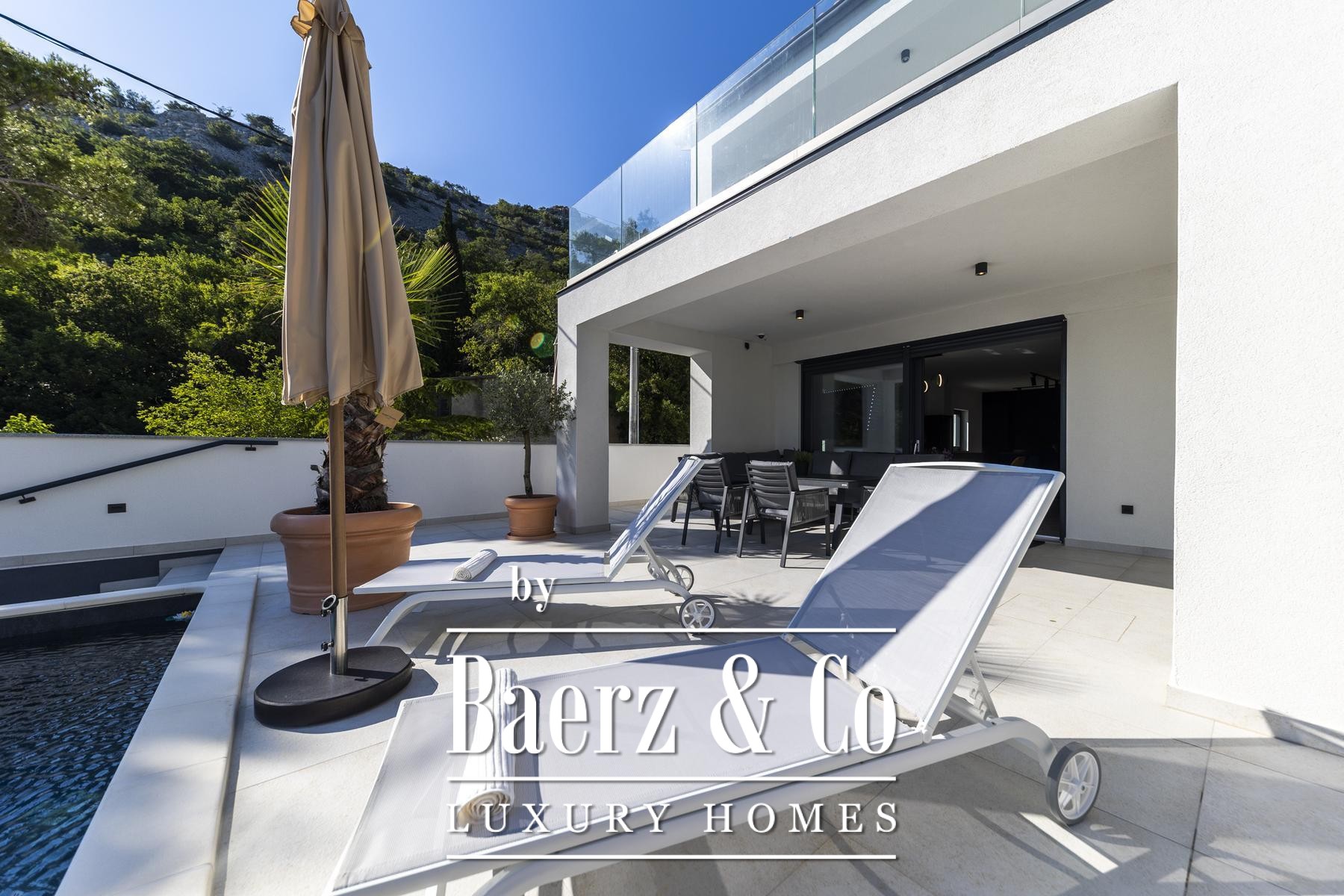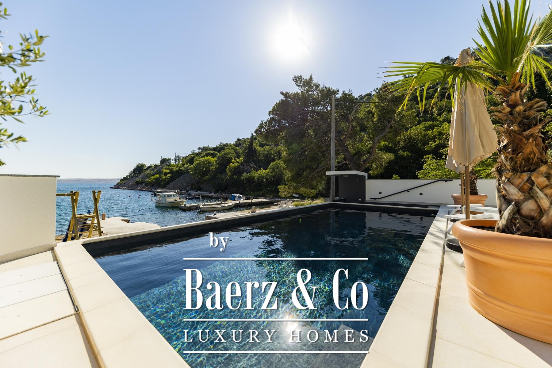 Expansive glass, triple-layered and well insulated, draws in light and frames the Adriatic, while underfloor heating and a fireplace ensure year-round warmth and calm. The main living space, elegantly proportioned, flows into a modern kitchen curated for both ease and sophistication. Outdoor areas invite languid afternoons beside the 32 m² seawater pool, in the jacuzzi, sauna, or at the private gym, with direct access to the sea and a pier that includes a boat slipway system for yacht owners.