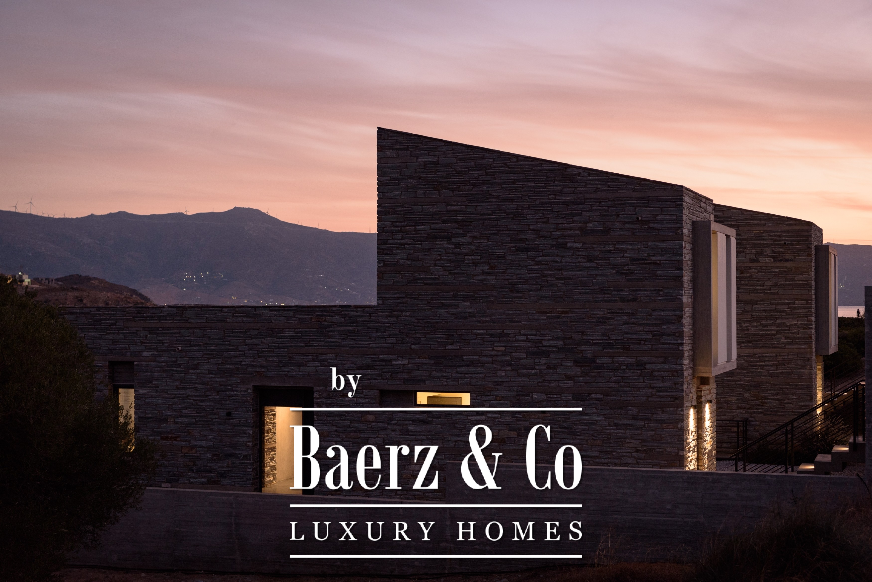 Architecture here speaks in the language of Karystos stone, combining contemporary precision with regional authenticity. Open-plan living and dining areas flow effortlessly into fully equipped kitchens, while expansive glass frames the unfolding seascape from nearly every room. The villa’s four bedrooms, each with its own en-suite bathroom, preserve privacy and comfort, with additional outdoor showers, storage, and designer furnishings completing the sense of preparedness for immediate living or hosting.