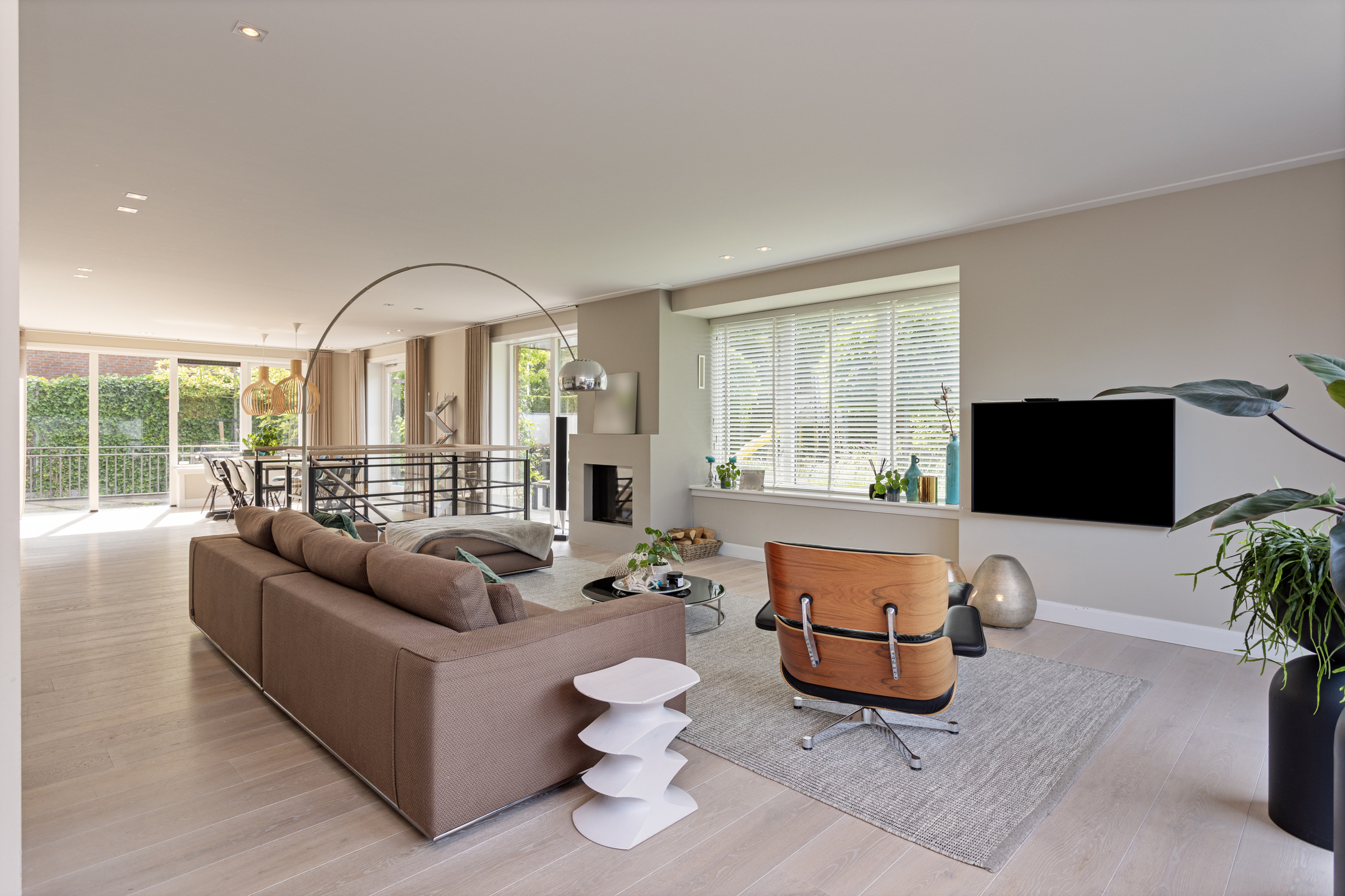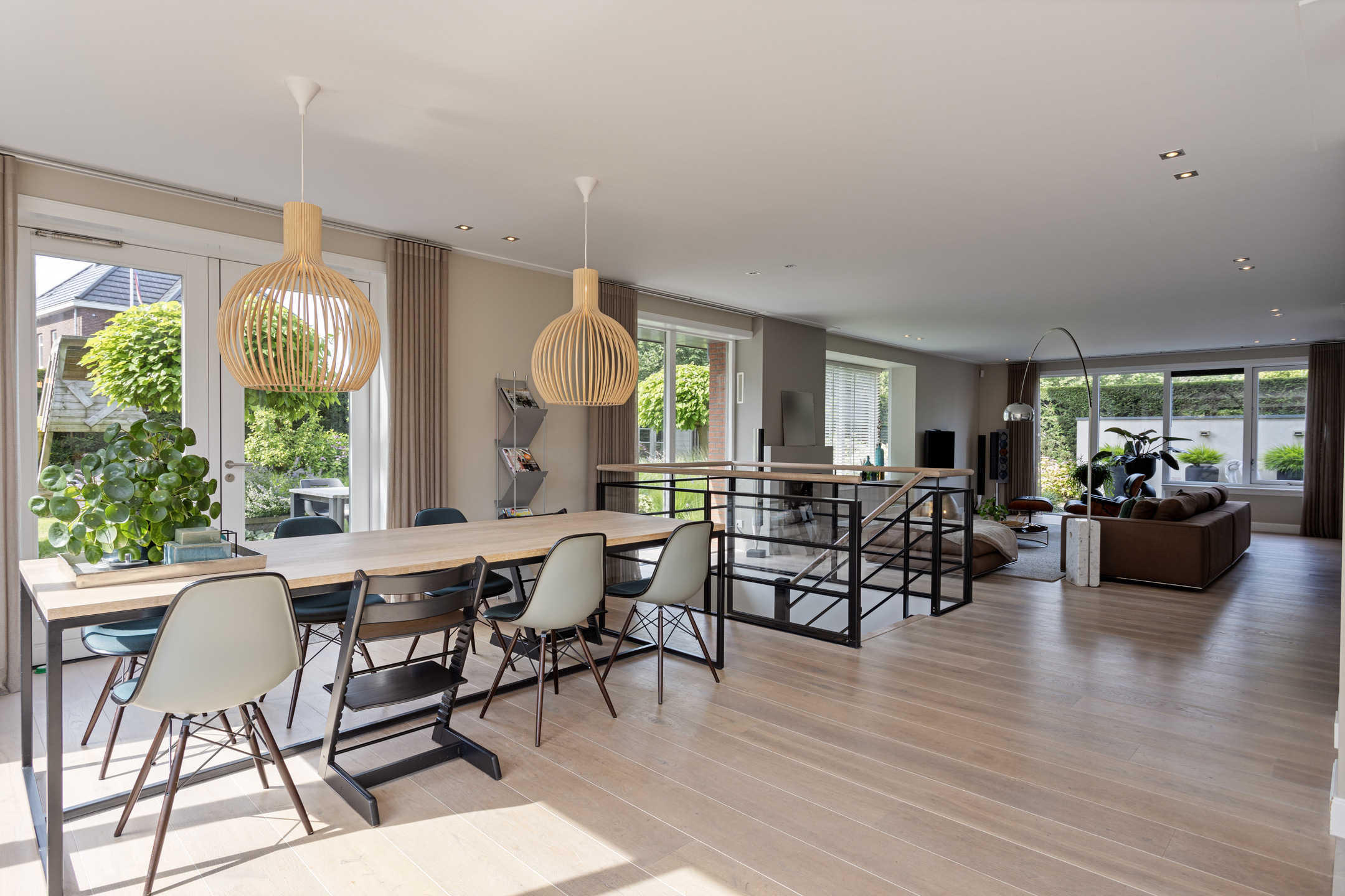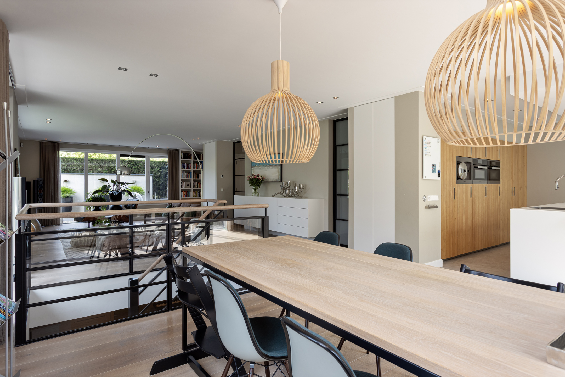 Upon entering there is a generous bright entrance with beautiful staircase and toilet room. Through the steel door we enter the generous, very bright living room with work corner and French doors to the beautiful garden. At the rear of the house is a large modern kitchen with cooking/sink island and breakfast bar; plenty of space for cozy dinners with friends and family. Again, large windows provide an abundance of light. A utility room is of course not missing; this is also where the washing equipment is located.