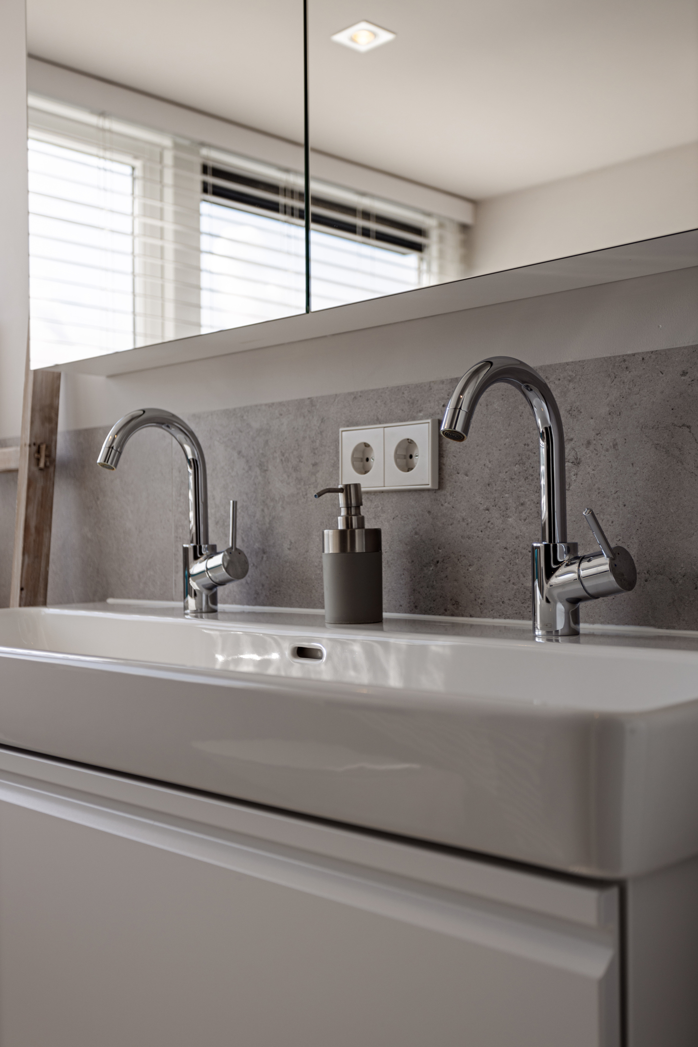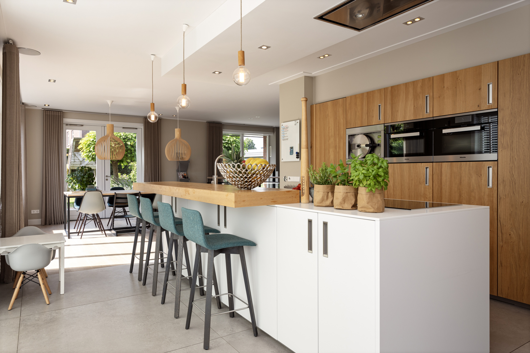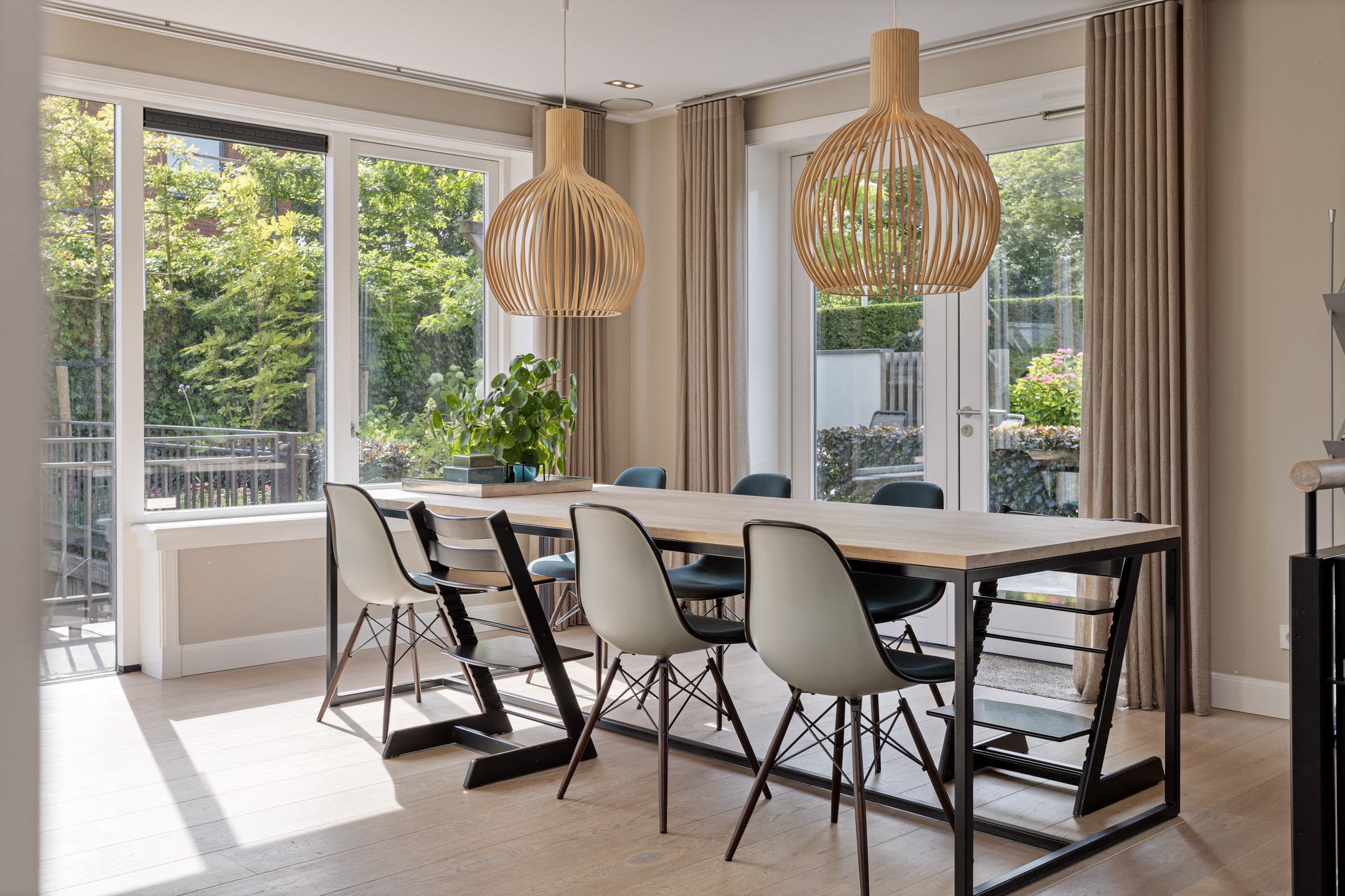 Upon entering there is a generous bright entrance with beautiful staircase and toilet room. Through the steel door we enter the generous, very bright living room with work corner and French doors to the beautiful garden. At the rear of the house is a large modern kitchen with cooking/sink island and breakfast bar; plenty of space for cozy dinners with friends and family. Again, large windows provide an abundance of light. A utility room is of course not missing; this is also where the washing equipment is located.