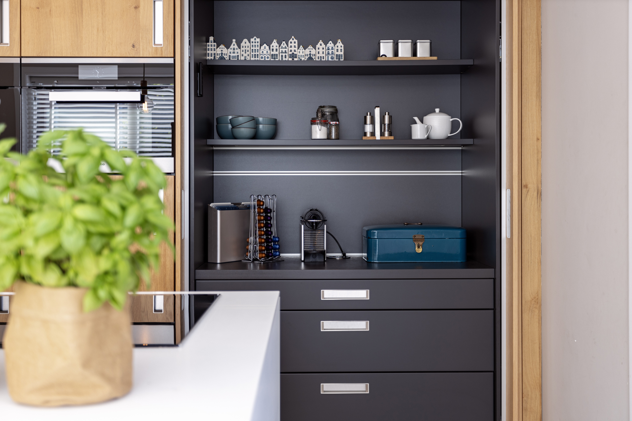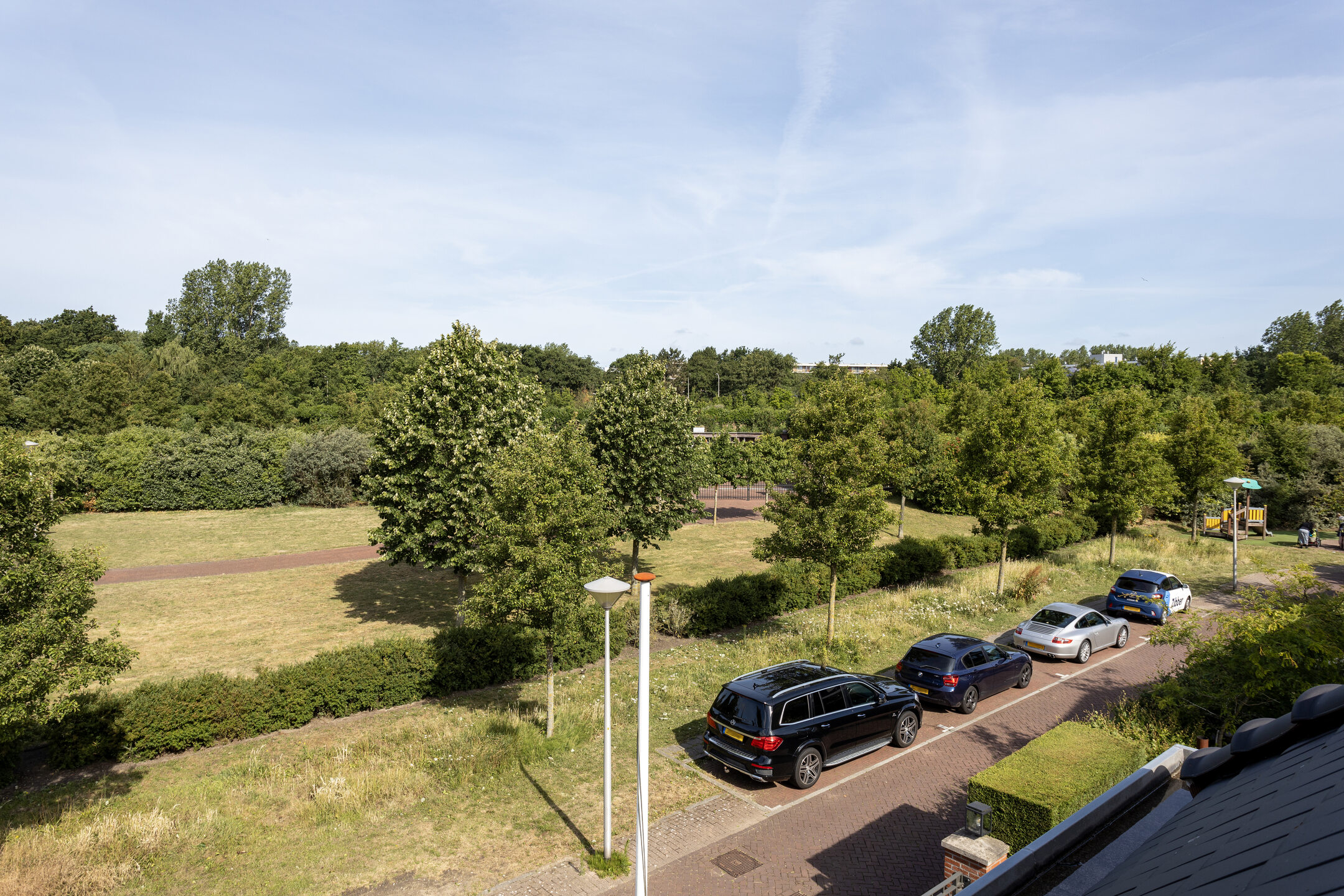 The beautifully landscaped garden has several terraces, grass, planters, flower borders, hedges and an outdoor shower. The spacious terrace facing the living room (Z) has a large sunshade. The garden is surrounded by a beautiful green hedge and can be closed with an electrically operated ornamental fence, which not only provides privacy but also extra security.
