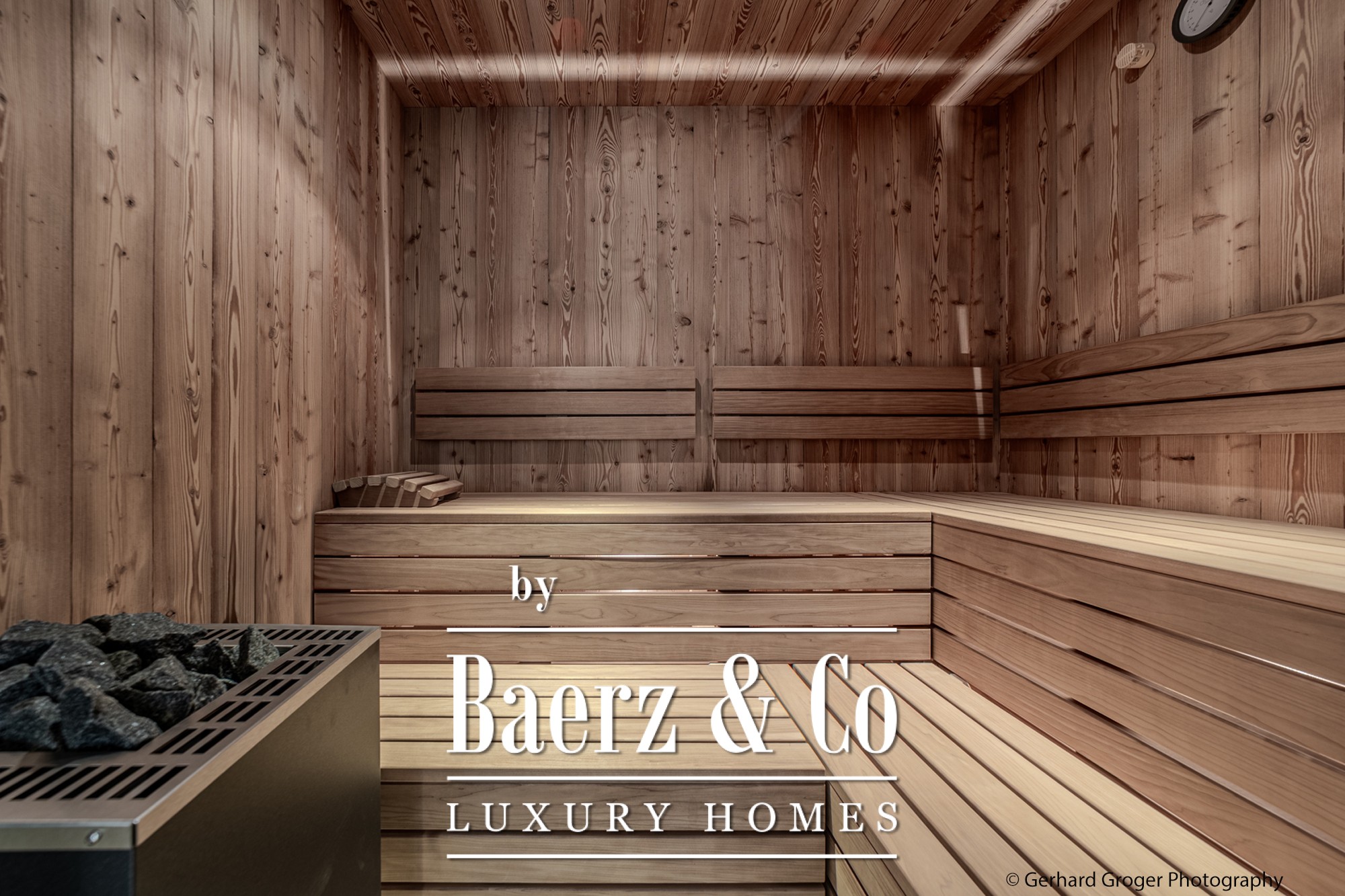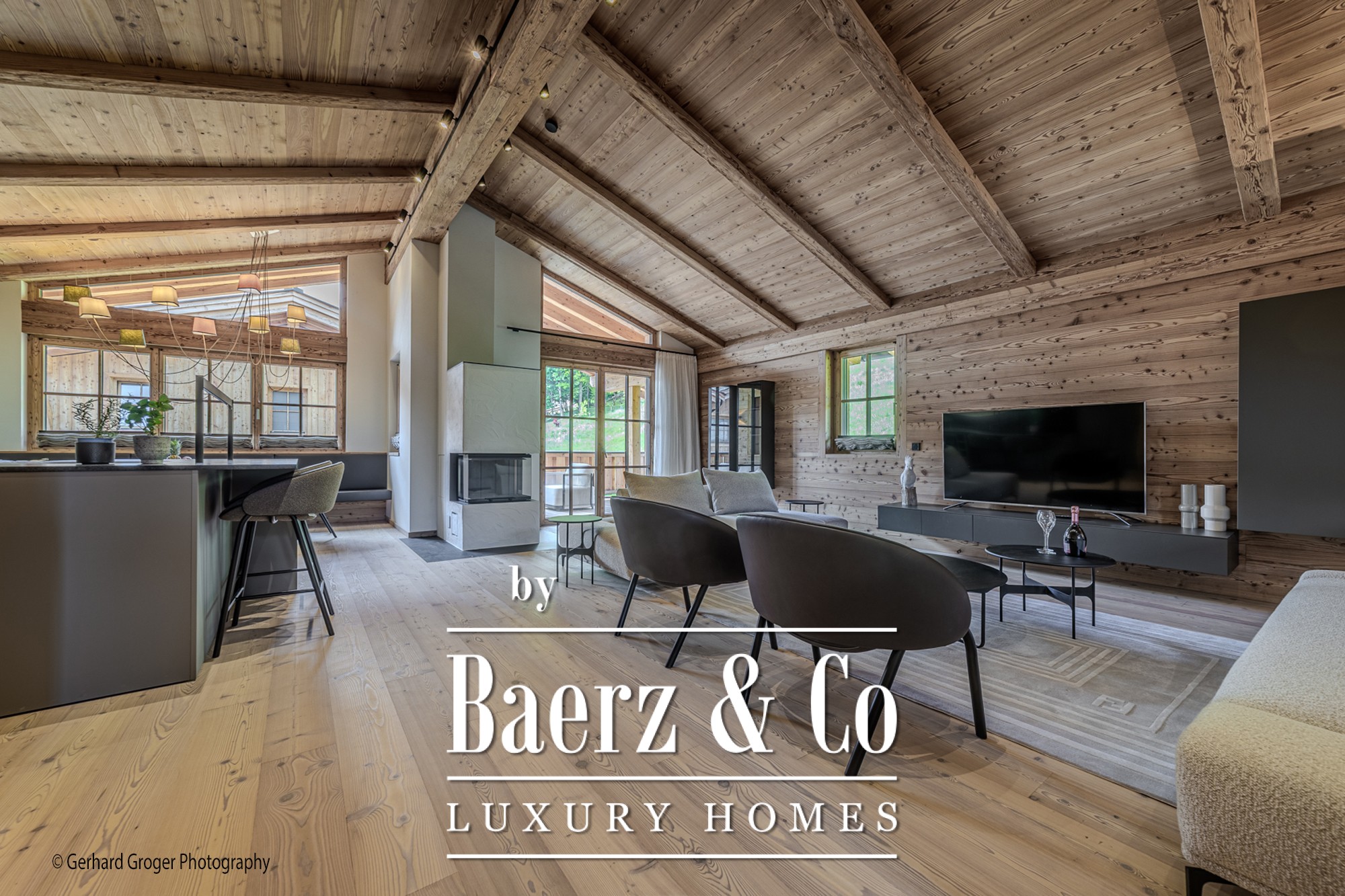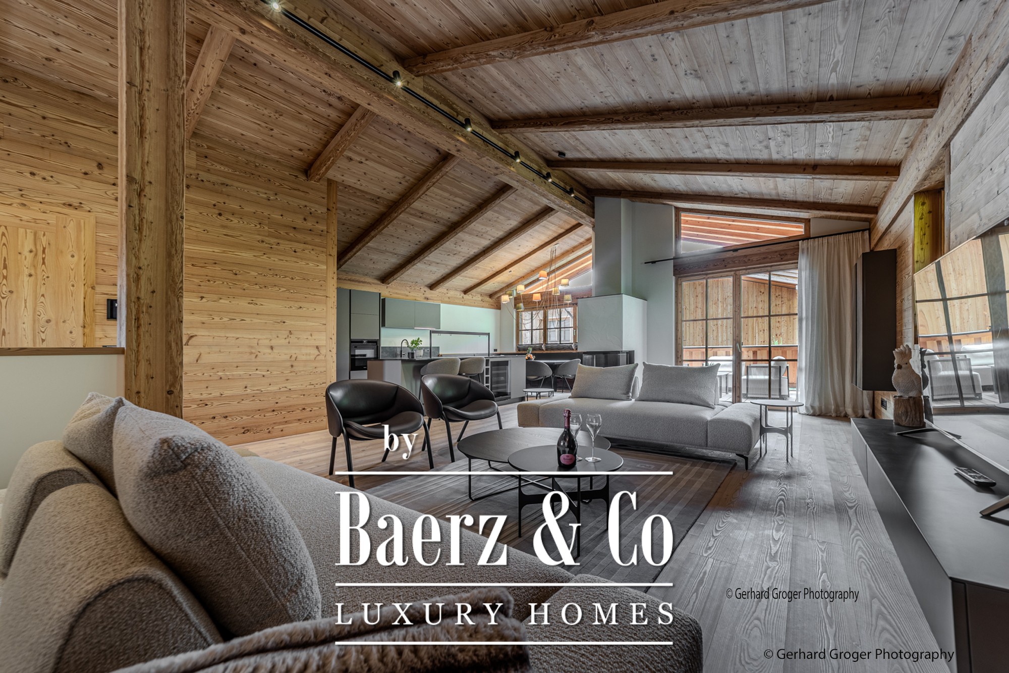 On the basement level, residents will find a secluded bedroom with en-suite bath and an elegant wellness retreat, including a sauna. Two additional bedrooms with private baths are arranged on the ground floor, ensuring comfort for both family and guests. The upper floor offers a light-filled living and dining area, enhanced by an open fireplace and exposed roof trusses, leading out to expansive terraces that frame the alpine panorama.