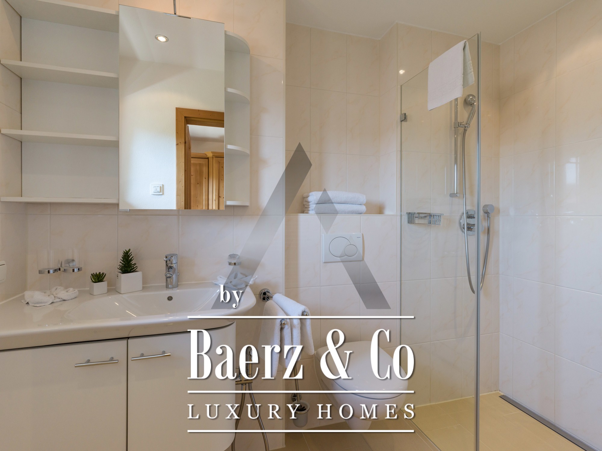 The master bedroom suite features an ensuite bath, joined by two additional bedrooms and two further bathrooms; each space is arranged for privacy and effortless comfort. Plank floors and tailored carpentry fixtures speak to a restrained material palette. Expansive windows and a surrounding sun balcony welcome panoramic views over the Hahnenkamm and Wilder Kaiser, grounding daily living in the rhythms of the mountains.
