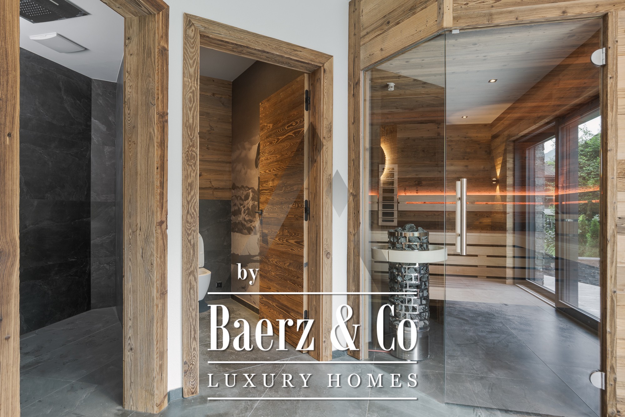 Floor-to-ceiling glass fronts in the expansive 70 m² living and dining area open to the landscape, while natural stone and old wood formwork accentuate the exterior’s timeless elegance. The professional kitchen features appliances from Gaggenau and Bora Professional, ideal for culinary pursuits. A dedicated wellness area with sauna and relaxation zone invites restoration, joined by thoughtful amenities such as a lift, open fireplace, BUS system, and both underground and outdoor parking.