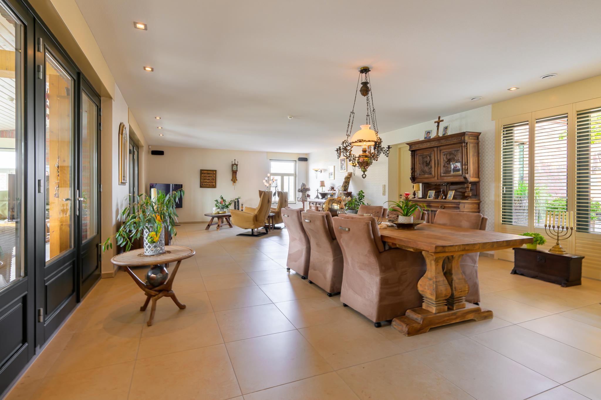 Deze luxe afgewerkte woning is gebouwd in een U-vorm met een sfeervolle binnenplaats. Aan de linkerzijde ligt het woongedeelte. Bij binnenkomst in de royale hal valt direct de prachtige plavuizenvloer op, samen met de meterkast, trapopgang naar de eerste verdieping en een stijlvol toilet met fonteintje. Vanuit de hal komen we in de ruime woonkamer, gekenmerkt door strak gestucte wanden, inbouwspots en openslaande tuindeuren naar de binnenplaats. Warme kleuren, zachte stoffen en naturel materialen; allemaal ingrediënten die bijdragen aan een huiselijk 'ik kom thuis'-gevoel. Dit alles vind je zeker terug in deze prachtige woonkamer. Alles is netjes, maar vooral sfeervol en luxe afgewerkt.
