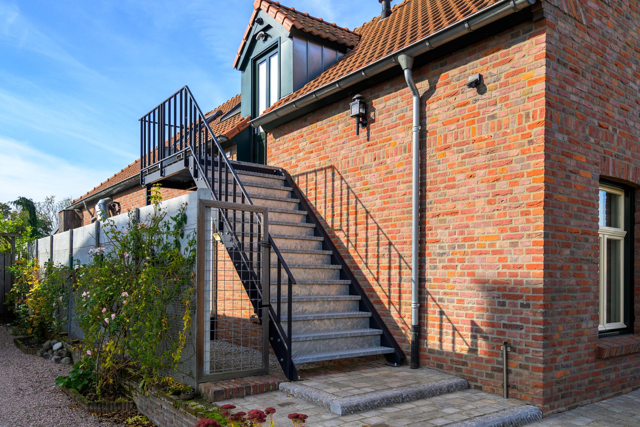 De eerste verdieping is toegankelijk via zowel de binnen- als de buitentrap. Ook hier is de ruimte verdeeld in twee delen. Het ene deel bevat een royale overloop, technische ruimte, zeer ruime slaapkamer en een bergzolder. Aan de andere kant bevindt zich een zelfstandig appartement, compleet uitgerust voor autonoom wonen. Via de buitentrap komen we binnen in een hal met toilet. Vanuit hier bereiken we de royale woon-/eetkamer. Deze is voorzien van een luxe keuken. De badkamer is uitgerust met: een wastafel, inloopdouche en witgoedaansluitingen. De slaapkamer heeft een handige schuifdeurenkast. Ook deze verdieping beschikt over vloerverwarming en profiteert van veel daglicht door de dakramen.