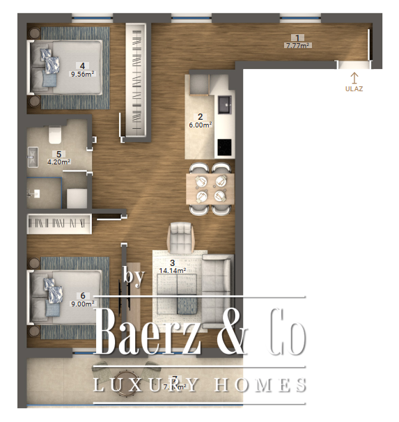 Located on the first floor of a two-storey building, the apartment comprises a hallway, open living room with kitchen and dining area, two bedrooms, one bathroom, and a terrace facing the surrounding fjord landscape. The building’s construction is defined by high-quality materials and subtle amenities: aluminum double-insulated facade doors with four-season glass, Chevron class three-layer parquet, high-quality ceramics, and an inverter air conditioning system offer a sense of enduring comfort.