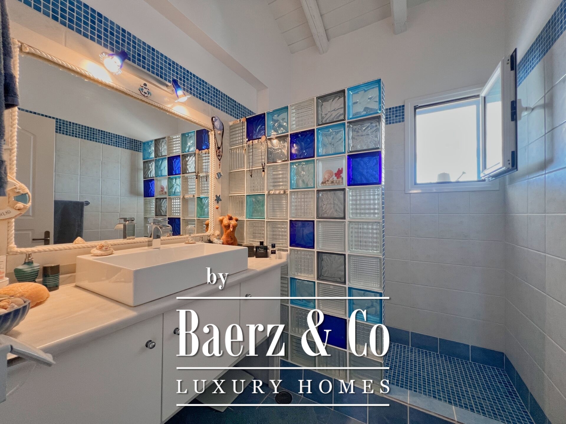 Outdoors, mature olive trees settle the house in its landscape. The expansive garden, designed with automatic irrigation, sits beside a sheltered garage, ample storage, a dedicated barbecue, and space for a future pool. Security features such as security door, CCTV, and alarm complement the villa’s sense of discretion. This property is a rare offering for those seeking a villa Kouverta experience defined by privacy, luxury, and the elemental presence of Aegean light.