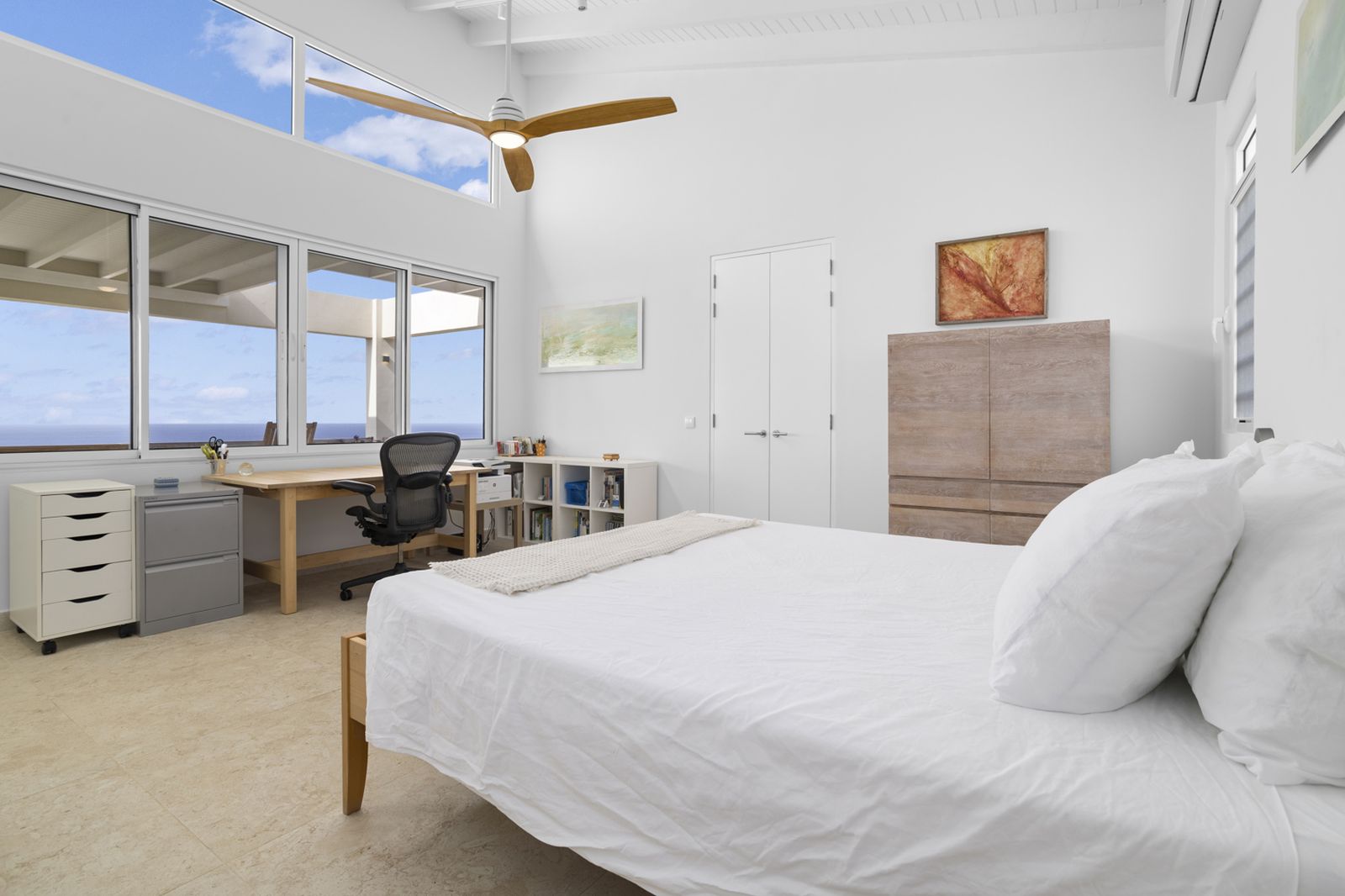 The spacious primary bedroom overlooks the Caribbean Sea and includes a refined en-suite bathroom with double sinks and a walk-in shower. The double-island kitchen is ideal for entertaining, offering ample workspace while allowing the chef to stay connected with guests at the bar and outdoor dining area. The layout is perfectly suited for couples seeking comfort, simplicity, and space, and it even includes a large, secure storage room for water sports equipment, a rare feature on Bonaire.