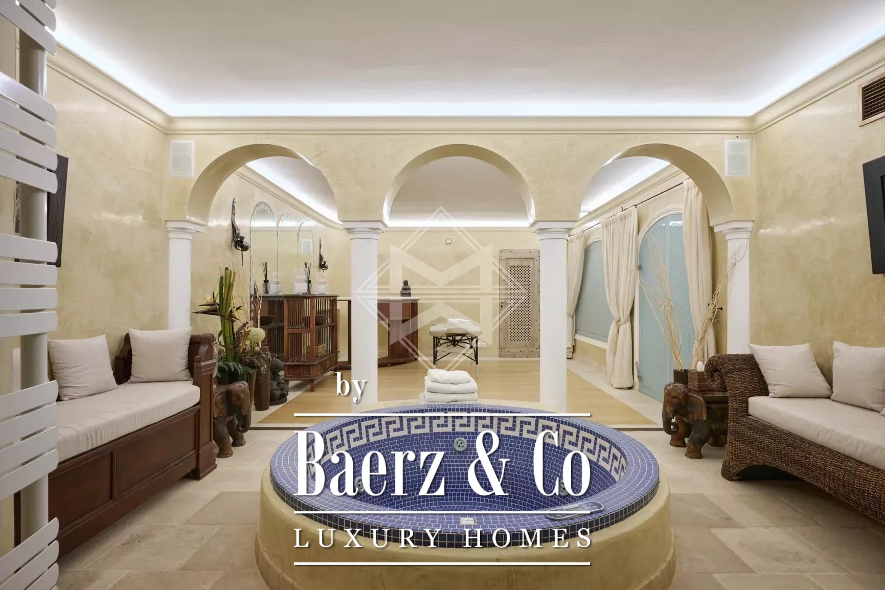 The left wing reveals a chef’s kitchen with pantry, a dining space with a fireplace, a laundry area and discreet staff accommodation. The right wing hosts three en-suite bedrooms including a master suite with dressing room, study and garden access. Upstairs provides three more bedrooms, two bathrooms, balconies and a terrace. On the garden level, leisure and wellness are at the fore: home cinema, spa with jacuzzi, sauna, hammam, music room, wine cellar, cigar cellar and a self-contained guest apartment.