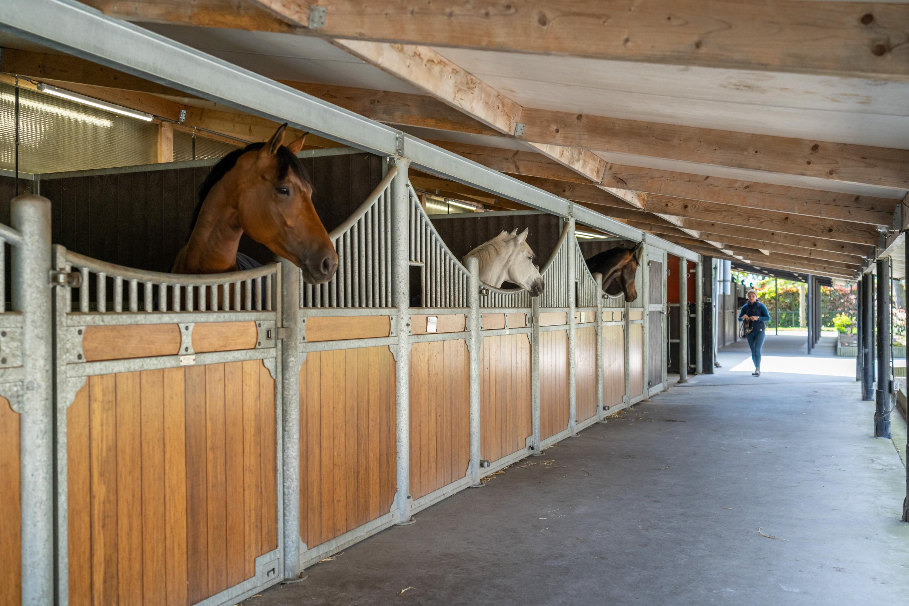 The four stalls (approx. 3 x 3.5 m) on the right-hand side have lowered bamboo front walls with hinged doors and plastic partition walls. These stables have two washing areas, which are equipped with hot water. There is also a storage room.