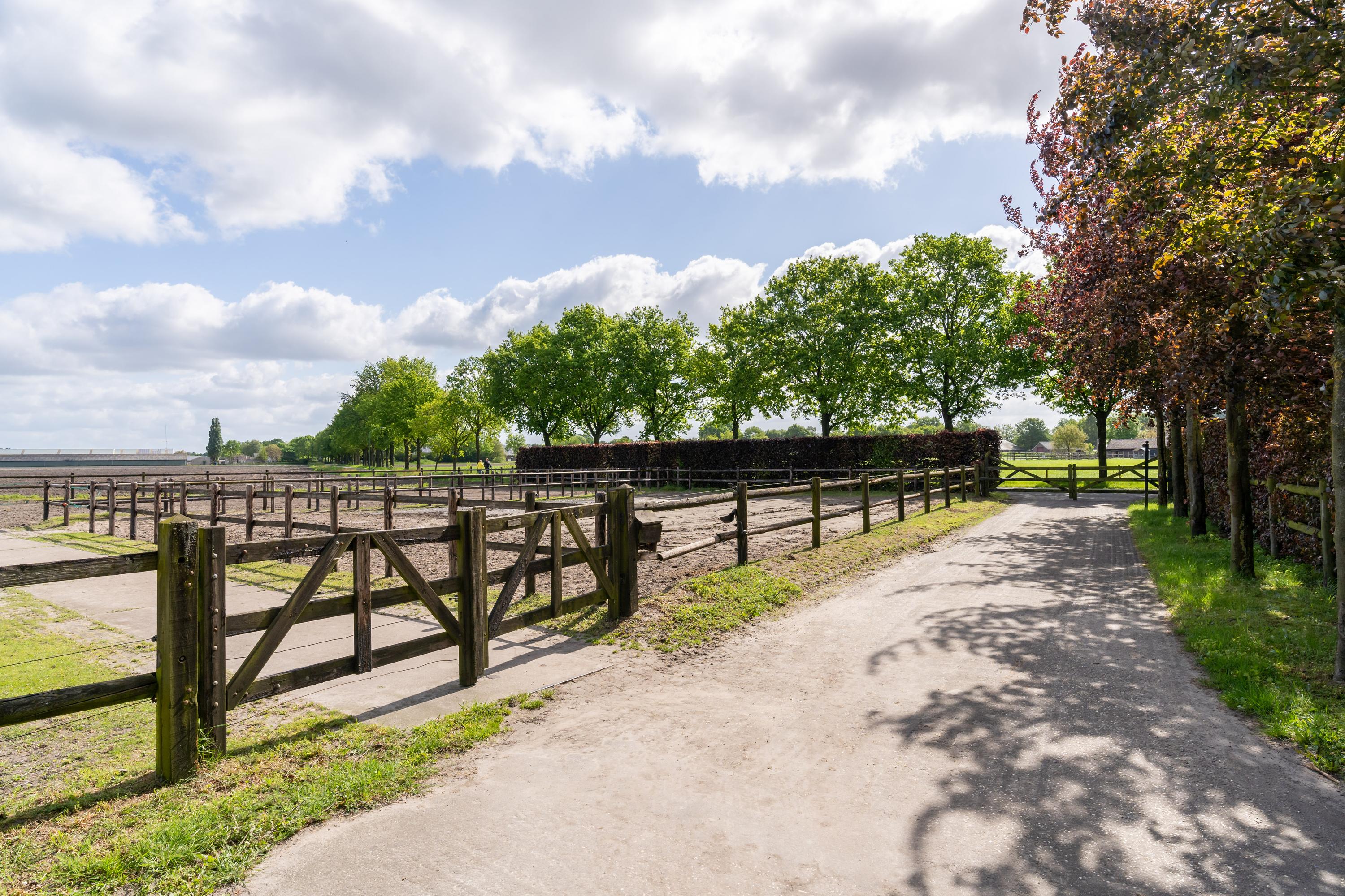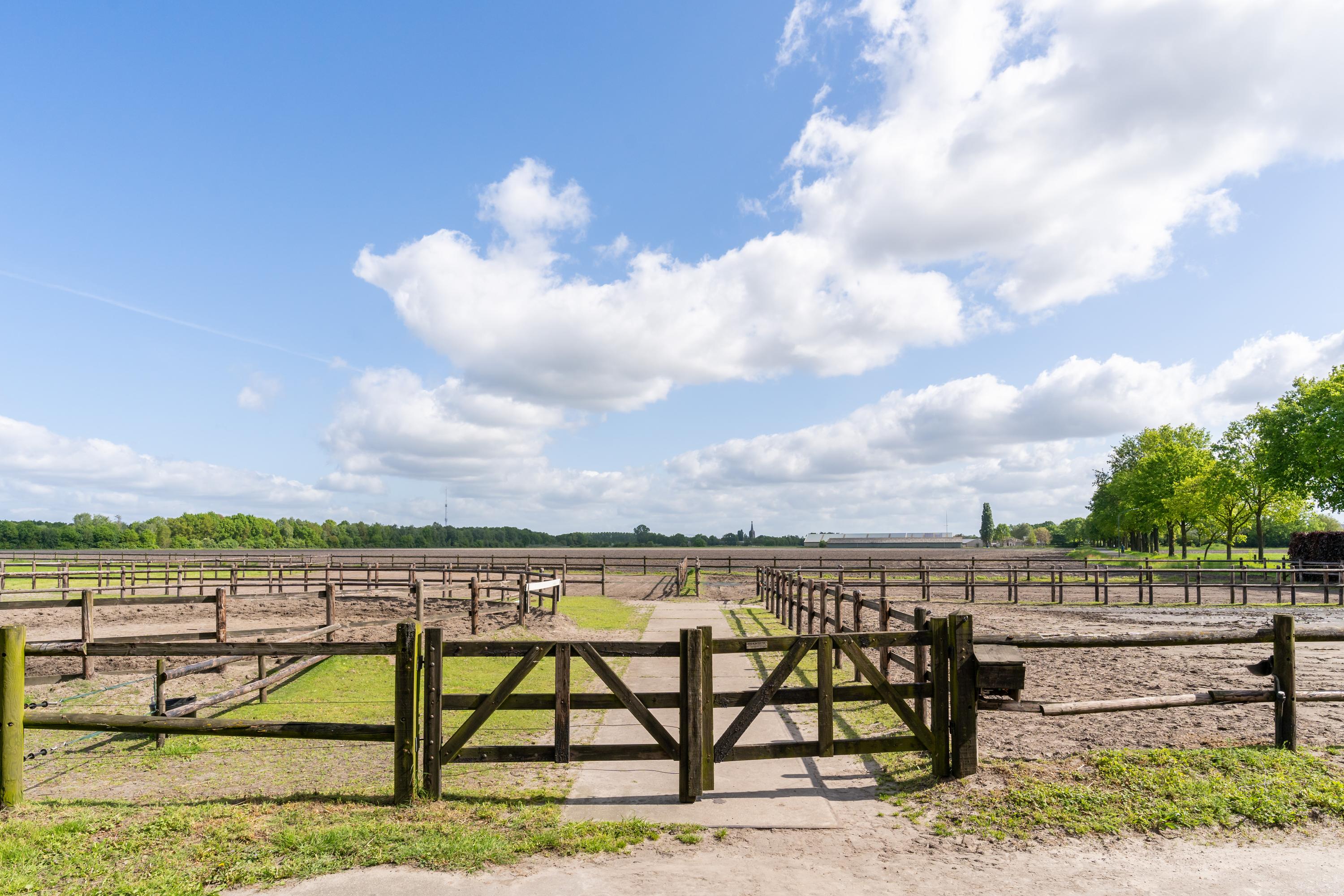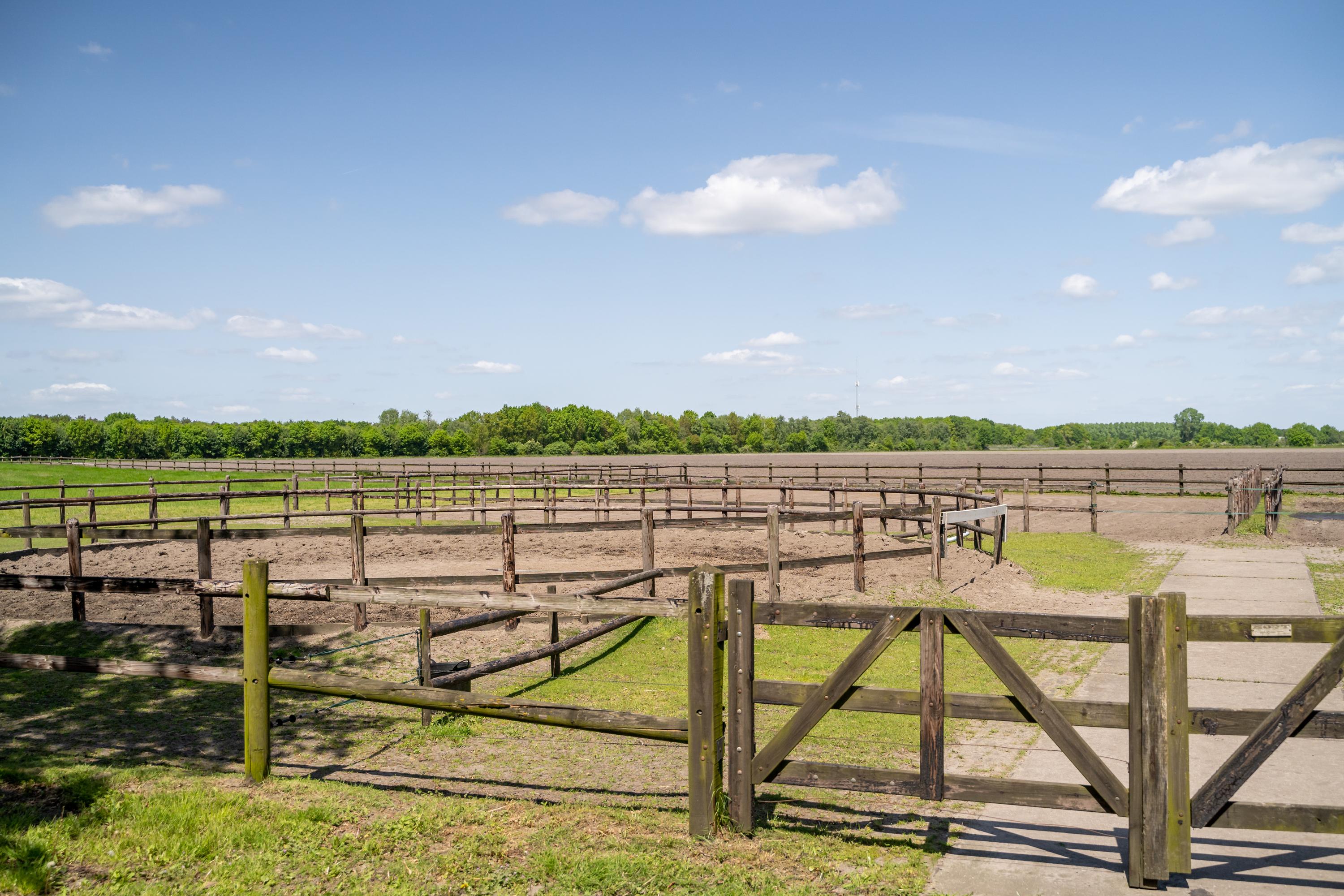 There are three paddocks, which have a sand floor and a wooden fence. The paddocks are also accessible via a rear entrance to the plot. The surrounding meadows are also fenced with wood.