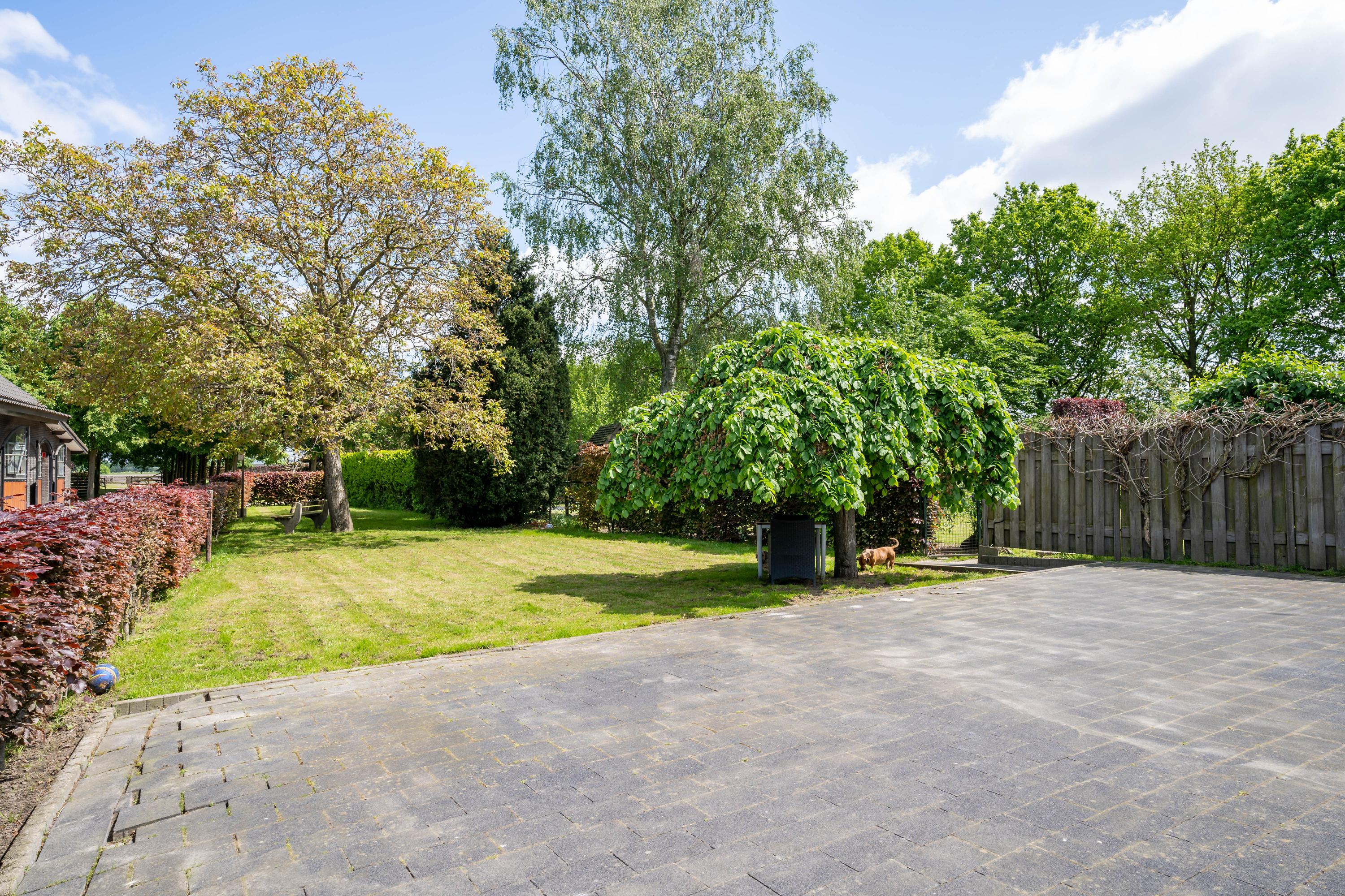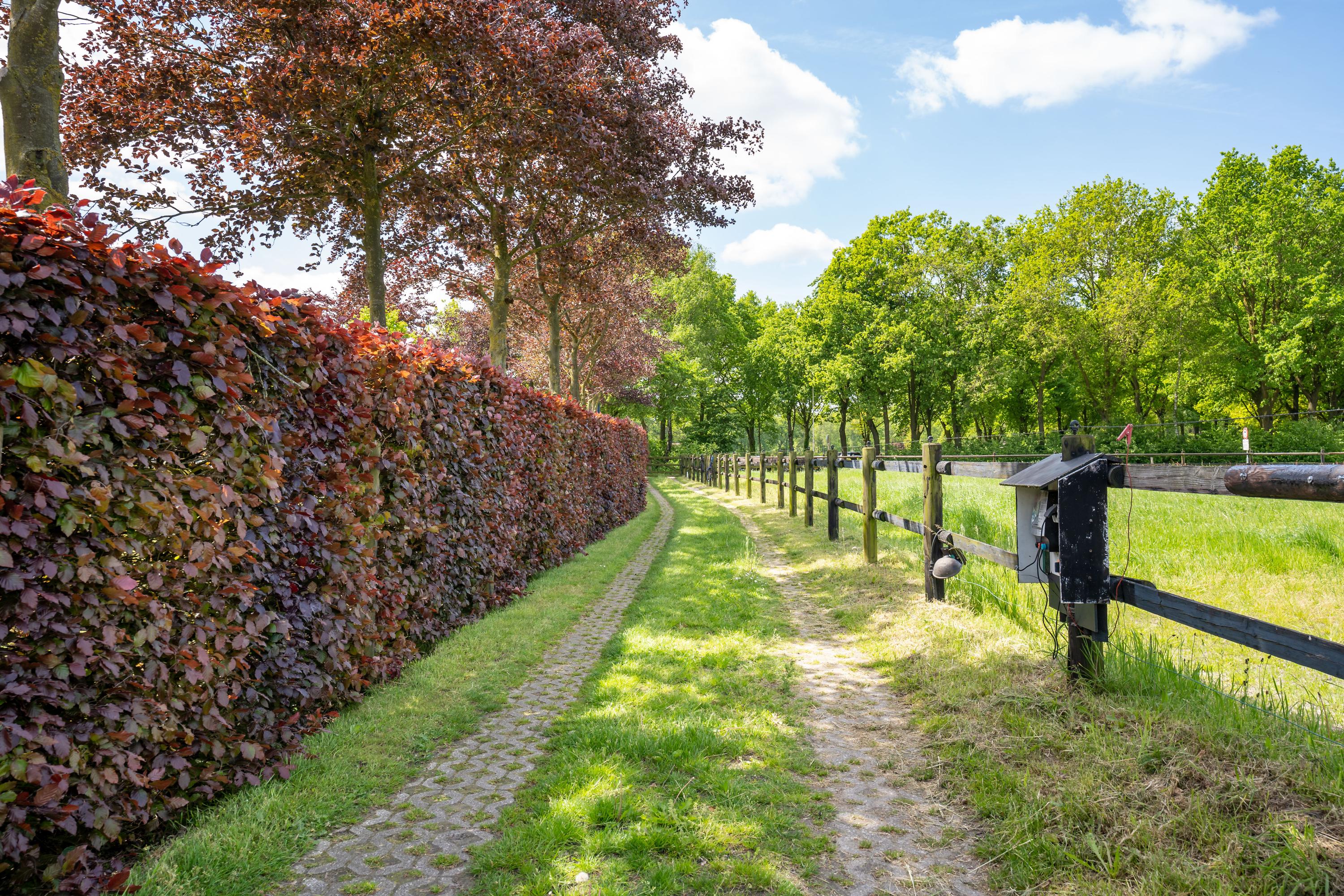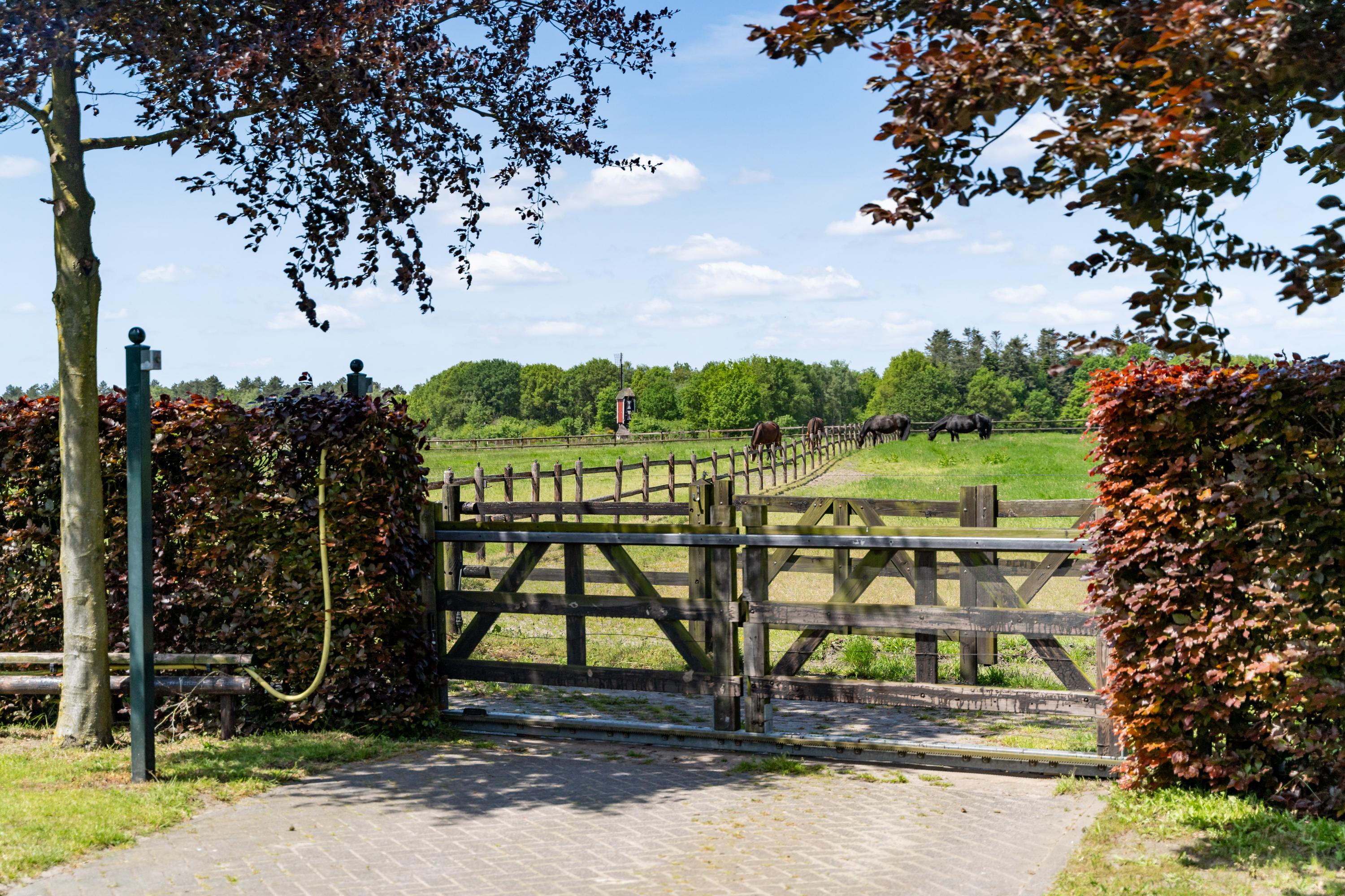 There are three paddocks, which have a sand floor and a wooden fence. The paddocks are also accessible via a rear entrance to the plot. The surrounding meadows are also fenced with wood.