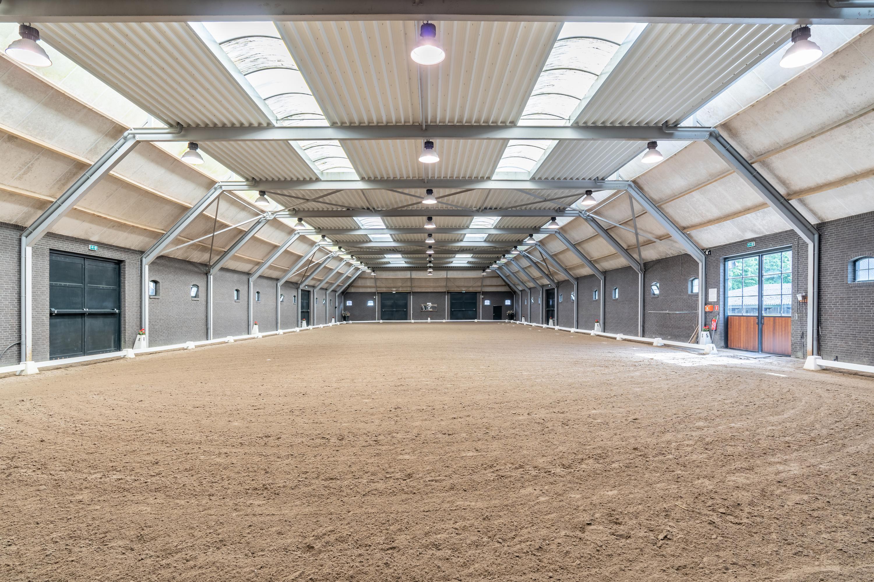 The detached riding hall is constructed of masonry facades with steel trusses. The roof of the fully insulated hall is covered with tiles. Various doors in the front, side and rear façades provide access to the yard from the indoor arena. Various windows and skylights in the roof provide plenty of natural light. LED lighting is also available. The riding hall is also equipped with mirrored walls.