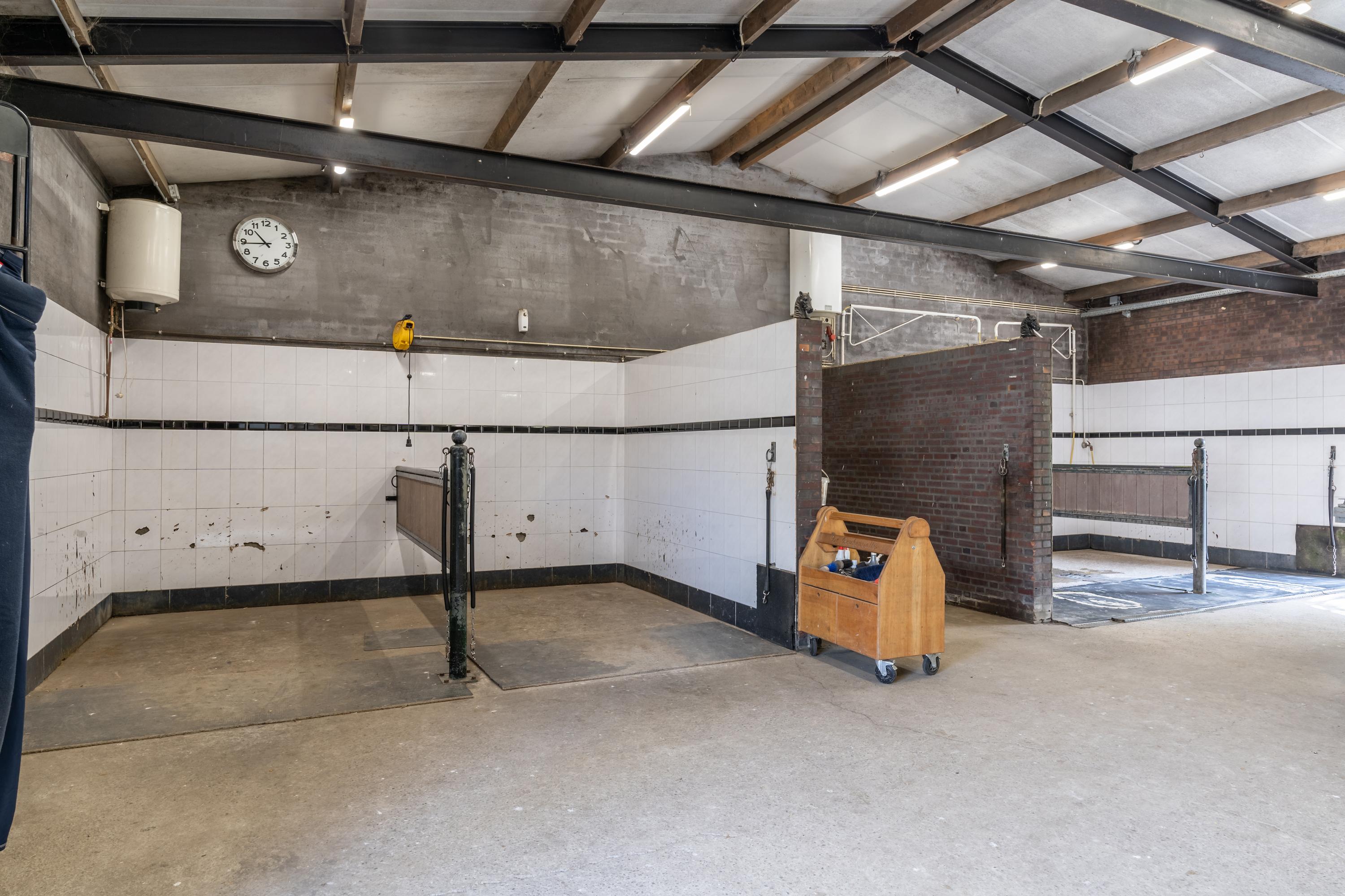 The horse stable is further divided into three units with a total of 20 horse stalls. The insulated stable is constructed of masonry with steel trusses and also has a tiled roof. French doors provide access to the yard from all units. In addition to 11 horse stalls, the first stable unit also has 4 washing areas, a tack room, a laundry room and a toilet. The stalls (approx. 4x4 metres) are equipped with partly plastic and partly galvanised front walls with sliding doors and brick partition walls. Six stalls have an outside hatch. Stable section II has six horse stalls (approx. 4x4 metres) with partly plastic and partly galvanised front walls with sliding doors and concrete partition walls. The unit also features attractive wooden trusses. The third stable section has 3 more stalls, all of which have an outside hatch. The stalls have partly plastic and partly galvanised front walls with sliding doors and concrete partition walls.