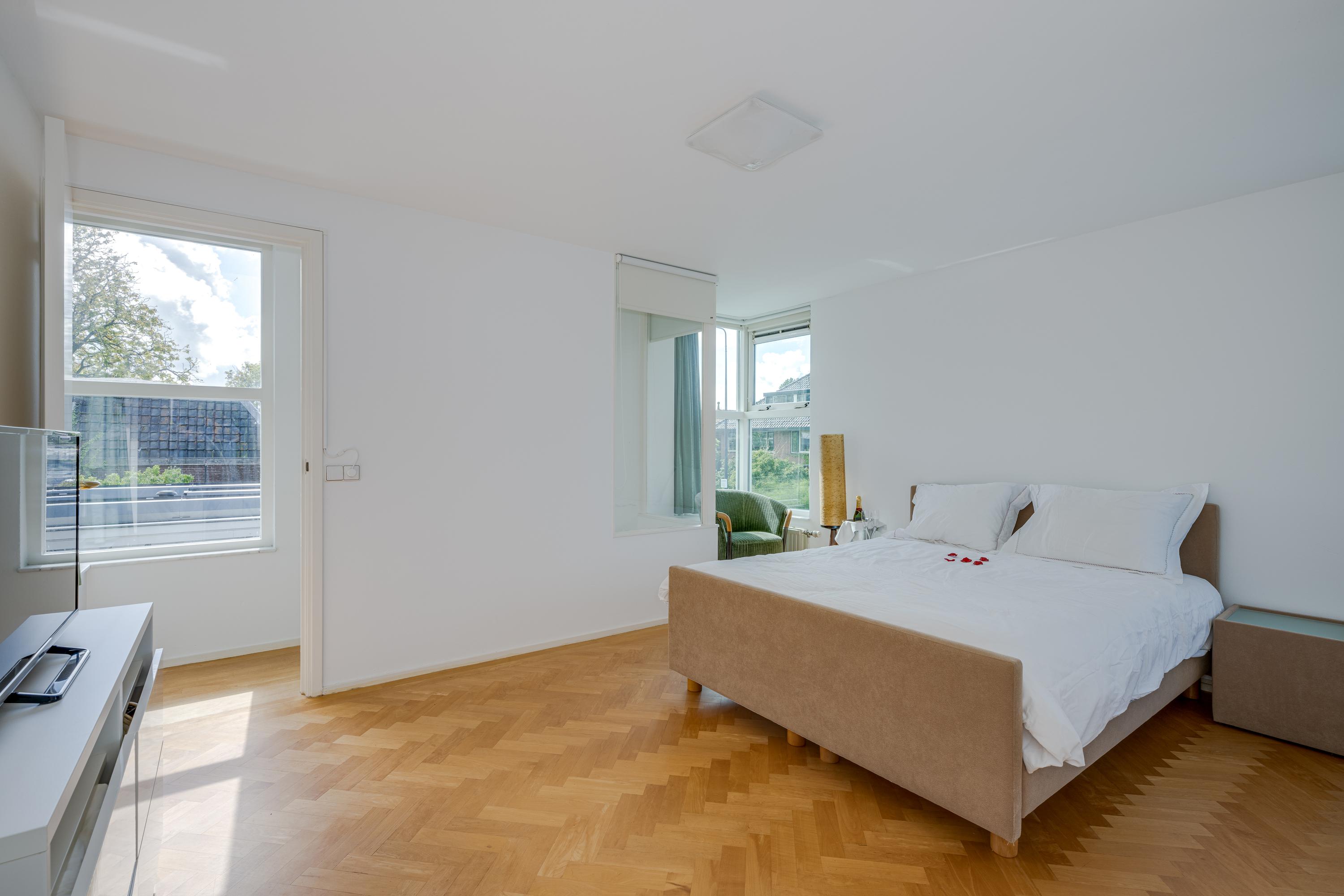 Upstairs, four serene bedrooms offer leafy, water-facing perspectives; the master suite includes a walk-in wardrobe and a refined bathroom featuring granite floors, underfloor heating, a sunken bath, sauna, and Turkish bath. Three bathrooms in total assure comfort and privacy. The estate’s boathouse allows effortless river access, opening leisure to the waterways of De Kaag and the Groene Hart.