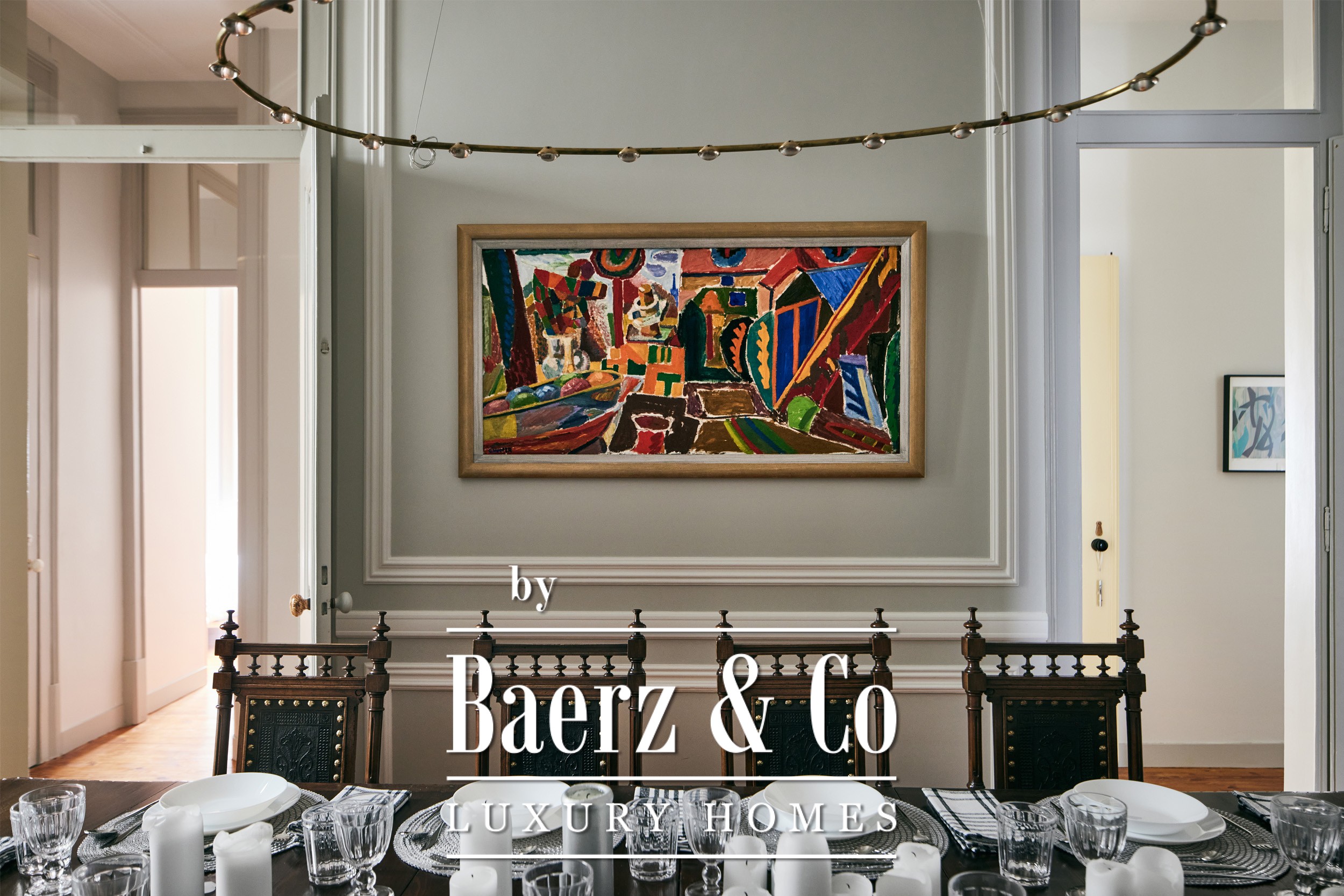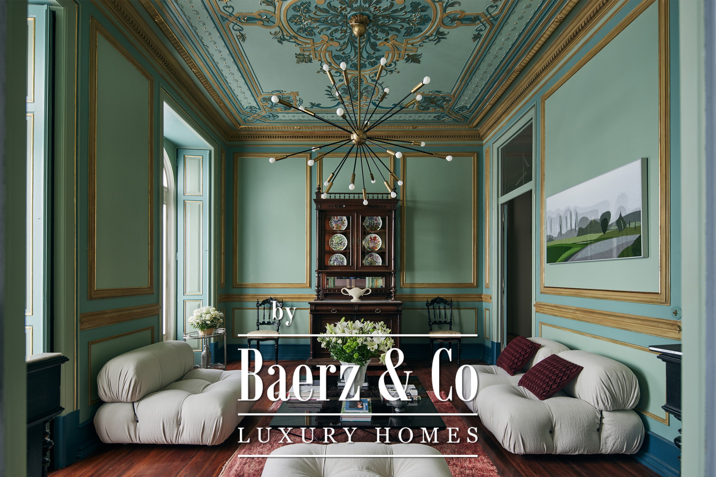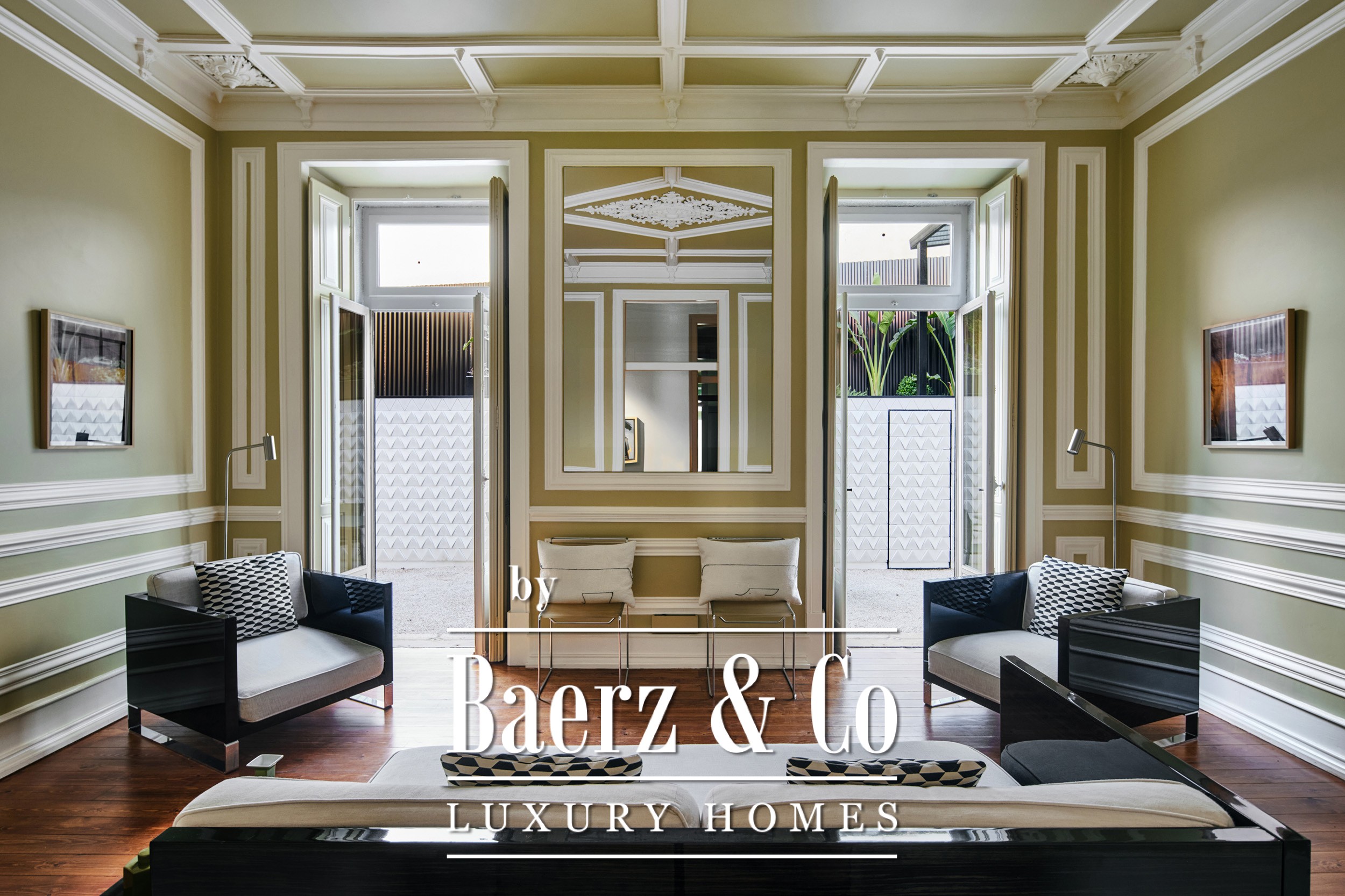 Centenary Townhouse on Rua Antero de Quental – LisbonA 444m² semi-detached townhouse spread across four floors, located on Rua Antero de Quental, in an evolving urban area where tradition meets modern living. Built in 1901, the property has been carefully restored, preserving original features such as ornate stucco, wood paneling, and noble marble, complemented by a curated mix of modern furnishings and antique Portuguese pieces.With three independent street entrances, this house offers multiple usage options:A mezzanine level with an independent apartmentA ground-floor studio ideal for an atelier, gym, or creative workspaceThe main entrance leading to the principal living areasThe main floor includes eleven distinct rooms: a living room, dining room, two bedrooms, office, garden room, kitchen