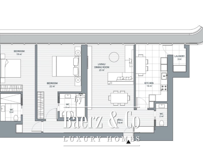 Each of the two en-suite bedrooms is thoughtfully proportioned, the first at 22 m² and the second at 19 m², both complemented by bathrooms of 5 m² and built-in wardrobes for discreet storage. The kitchen, fully equipped and covering 16 m², is complemented by a separate laundry room and a guest bathroom, distilling function and contemporary design.