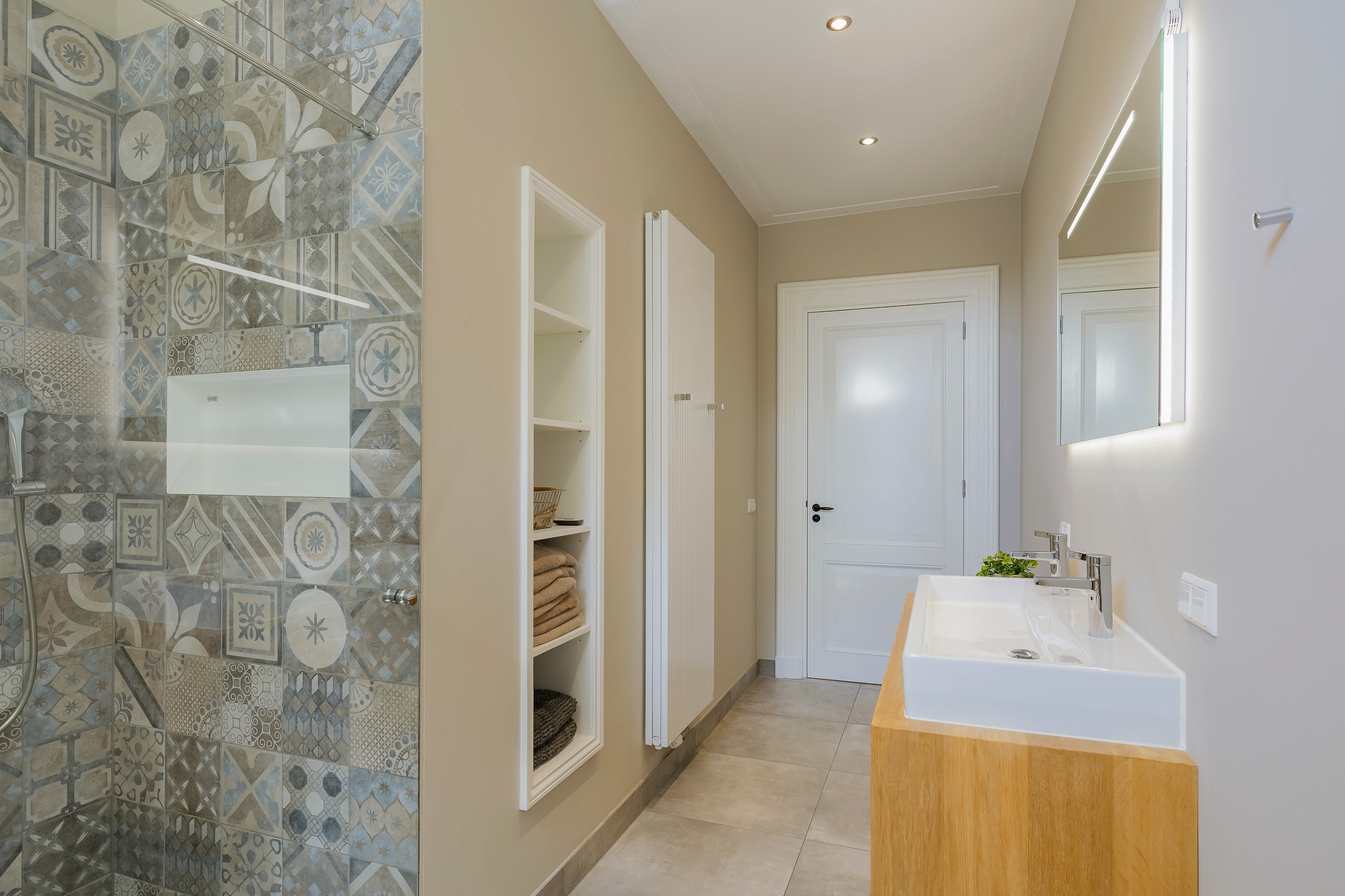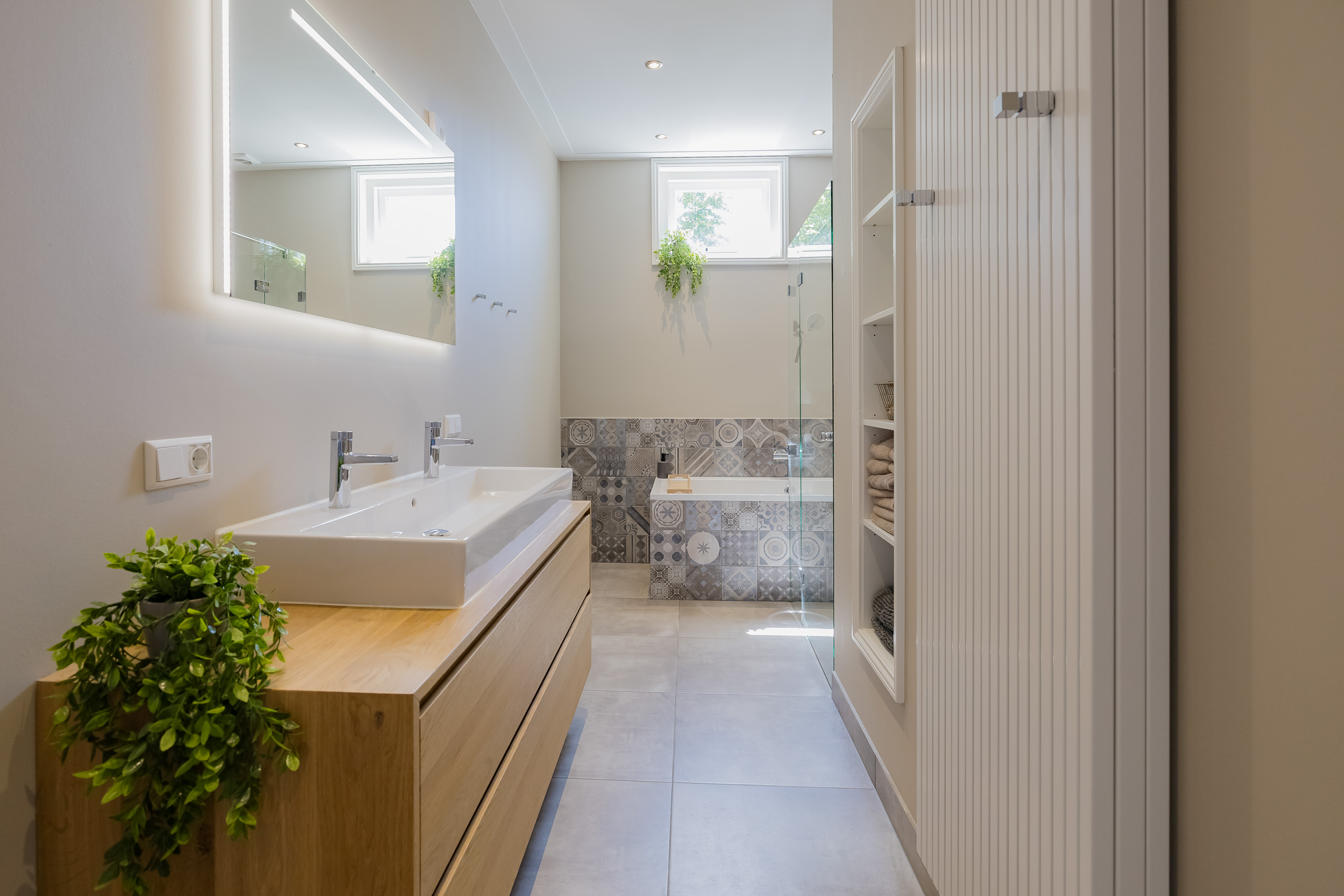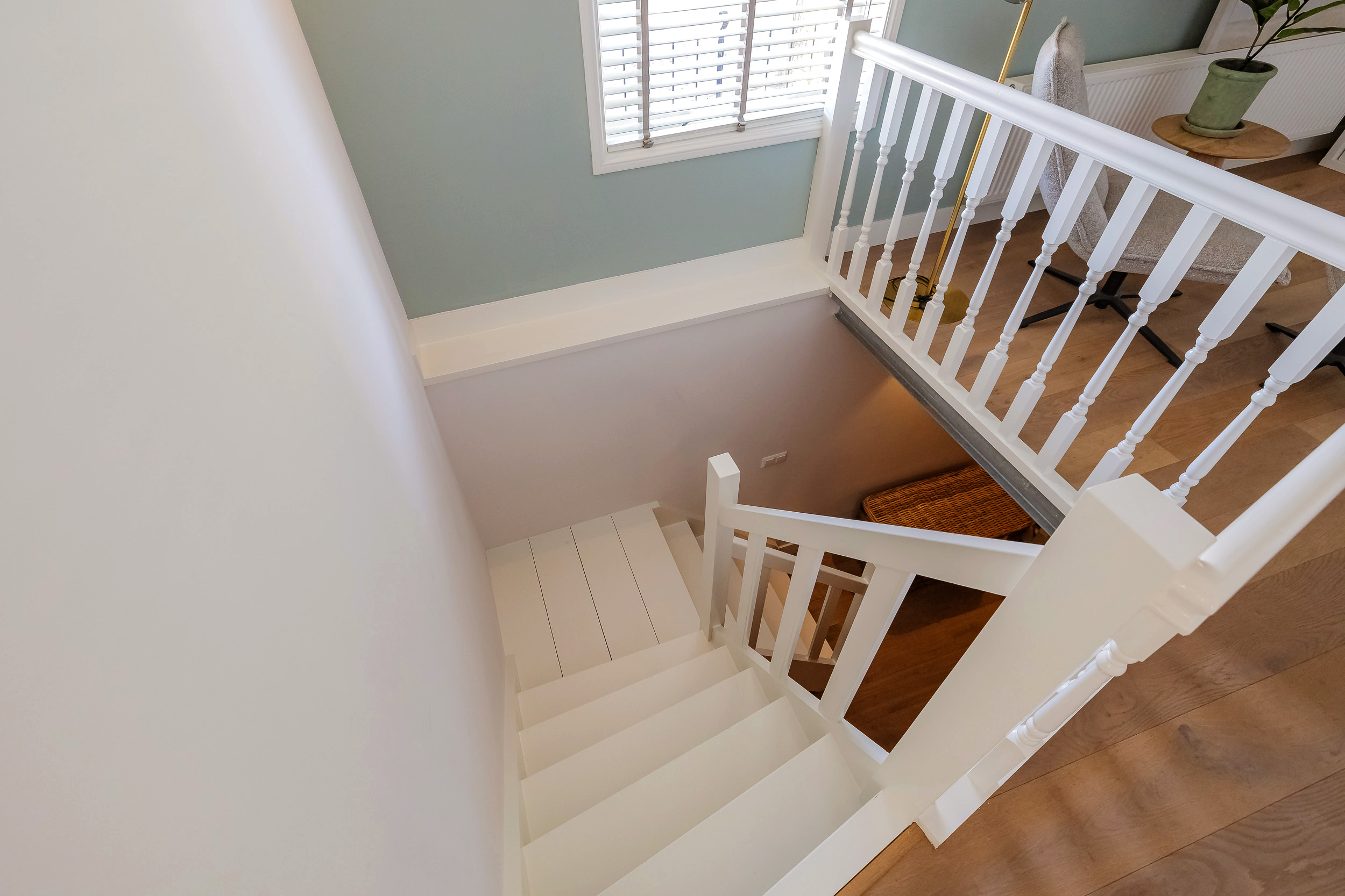 Beautiful porch in which the striking high front door, imposing long hall with the restored authentic granito floor, checkroom and toilet room and a door to the garden. To the left of the hall a very spacious living/living kitchen with luxury kitchen design in matte white, beautiful cooking and sink island with wooden breakfast bar and all appliances including a beautiful wine refrigerator. Also a cozy gas fireplace and the large rear facade with lots of glass and French doors to the garden are not lacking. To the right of the hall there is a TV/sitting room with a gas fireplace and double doors give access to the upstairs room. This upstairs room with a large custom-made closet wall is very suitable as a play/or work room and has a staircase to the large dry cellar with standing height. In the former cell complex is a beautiful study created, a storage room, a technical room and there is one cell preserved in its original state. The indoor garage is large and includes an electric segment door with wicket door and a fixed staircase to spacious storage attic.