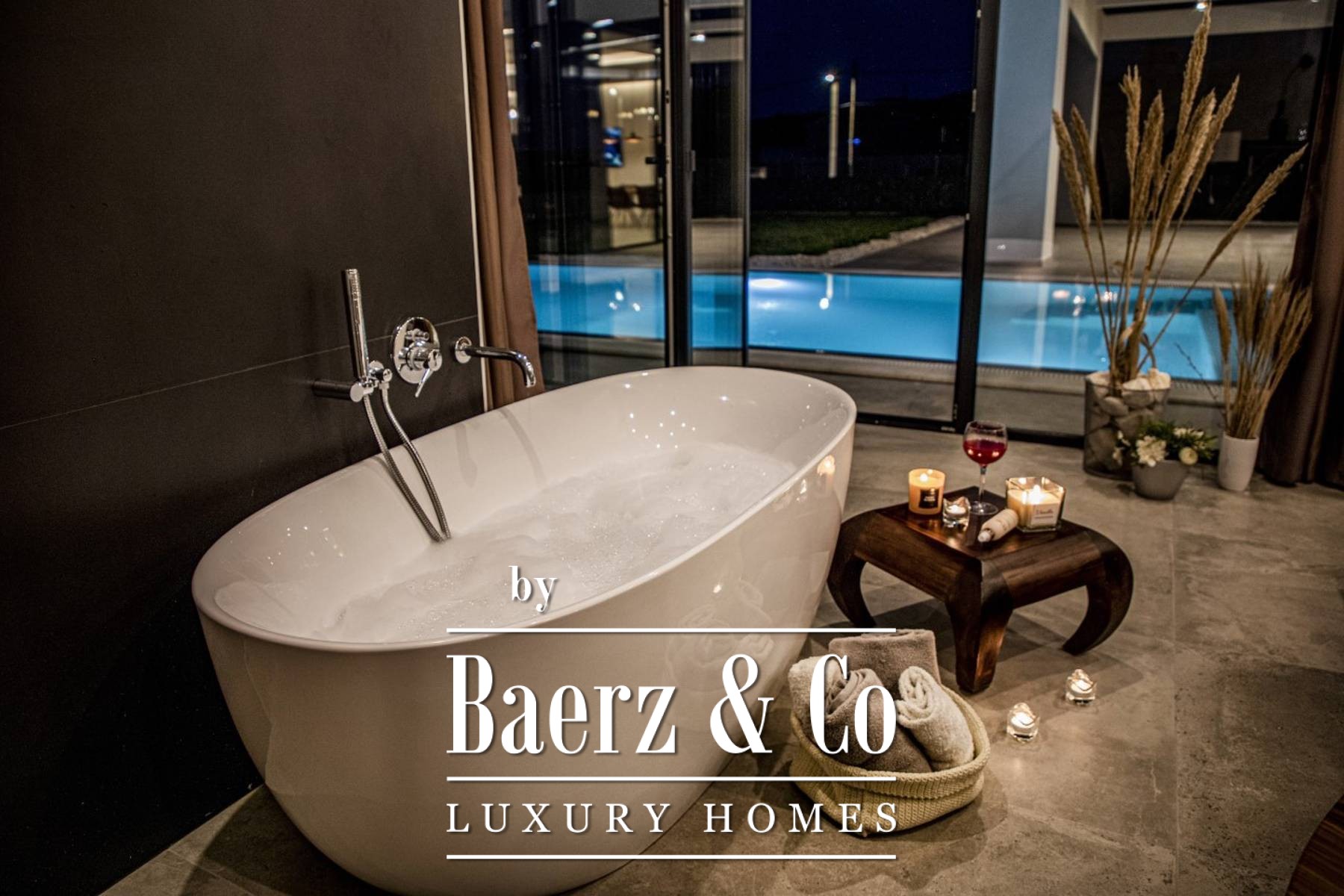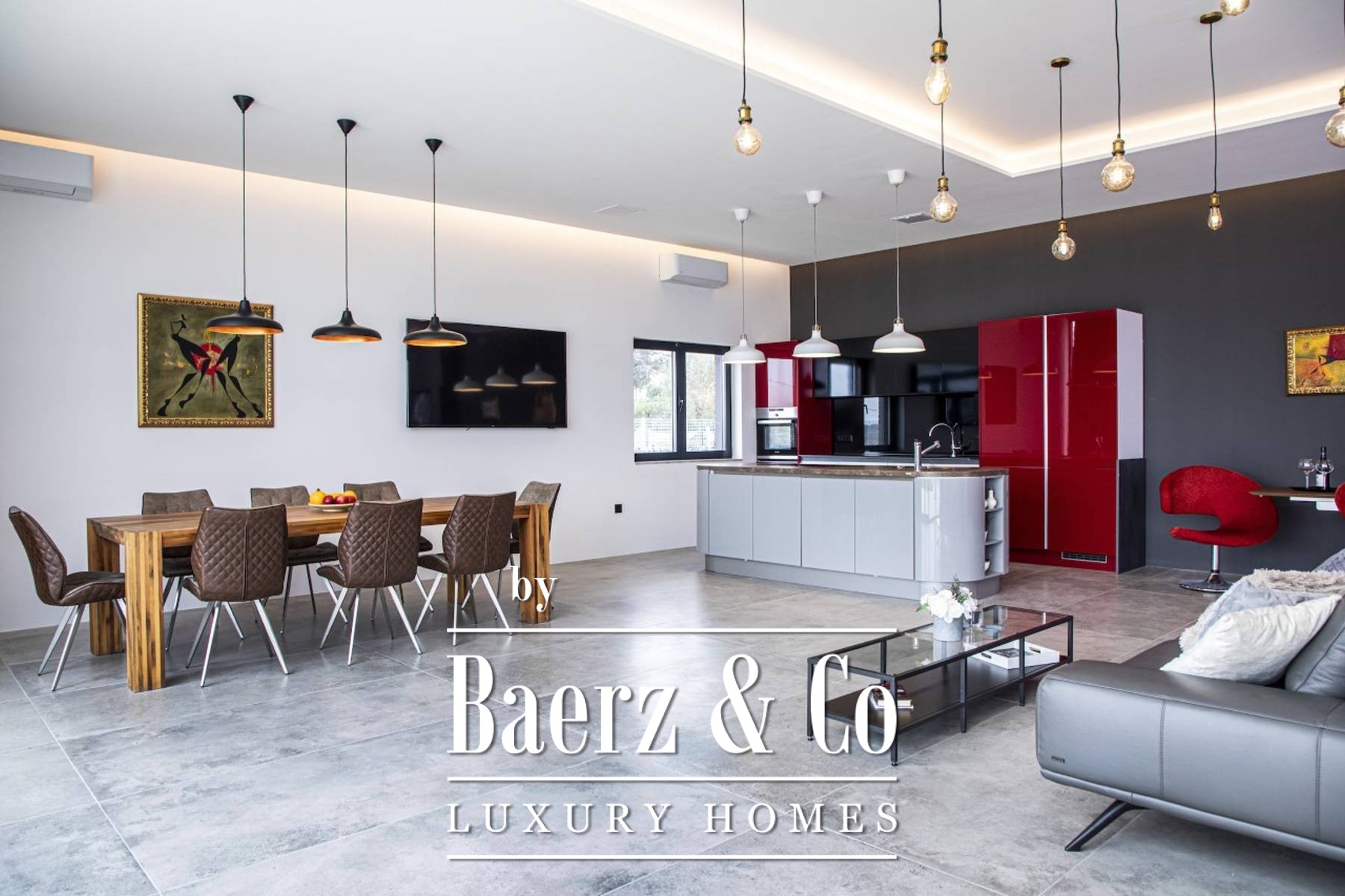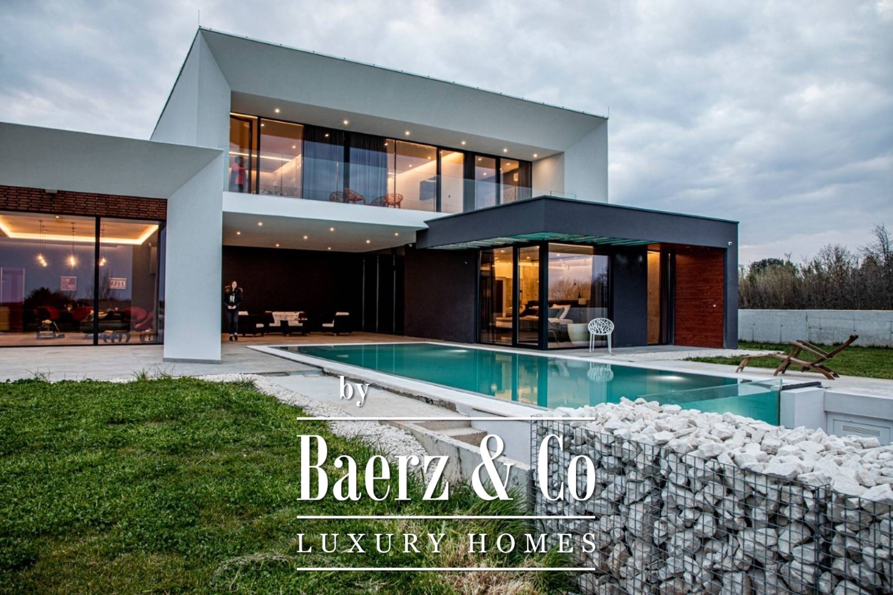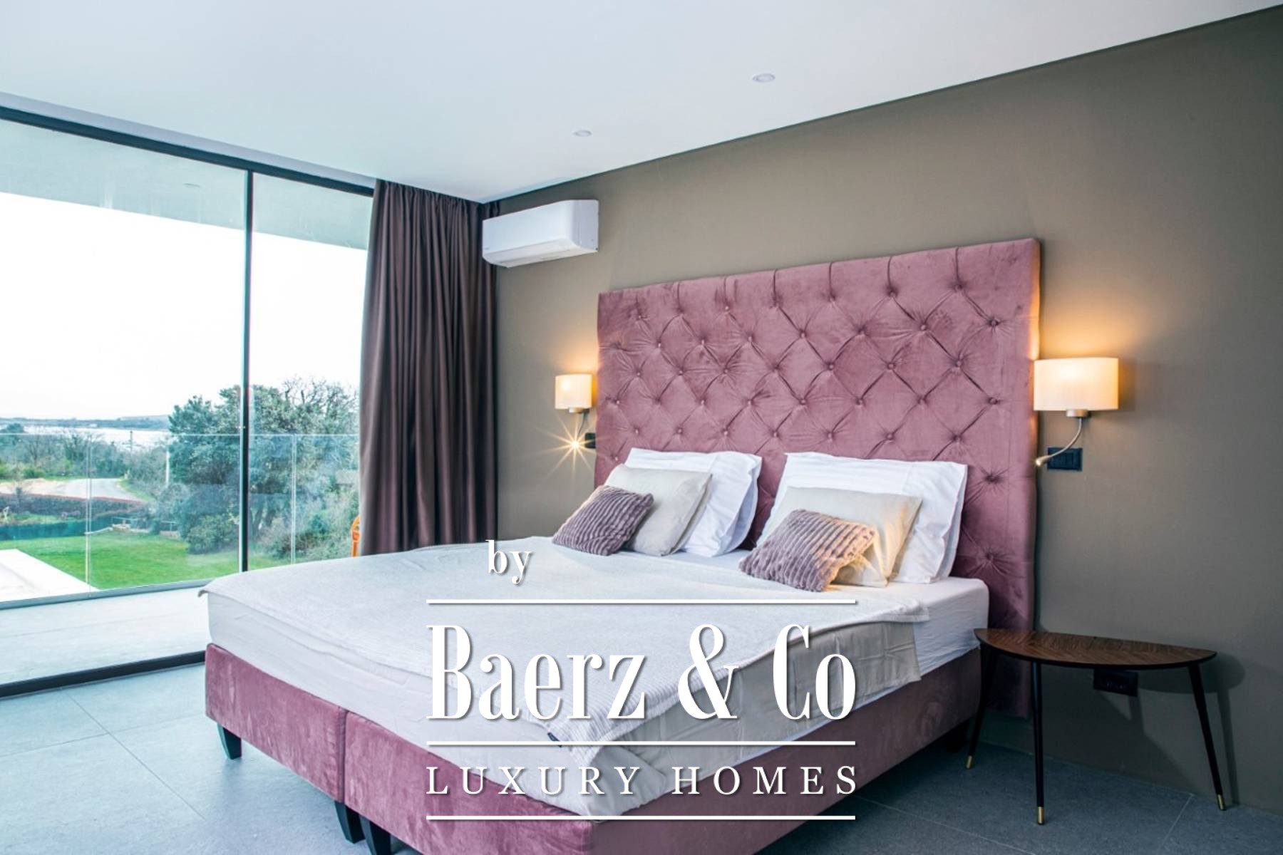 In the southernmost part of Istria, only 460 m from the sea, a luxury villa with a swimming pool is for sale. High quality new construction. Only top quality materials used. Built according to the latest trends in construction. This exclusive villa is divided into two floors - ground floor and first floor. There are almost no partition walls on the ground floor (except for the bedroom). From the open space of the living room with kitchen, the view of the pool extends through glass walls 3.40 m high, double-glazed and with gas. The interior is without walls, so the house seems to be floating in the air. The first floor is reached by stairs that come out of the wall and they also seem to float in the air. There are 8 bars with reinforcement in each step. Upstairs are 3 bedrooms each with a private bathroom with walk-in shower enclosures with Optishower glass walls (do not retain scale for easier cleaning). Each room has glass walls through which they have a sea view. The roof is flat, with 20-28 cm XPS insulation. It can be walked on. It has Hoffmann foil + gravel. The foundations are a 55 cm slab with reinforcement.
