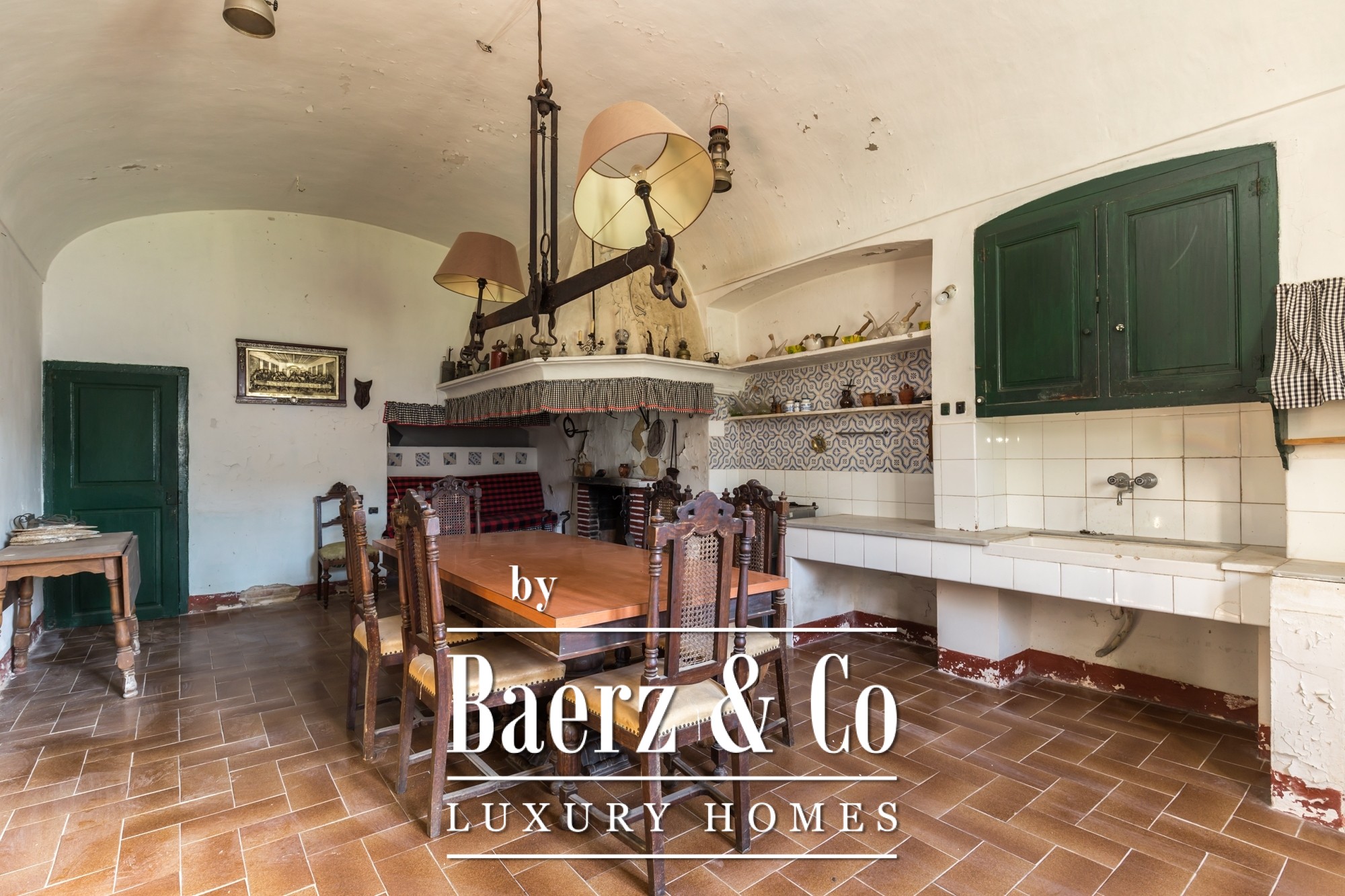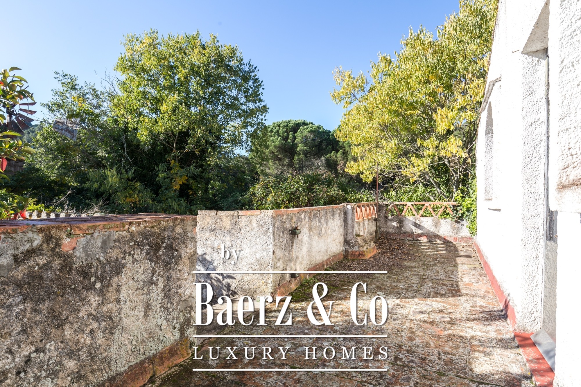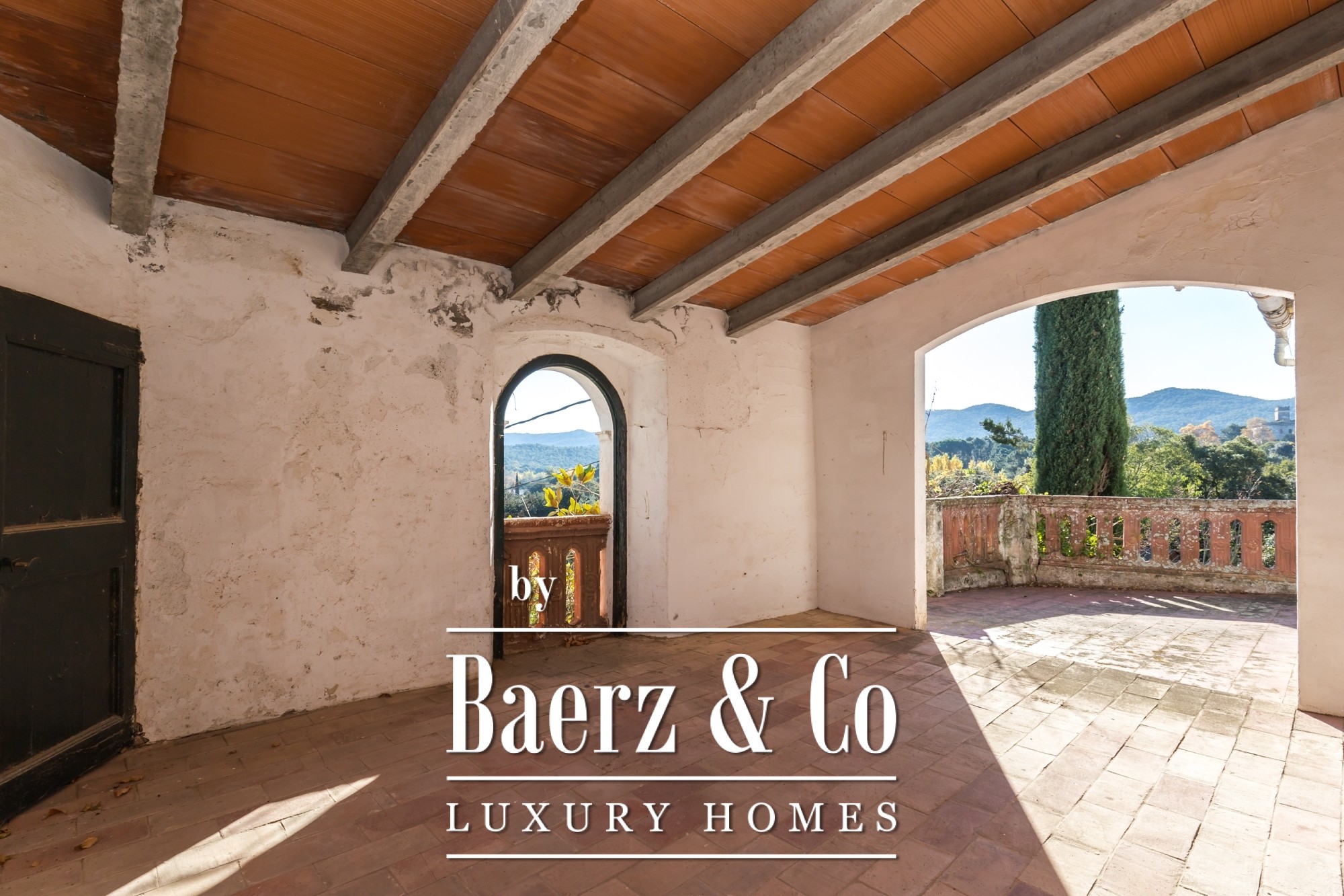 The main residence features seven bedrooms and four bathrooms, with suites on the upper level offering private terraces and sweeping vistas. High ceilings, light-filled rooms, and original architectural details reflect its historical character. There are two dining and living rooms, a voluminous family kitchen, and an office-library connecting to a serene private garden. Generous storage and auxiliary buildings convey practical flexibility.