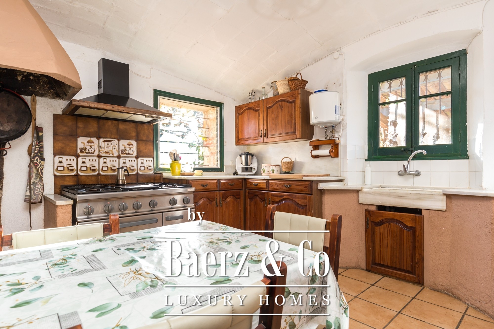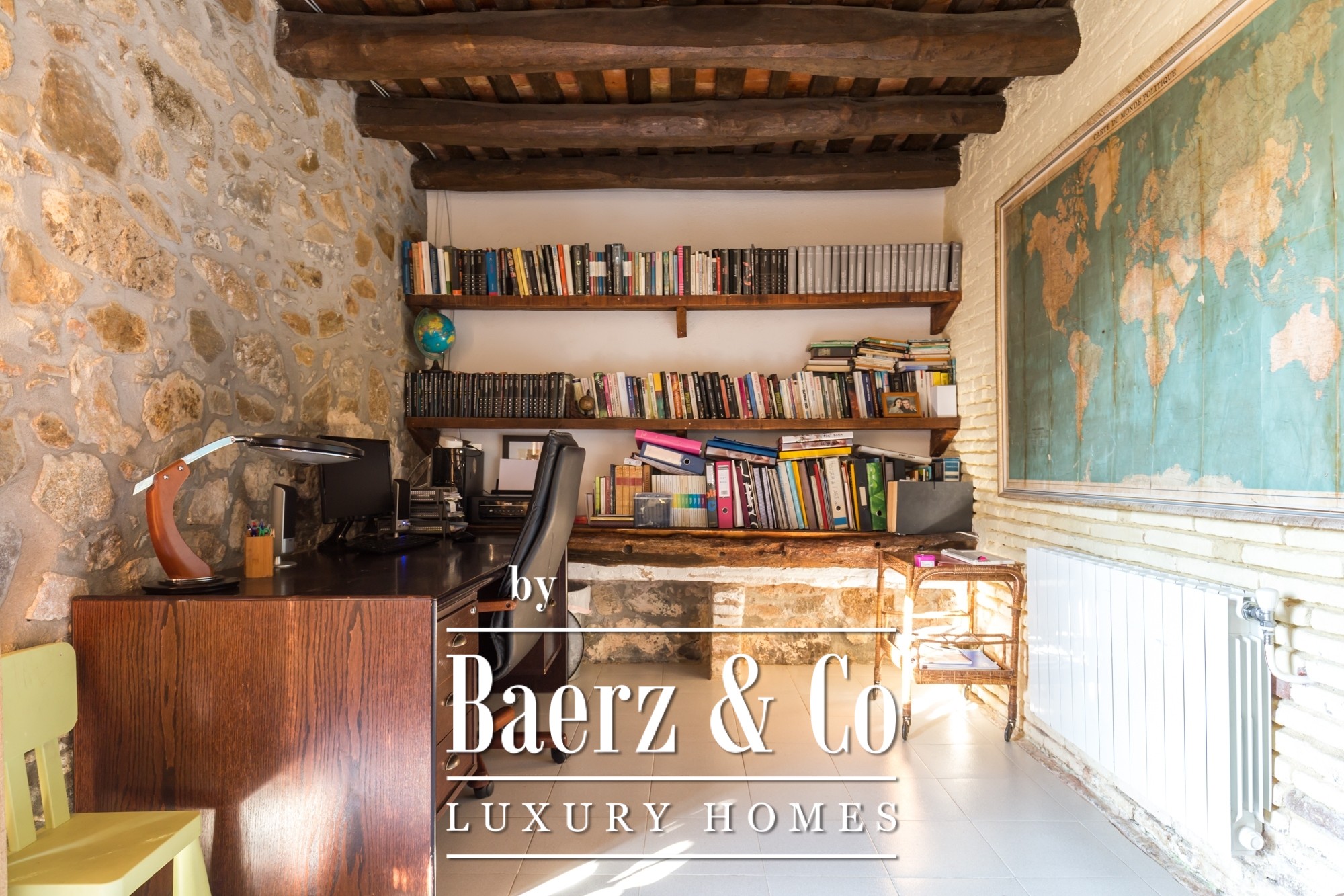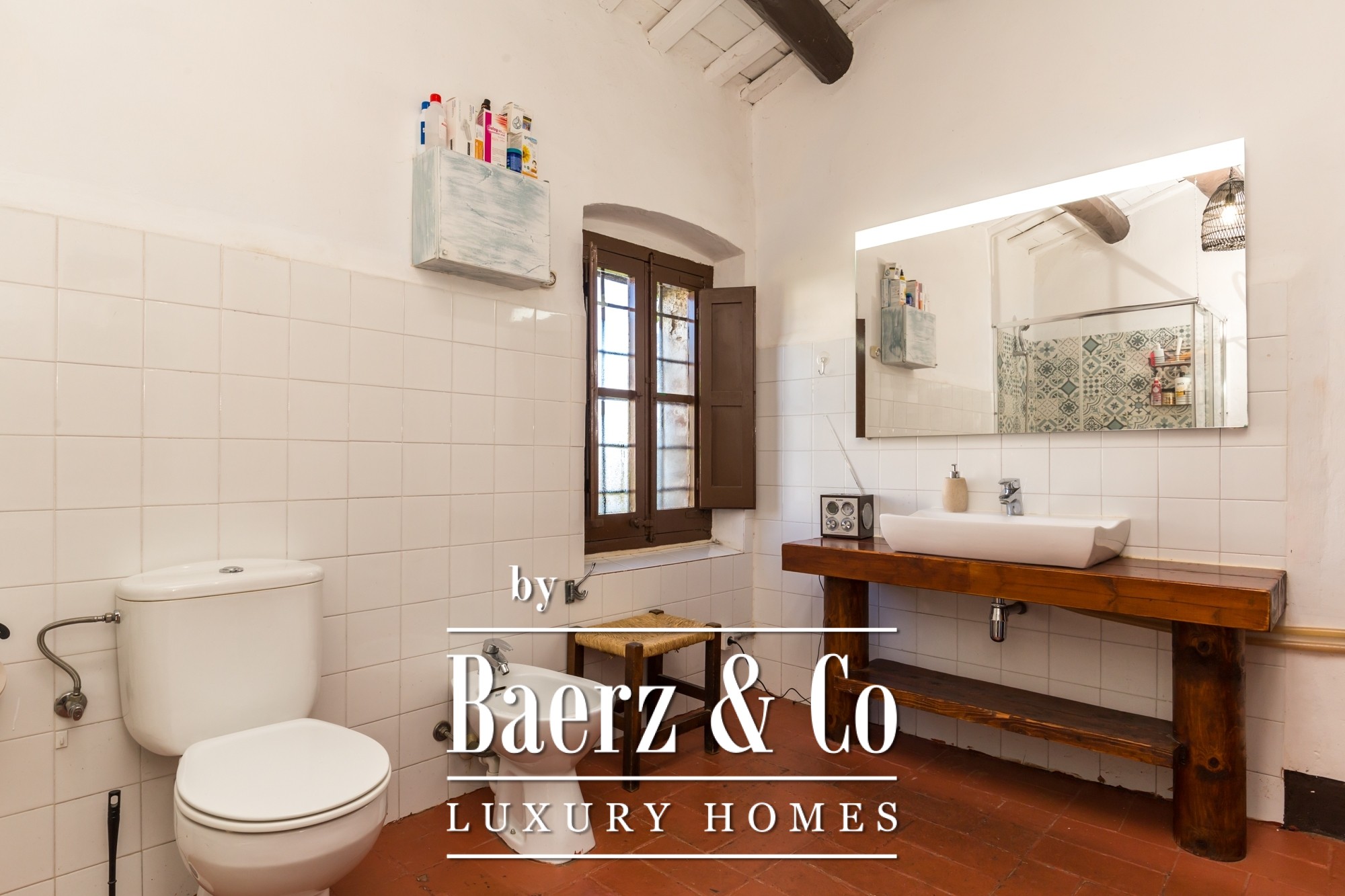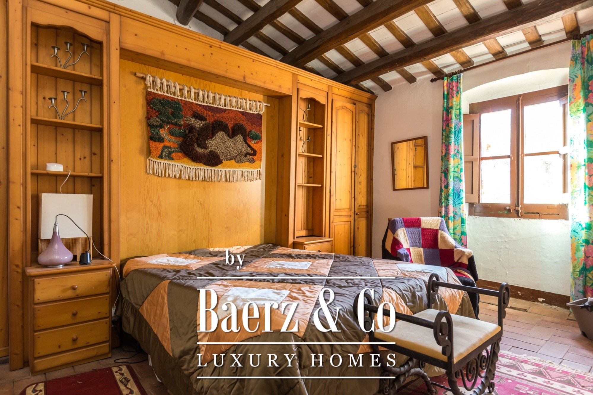 The main residence features seven bedrooms and four bathrooms, with suites on the upper level offering private terraces and sweeping vistas. High ceilings, light-filled rooms, and original architectural details reflect its historical character. There are two dining and living rooms, a voluminous family kitchen, and an office-library connecting to a serene private garden. Generous storage and auxiliary buildings convey practical flexibility.