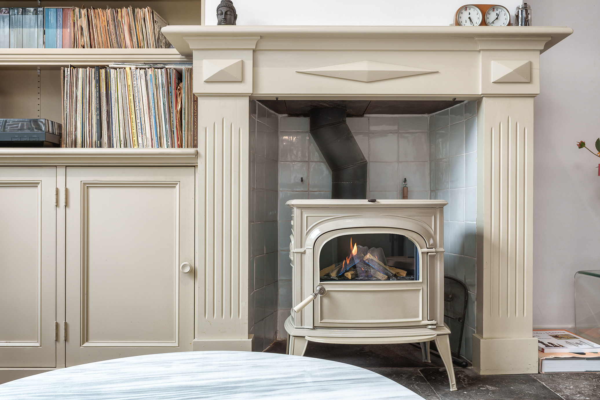 On the right-hand side, you enter the living room. This fairly deep space is therefore used in two parts. The front part (street side) is now a lovely space where the grand piano stands. The rear of this living room is a lovely, cosy sitting/living area. This living room is located at the rear (garden side) and has a large sliding window for wonderful light and a view of the courtyard garden. This living room also has a cosy wood-burning stove and, once again, a beautiful beamed ceiling. An antique French terracotta tiled floor that continues into the living-dining kitchen perfectly matches the monumental character of the house.