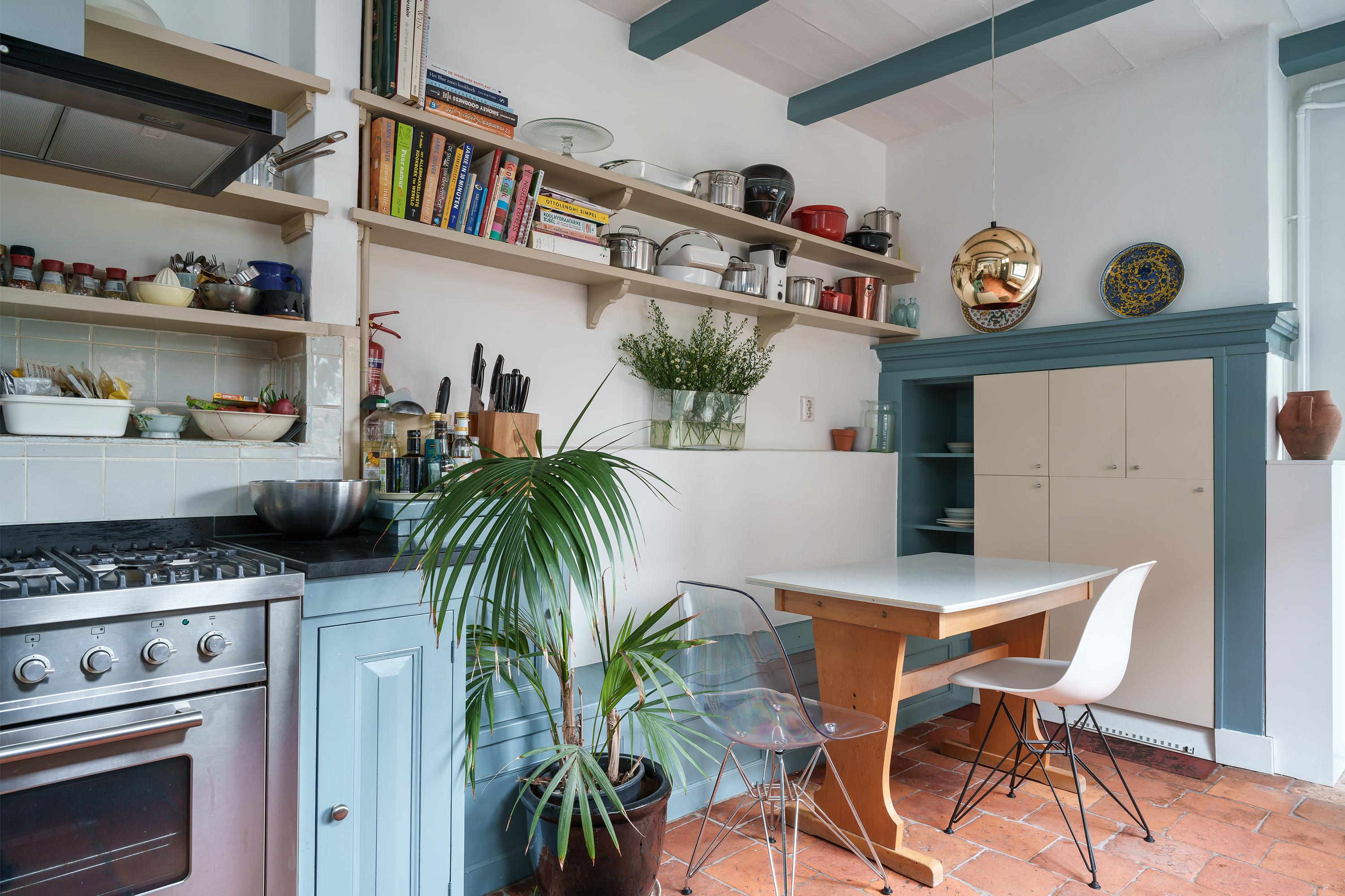 The country-style kitchen is equipped with a Quooker and a gas stove with oven and is directly connected to the living area and also to the central hall. This makes this space the real central living area of the house. A fixed dining bench has been installed here, creating a cosy dining area. The kitchen also has built-in cupboard space. From the kitchen, you have access to the outdoor area and the adjoining study. A nice detail: the beautiful façade in this kitchen, which features an old farmhouse door (two parts that open) with a skylight, beautiful old hinges and locks, and windows that provide plenty of light and, above all, atmosphere.