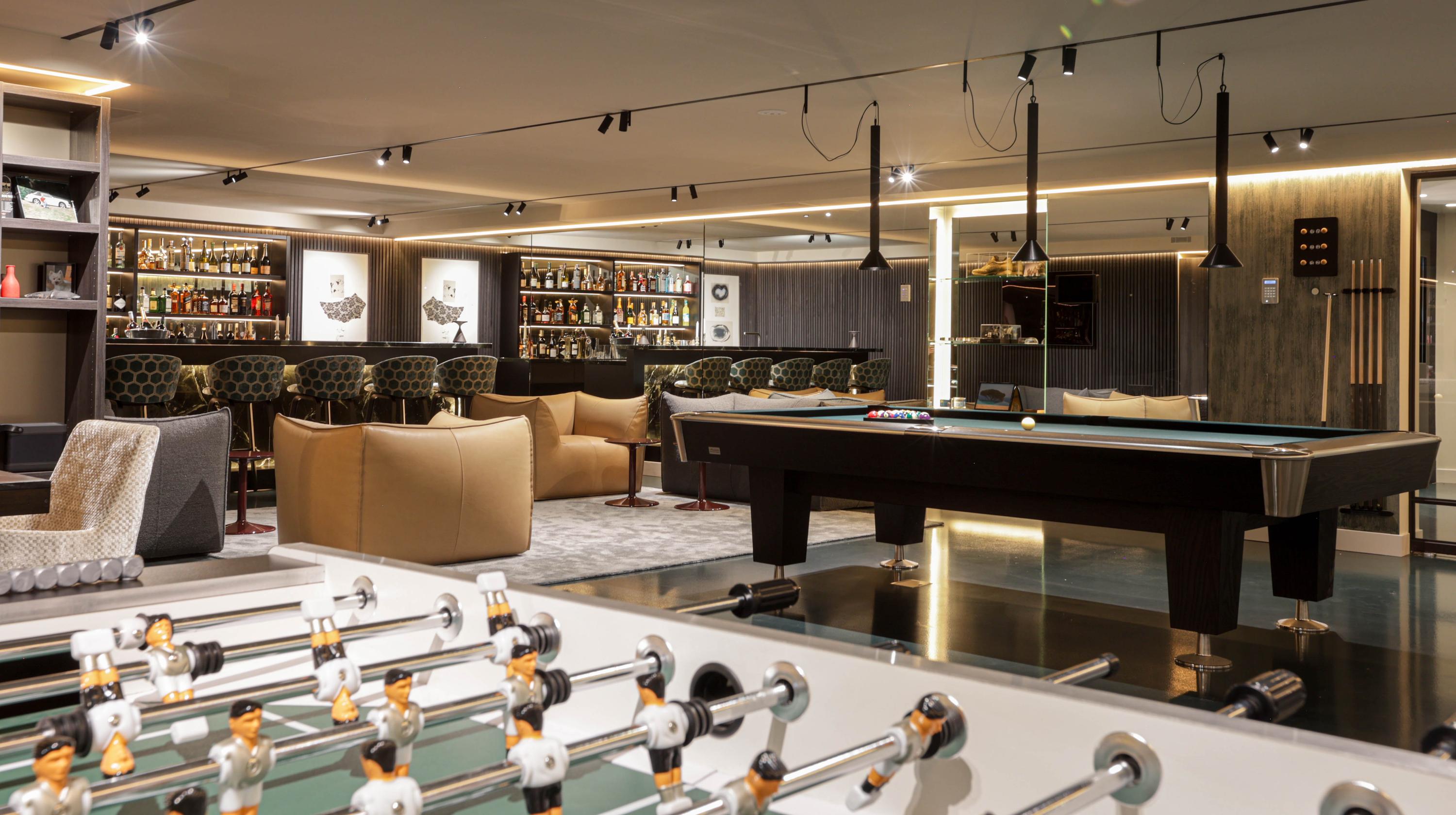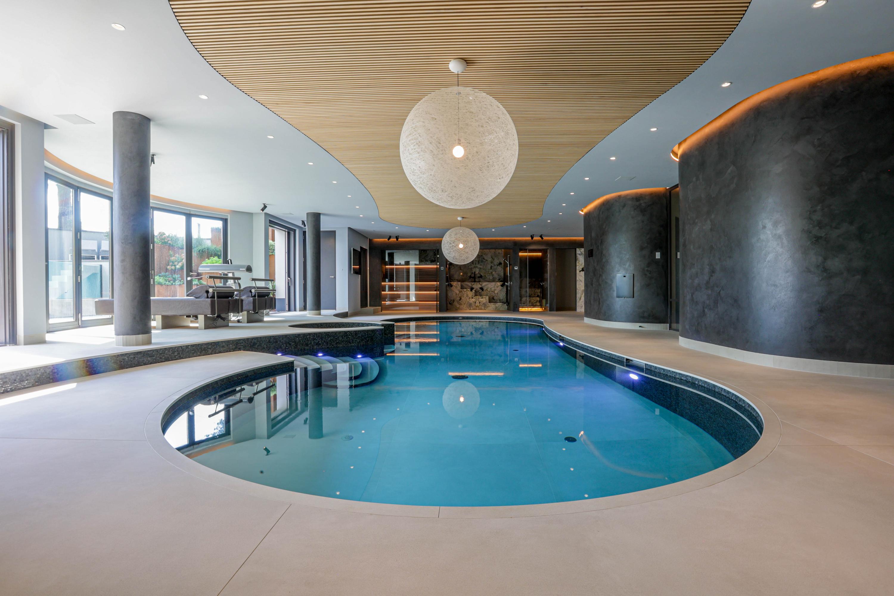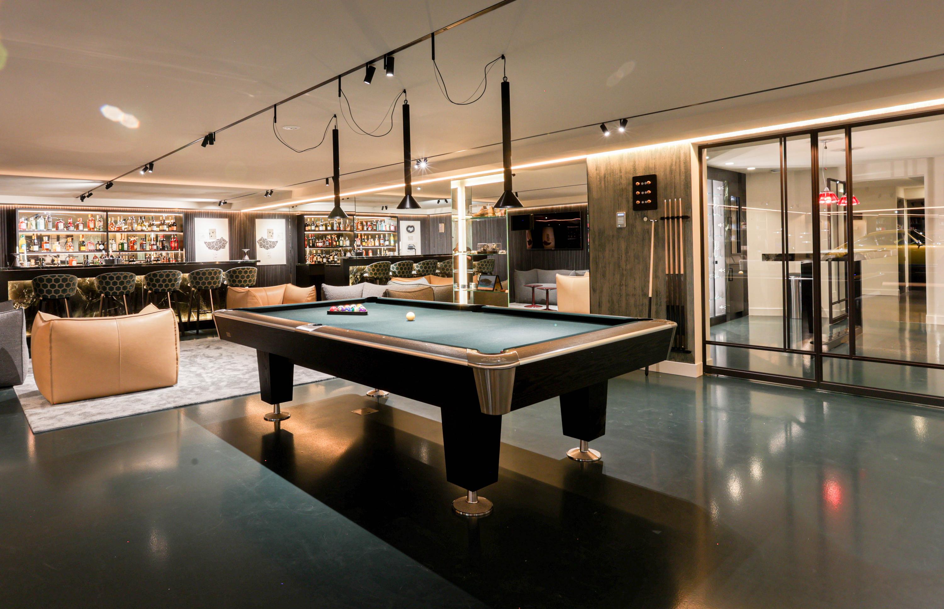 Wellness is integrated at every turn, from the indoor spa with sauna, cryotherapy, hammam, Jacuzzi, and fitness room to the infinity-edge outdoor pool framed for privacy. Entertaining is effortless, with a cinema, wine cellar, and generous bar lounge forming the social heart below. A high-spec garage—equipped for several vehicles, a car lift, and pampered with its own dog shower—caters to collectors and enthusiasts alike.