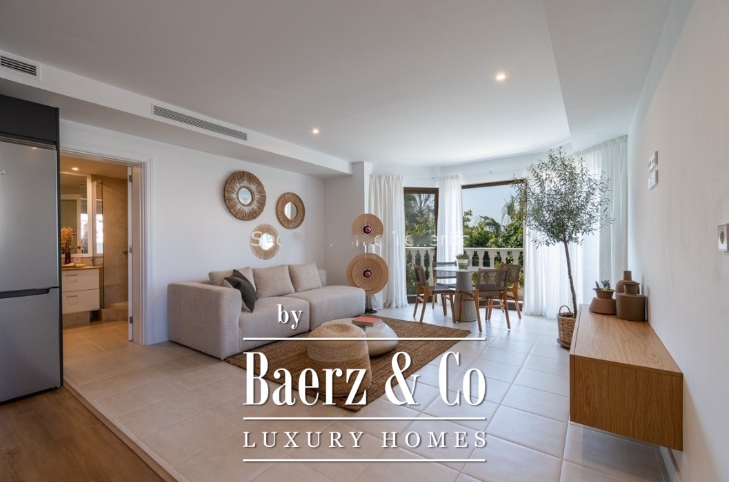 The interior layout includes two bedrooms and three bathrooms, a kitchen appointed with contemporary appliances, and a balance of indoor and private outdoor space. The property is delivered unfurnished, ready for personal interpretation, with completion scheduled for April 2026. Residents enjoy a communal heated swimming pool framed by sun terraces, a landscaped environment, a gym, storage room, and underground parking.