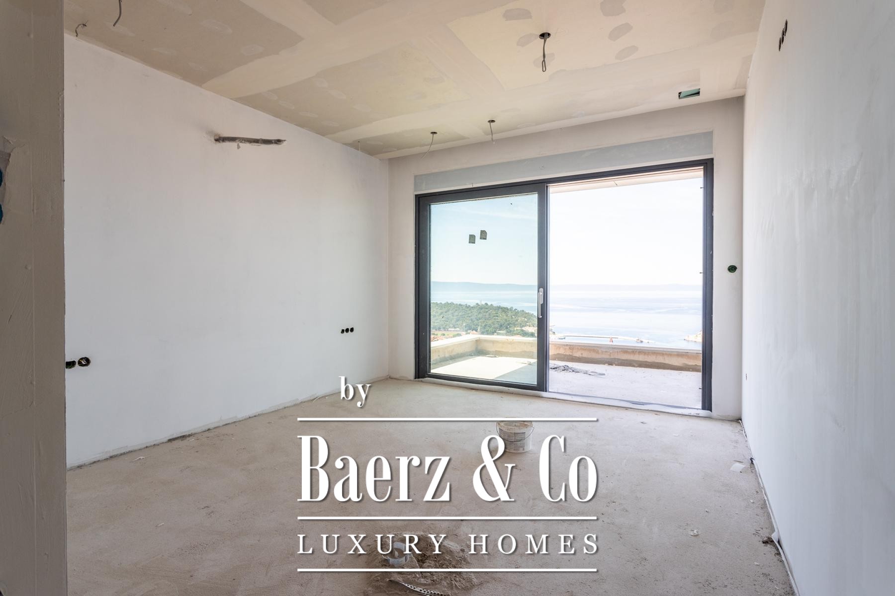 The floor-through apartment is thoughtfully divided into three en suite bedrooms, a spacious hallway, a pantry, laundry room, and an expansive living area that flows naturally to the outdoor spaces. The intelligent layout ensures each room is bathed in Adriatic light, enhancing the sense of calm and space. Smart home technology and underfloor heating via a heat pump, paired with quality air conditioning, bring comfort to every season. The selection of first-class parquet and ceramics, complemented by Schuco aluminum details, underlines a commitment to enduring quality.