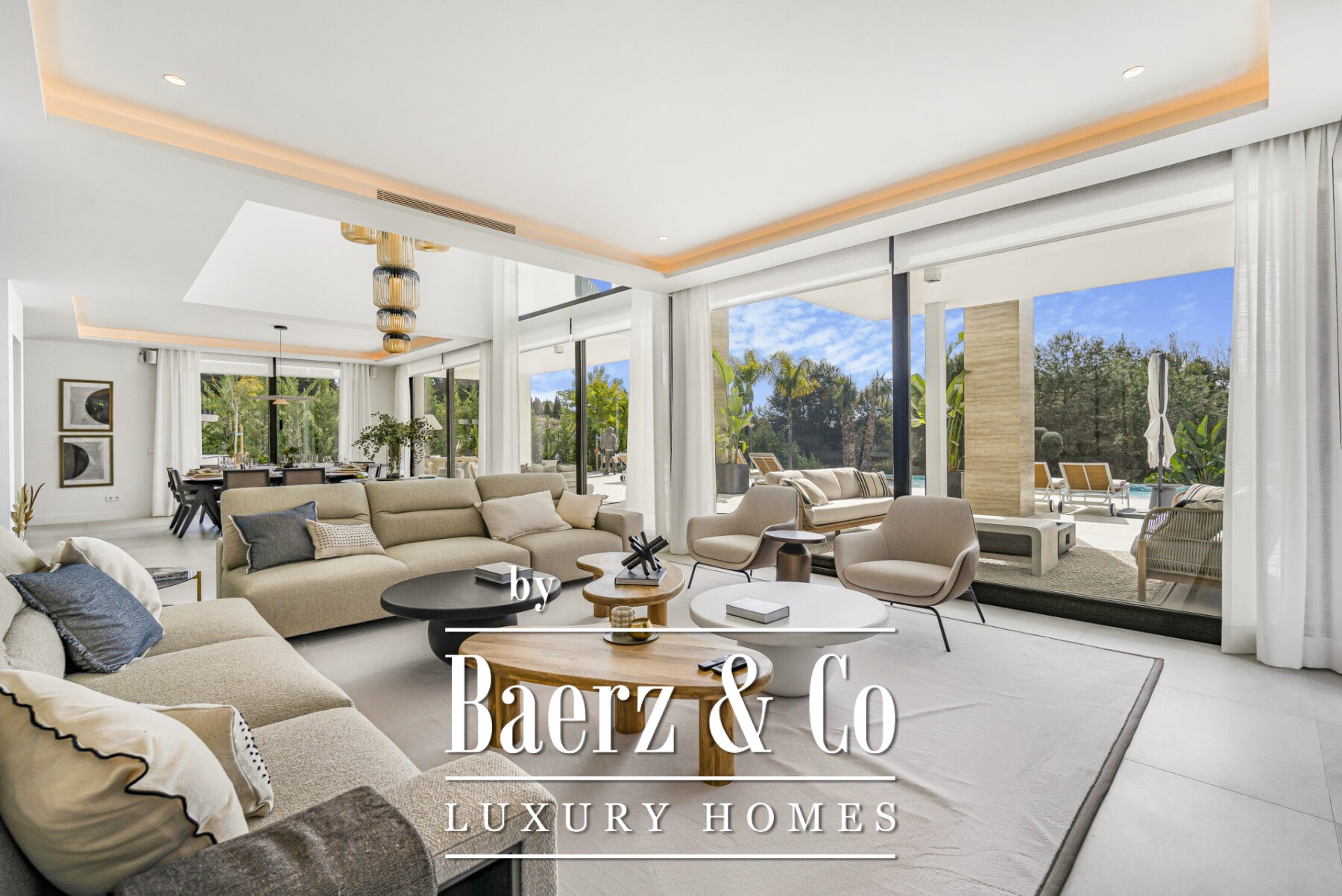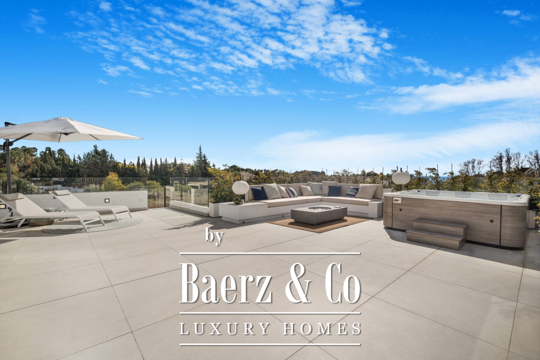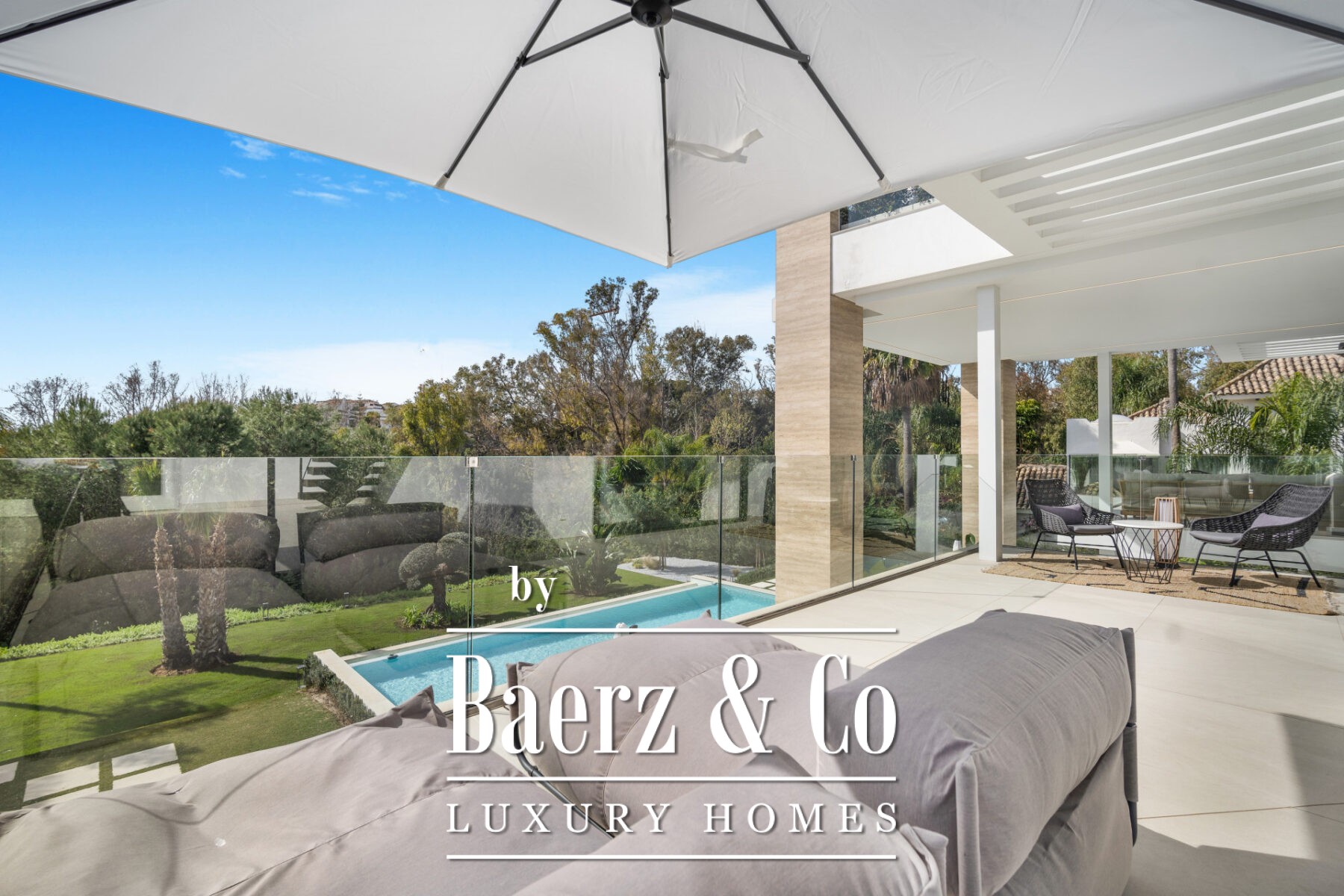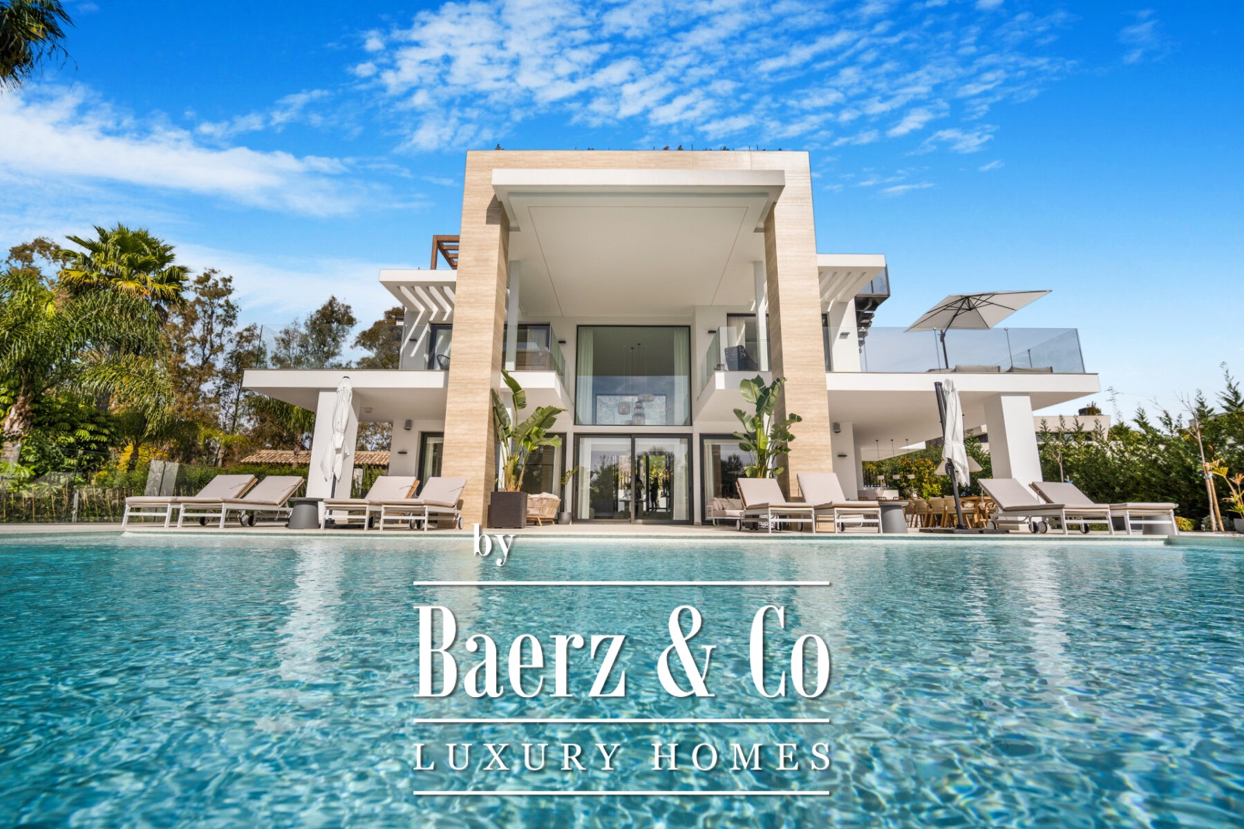 Brand new six bedroom, south facing villa in an exclusive gated community just above the Puente Romano on Marbella's Golden Mile; within easy walking distance to the beach and within east reach of both Puerto Banus and Marbella Town. This impressive property boasts an immaculate landscaped private garden complete with heated swimming pool; an open plan living and dining room with direct access to the garden; top of the range open plan kitchen; and a guest suite. The first floor has two guest suites; the luxury master suite with walk in wardrobe and a private terrace; also from