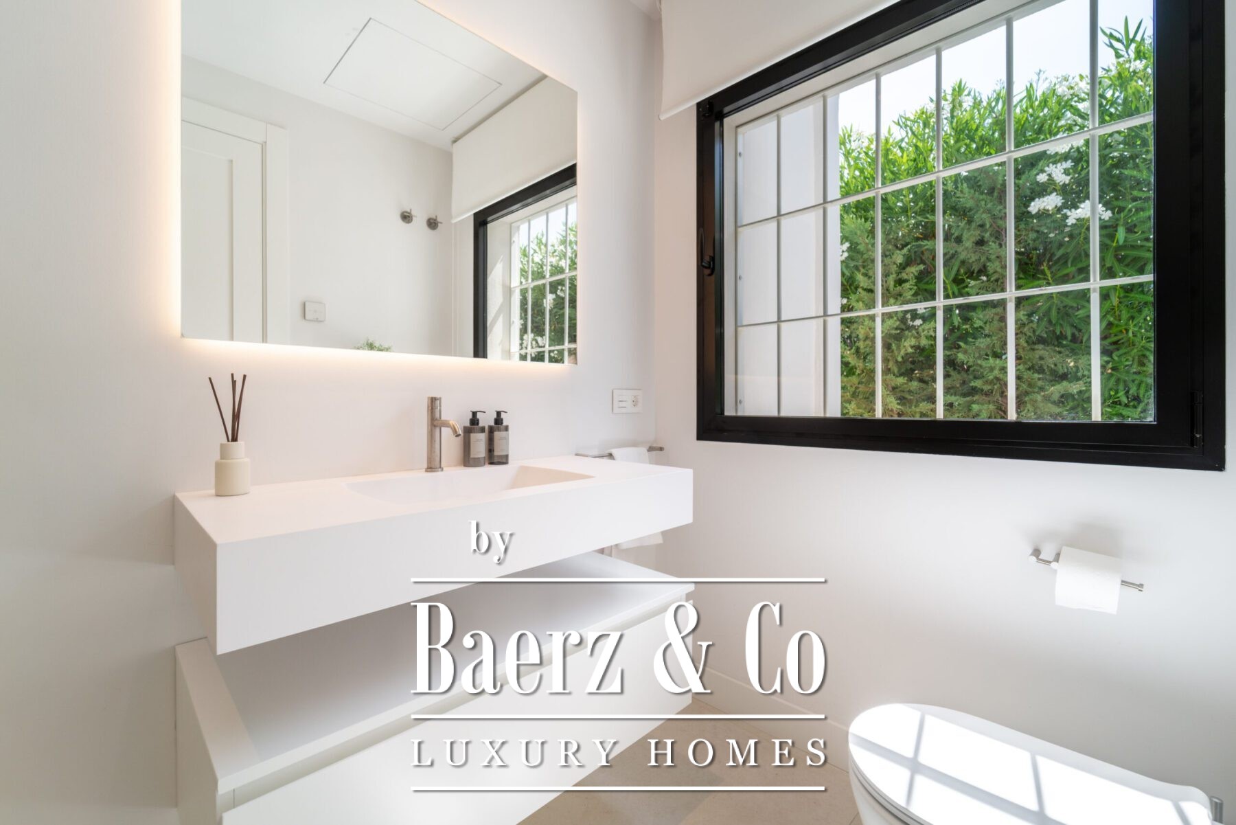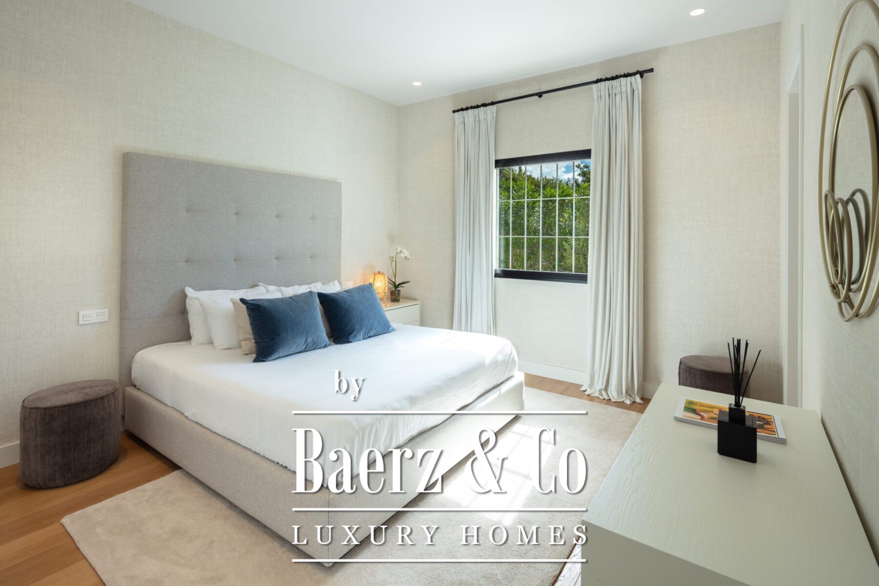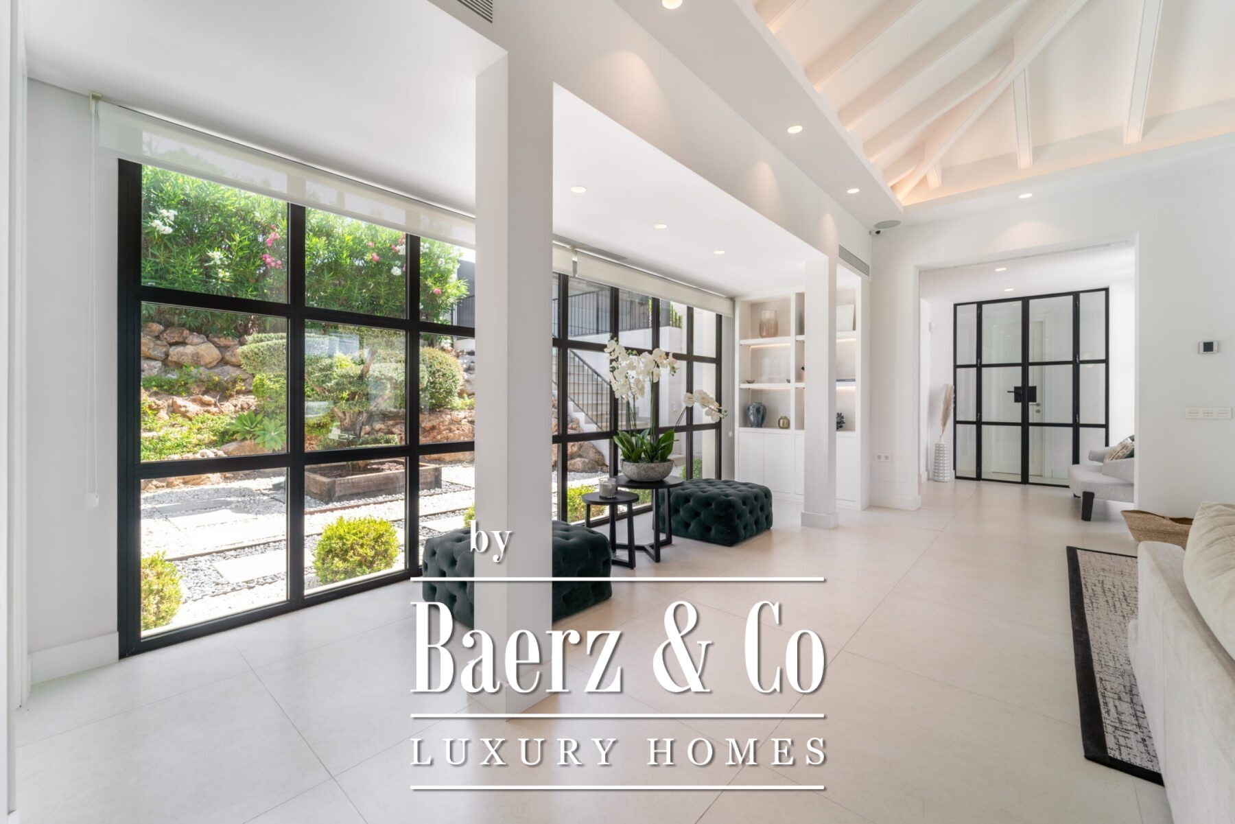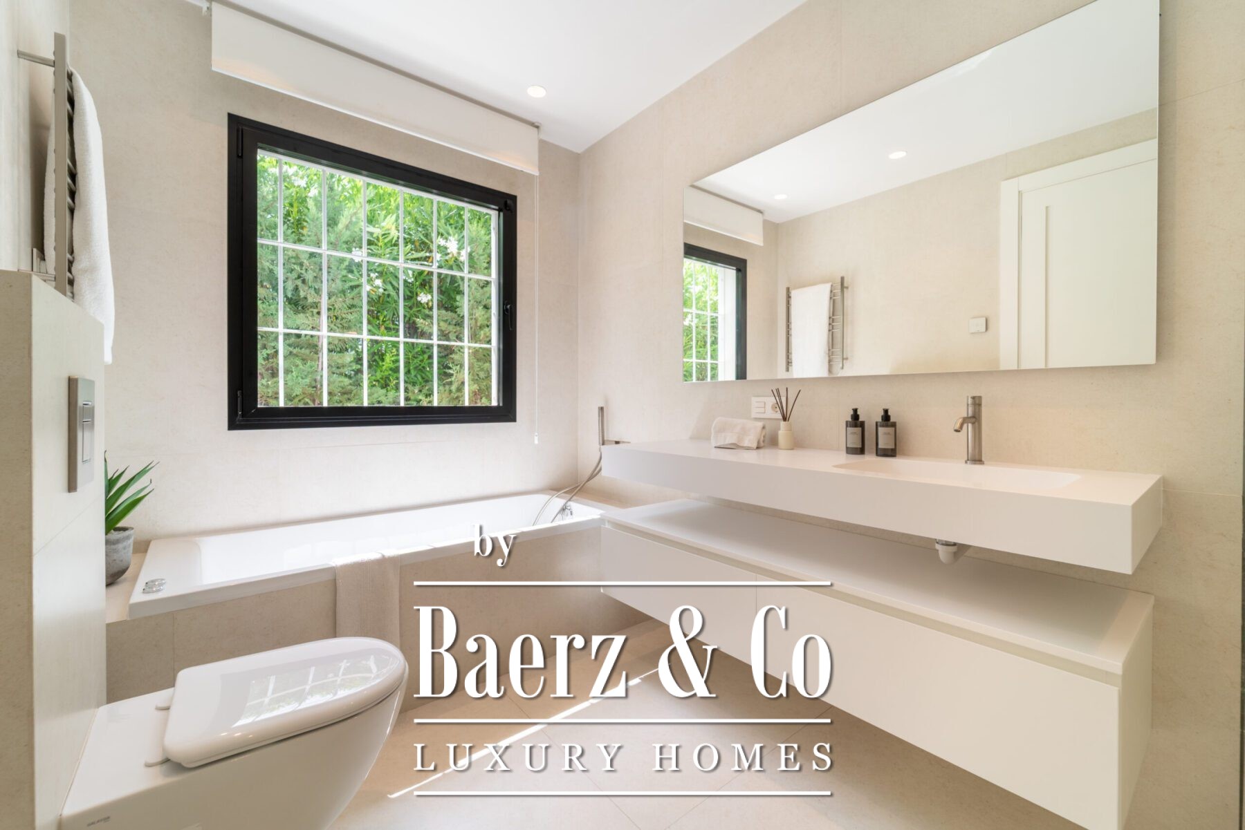The villa welcomes you into a gorgeous courtyard, with the main feature being a large sculped olive tree, and landscaped entrance, with the back drop of large floor to ceiling colonial style black matte windows, allowing the outside to feel inside. Here at the entrance you find the closed Garage space for convenient parking, with then only 12 steps down into the property. As you enter the property you are greeted with a light and spacious hallway which leads you to a bright open plan living area with modern fireplace. The living room is connected to a spacious dining area which sits 8 guests and onto the modern sleek kitchen and breakfast bar, and off this area a large separate utility room . With a double height pitched ceiling in the main living space, the property feels inviting, homely and spacious. Internally the property has underfloor heating throughout, Airzone zonal A/C, and built in Sonos speaker systems. The property has been designed to create as much light and utilise its orientation as possible, and to create a real indoor-outdoor living experience. The villa has been perfectly distributed to offer large bedroom, wardrobe and en-suite bathroom space, in each of the rooms, tastefully done with the use of Casamance wallpaper and wooden flooring and modern sleek bathrooms. The master bedroom is especially well executed with its double height pitched ceilings and two double terrace doors, leading out into the garden and pool area which offers bright, green views.