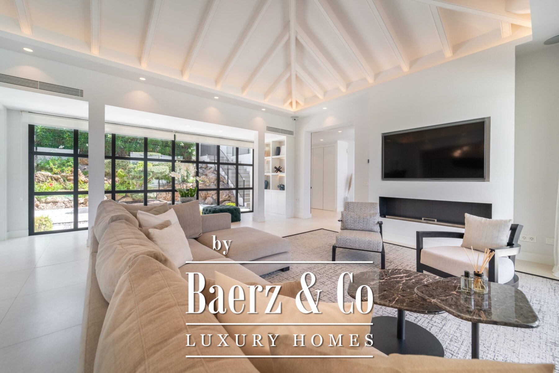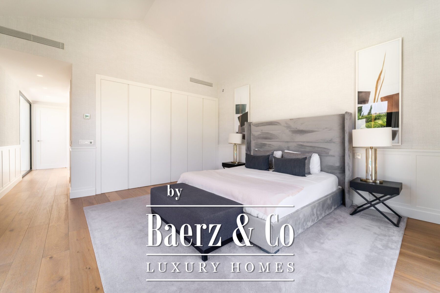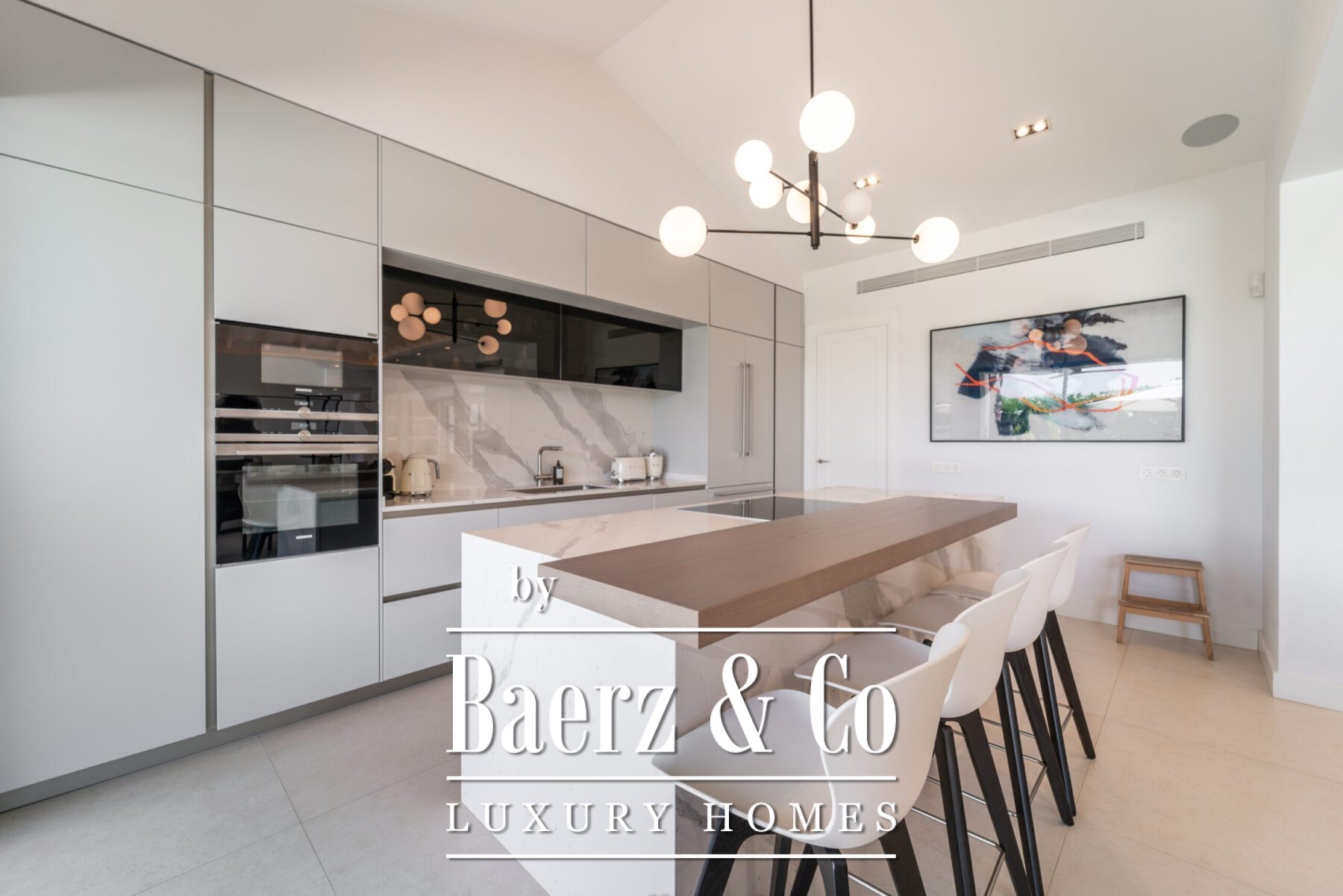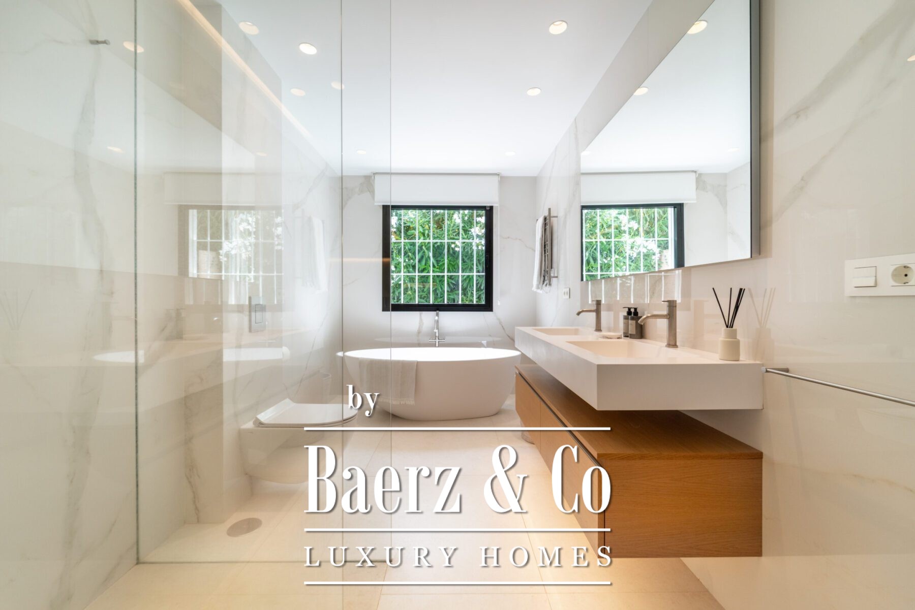 The villa welcomes you into a gorgeous courtyard, with the main feature being a large sculped olive tree, and landscaped entrance, with the back drop of large floor to ceiling colonial style black matte windows, allowing the outside to feel inside. Here at the entrance you find the closed Garage space for convenient parking, with then only 12 steps down into the property. As you enter the property you are greeted with a light and spacious hallway which leads you to a bright open plan living area with modern fireplace. The living room is connected to a spacious dining area which sits 8 guests and onto the modern sleek kitchen and breakfast bar, and off this area a large separate utility room . With a double height pitched ceiling in the main living space, the property feels inviting, homely and spacious. Internally the property has underfloor heating throughout, Airzone zonal A/C, and built in Sonos speaker systems. The property has been designed to create as much light and utilise its orientation as possible, and to create a real indoor-outdoor living experience. The villa has been perfectly distributed to offer large bedroom, wardrobe and en-suite bathroom space, in each of the rooms, tastefully done with the use of Casamance wallpaper and wooden flooring and modern sleek bathrooms. The master bedroom is especially well executed with its double height pitched ceilings and two double terrace doors, leading out into the garden and pool area which offers bright, green views.