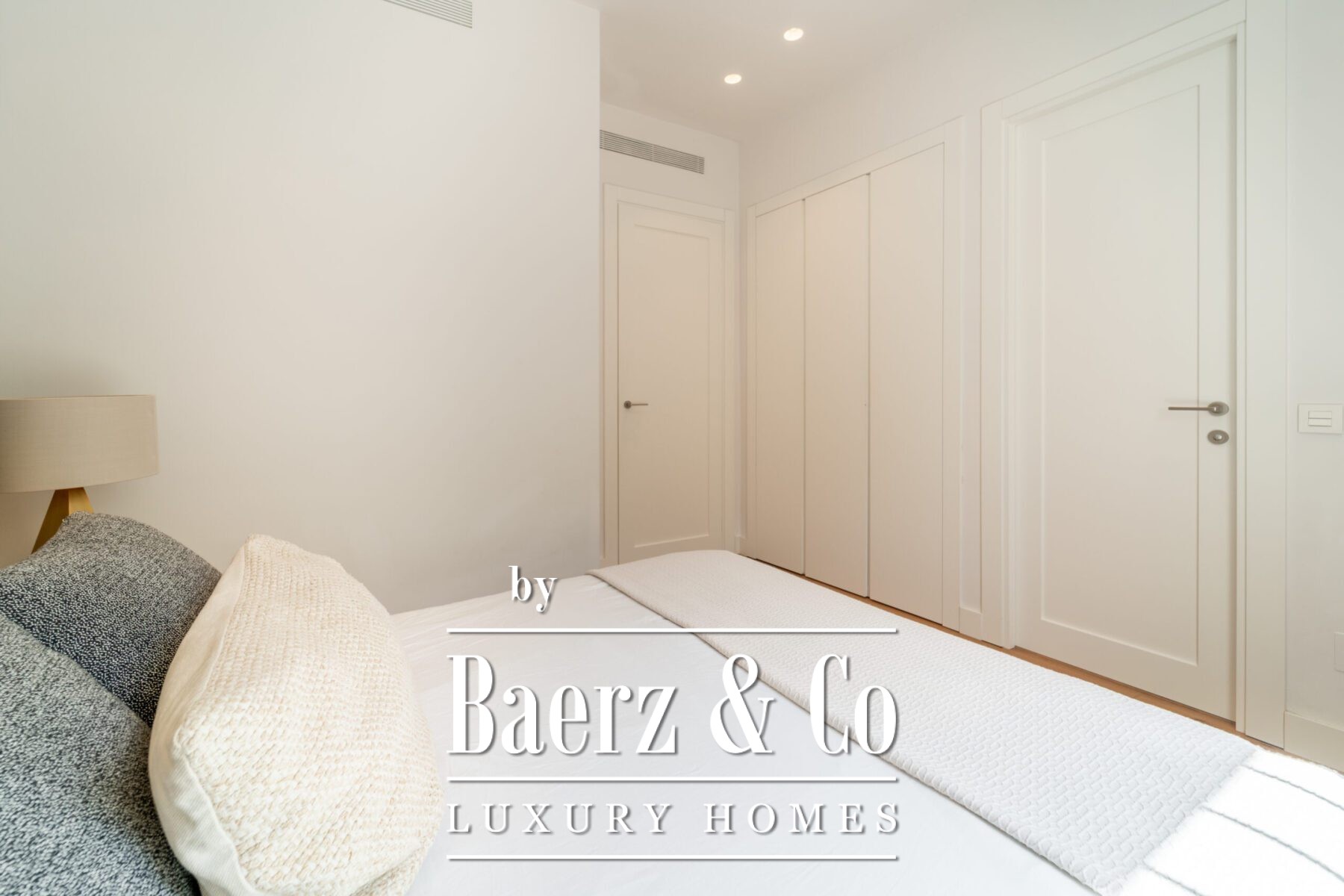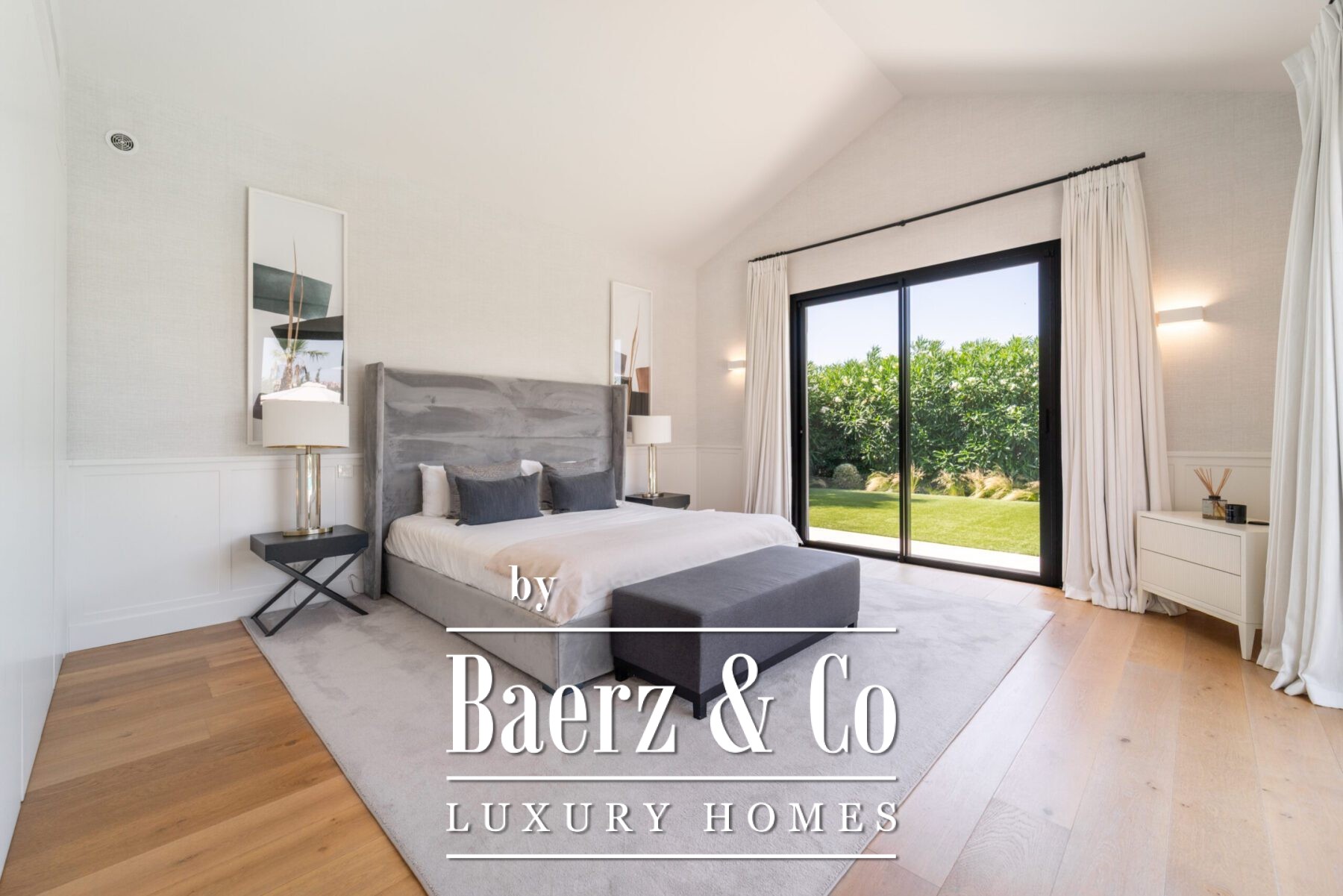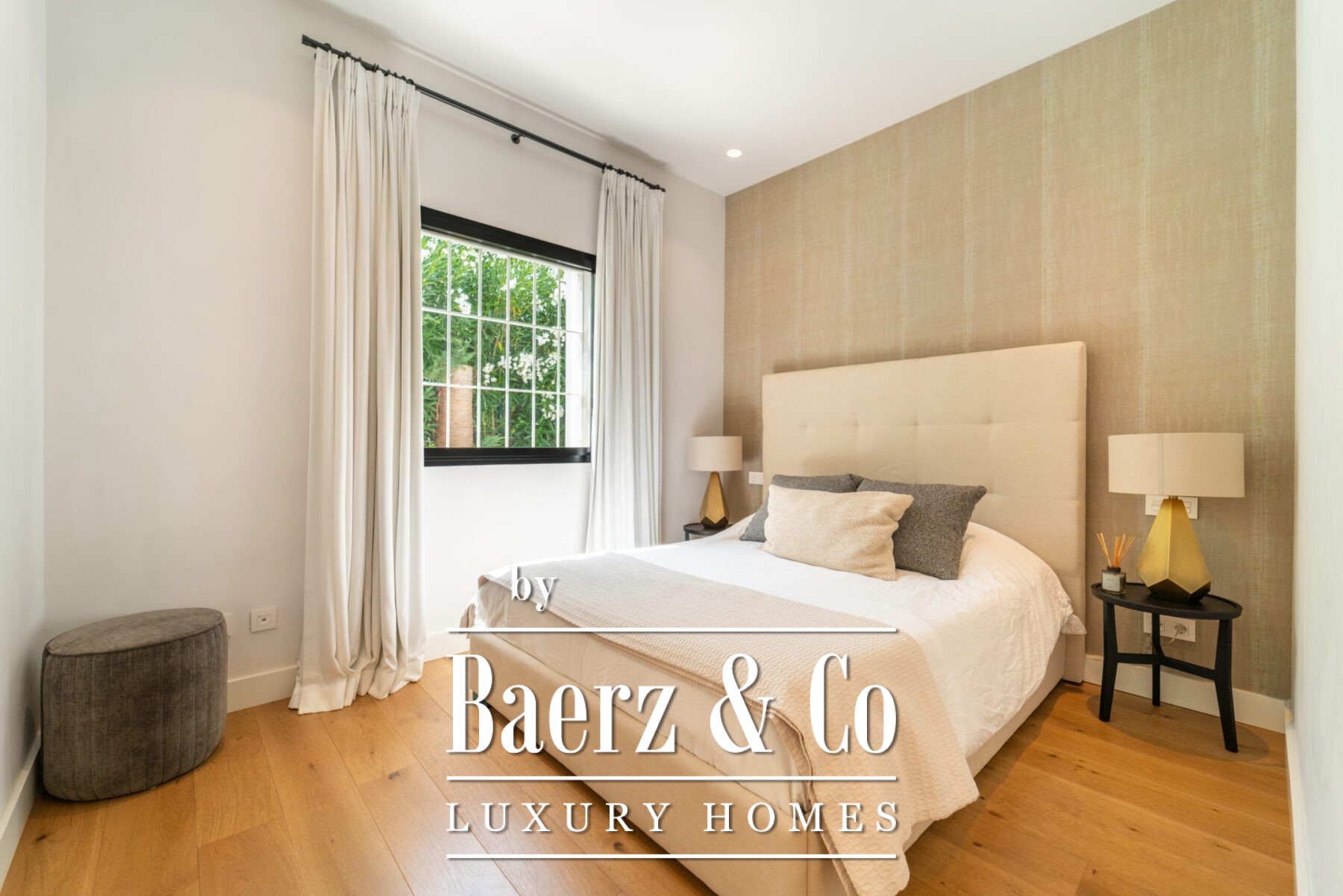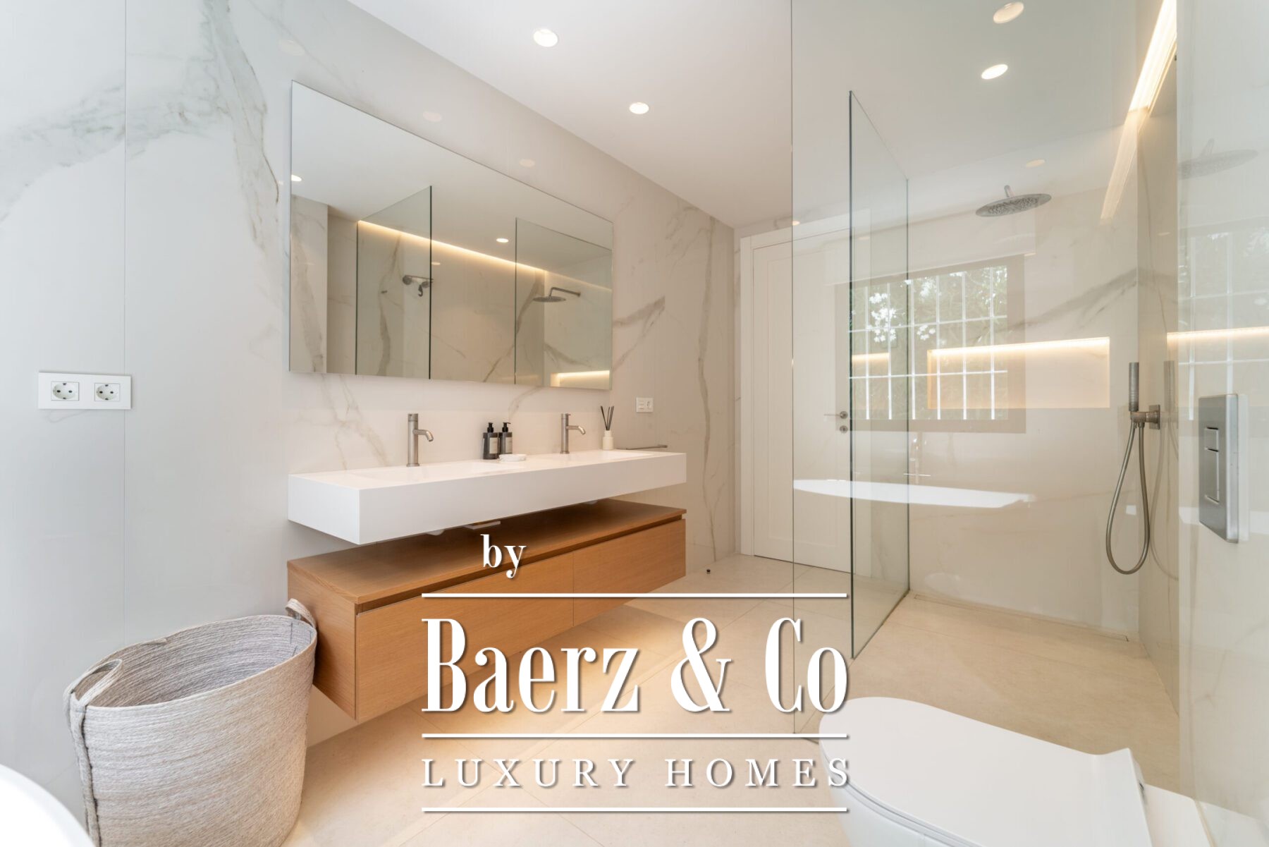 The villa welcomes you into a gorgeous courtyard, with the main feature being a large sculped olive tree, and landscaped entrance, with the back drop of large floor to ceiling colonial style black matte windows, allowing the outside to feel inside. Here at the entrance you find the closed Garage space for convenient parking, with then only 12 steps down into the property. As you enter the property you are greeted with a light and spacious hallway which leads you to a bright open plan living area with modern fireplace. The living room is connected to a spacious dining area which sits 8 guests and onto the modern sleek kitchen and breakfast bar, and off this area a large separate utility room . With a double height pitched ceiling in the main living space, the property feels inviting, homely and spacious. Internally the property has underfloor heating throughout, Airzone zonal A/C, and built in Sonos speaker systems. The property has been designed to create as much light and utilise its orientation as possible, and to create a real indoor-outdoor living experience. The villa has been perfectly distributed to offer large bedroom, wardrobe and en-suite bathroom space, in each of the rooms, tastefully done with the use of Casamance wallpaper and wooden flooring and modern sleek bathrooms. The master bedroom is especially well executed with its double height pitched ceilings and two double terrace doors, leading out into the garden and pool area which offers bright, green views.